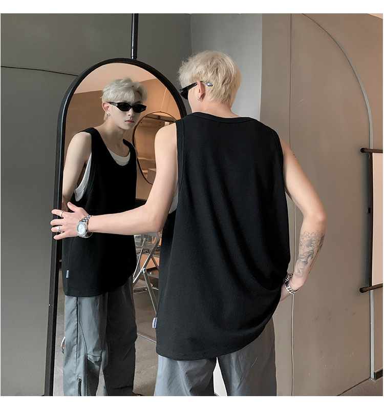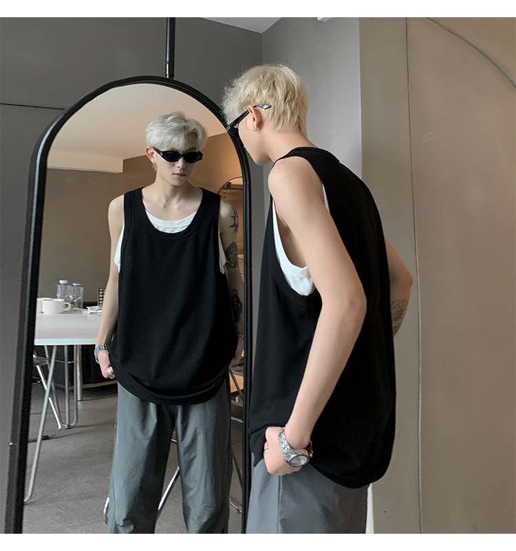 미국식 가짜 투피스 조끼 남자 패셔너블 여름 중량형 솔리드 컬러 민소매 티셔츠 느슨하고 잘 생긴 스포츠 왁스 코트스토어 가기