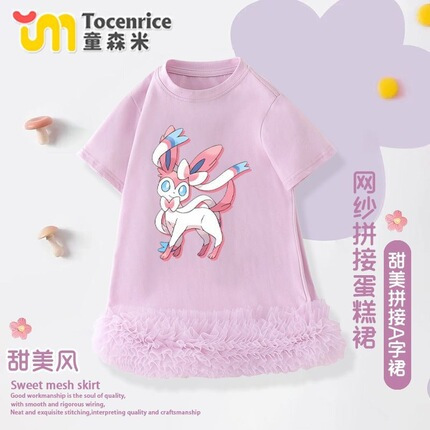 Mofusand 고양이 소녀의 크루 넥 티셔츠 여름 원피스 큰 어린이 원피스 서양식 유행 소녀의 탑