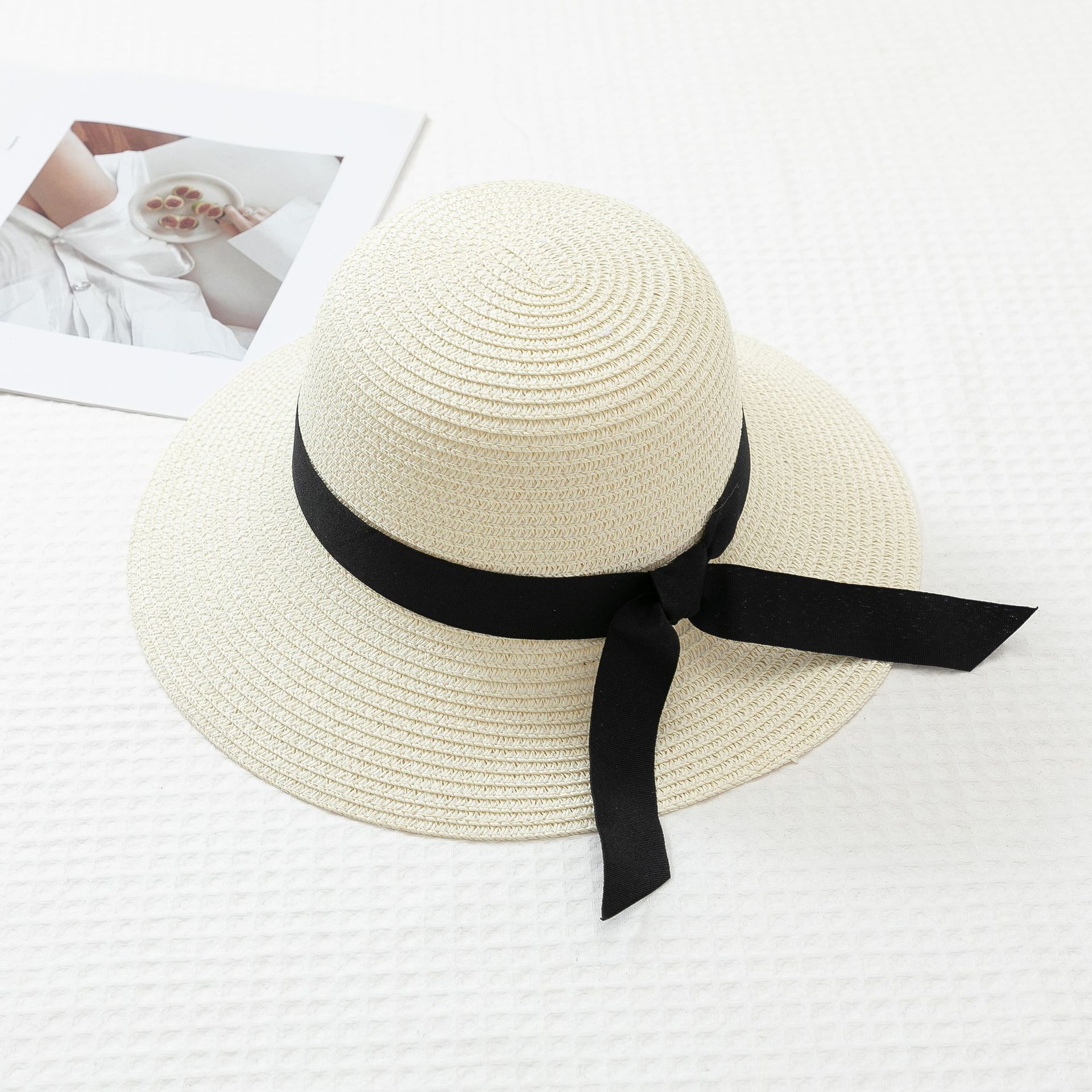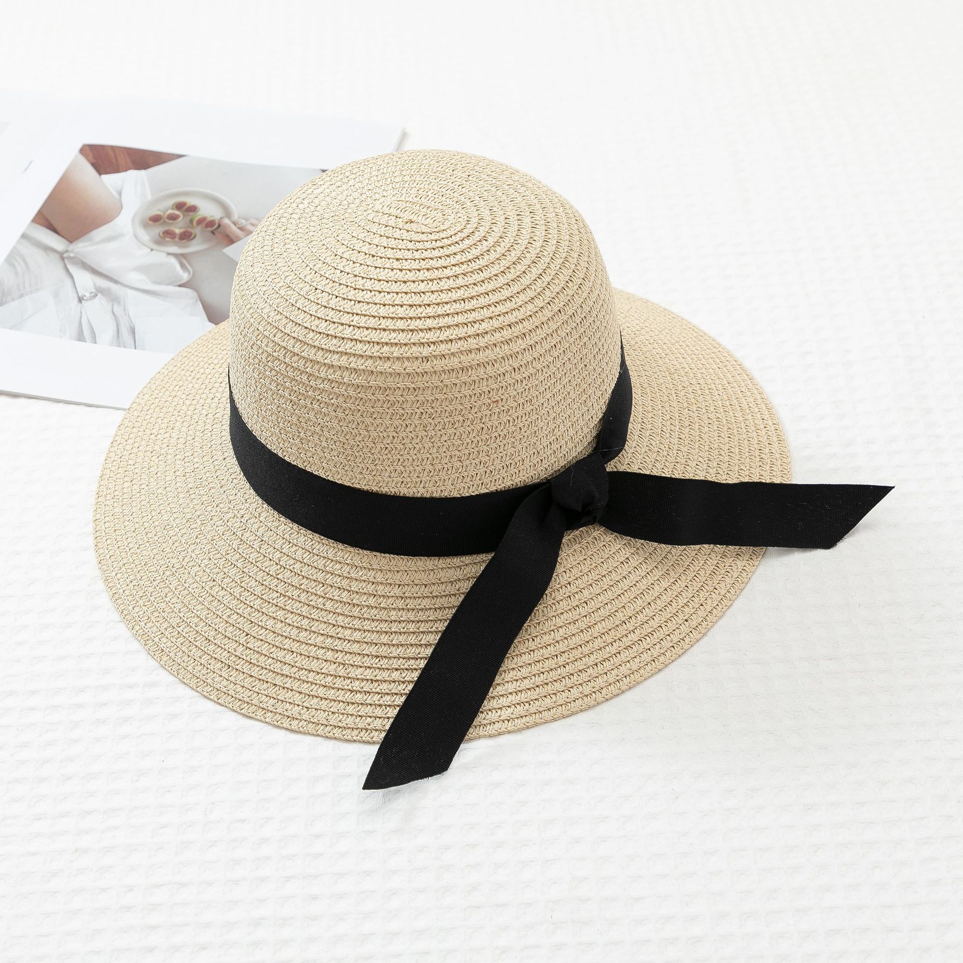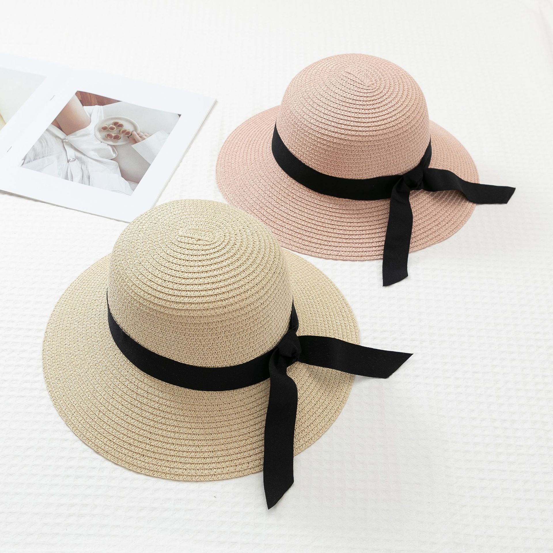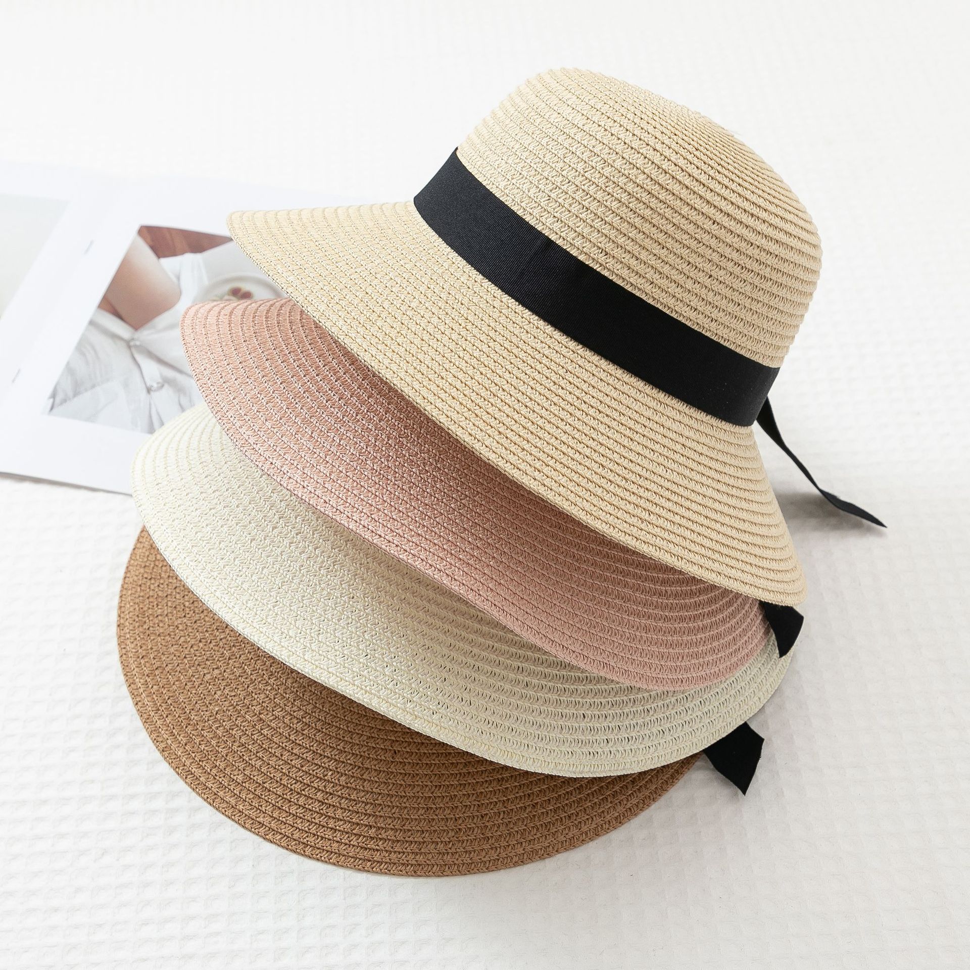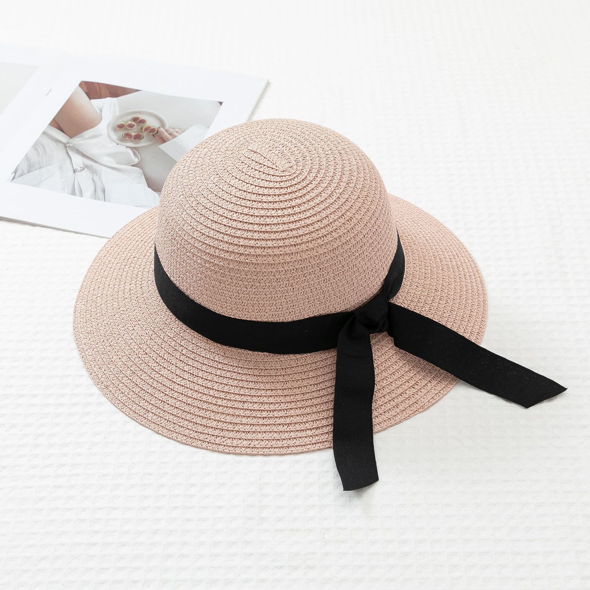 작은 신선한 일본 스타일 햇빛 분지 모자 간단한 스트랩 활 밀짚 모자 여성의 여름 나들이 큰 브림 쿨 모자