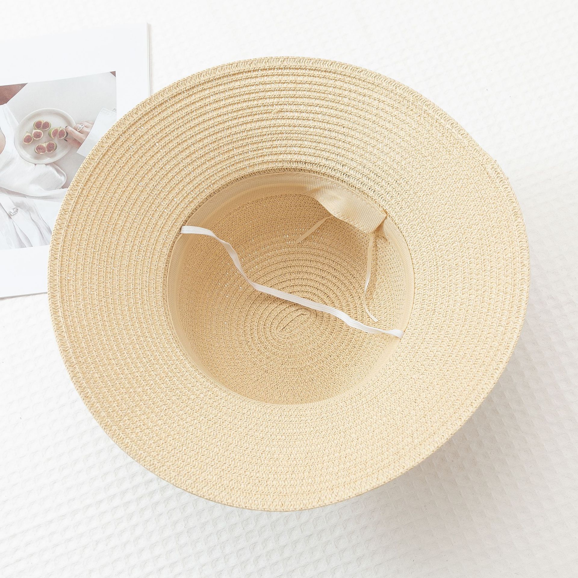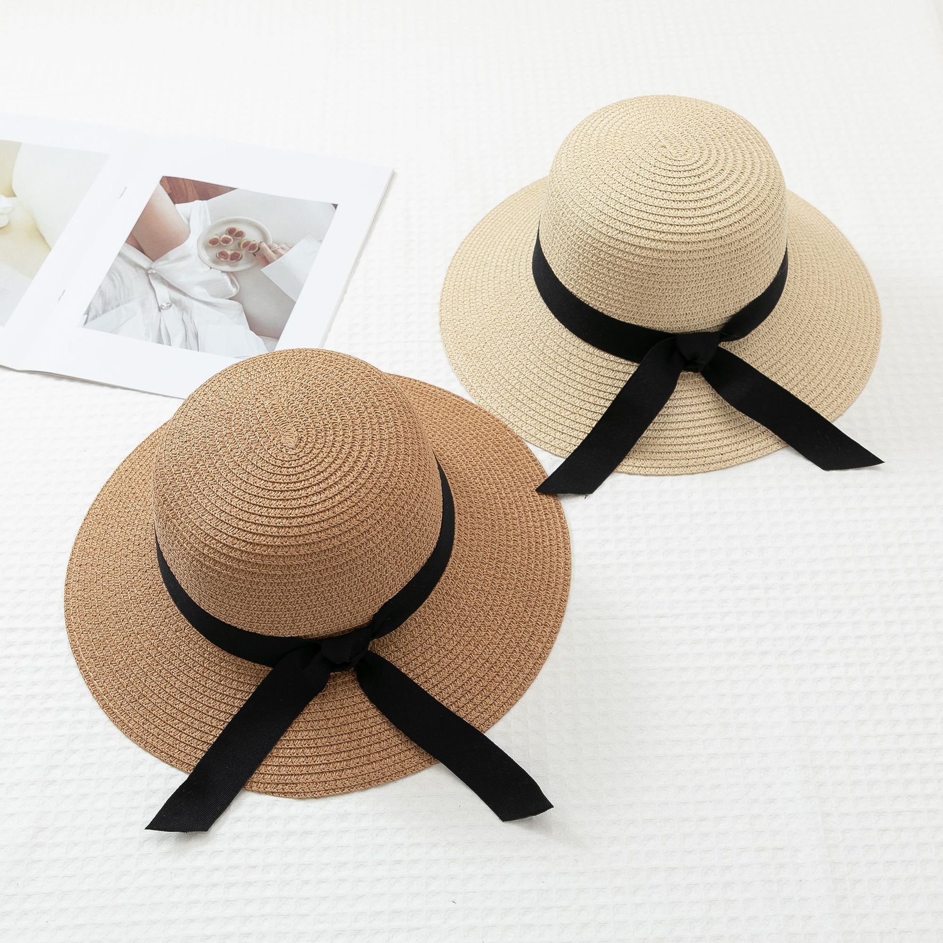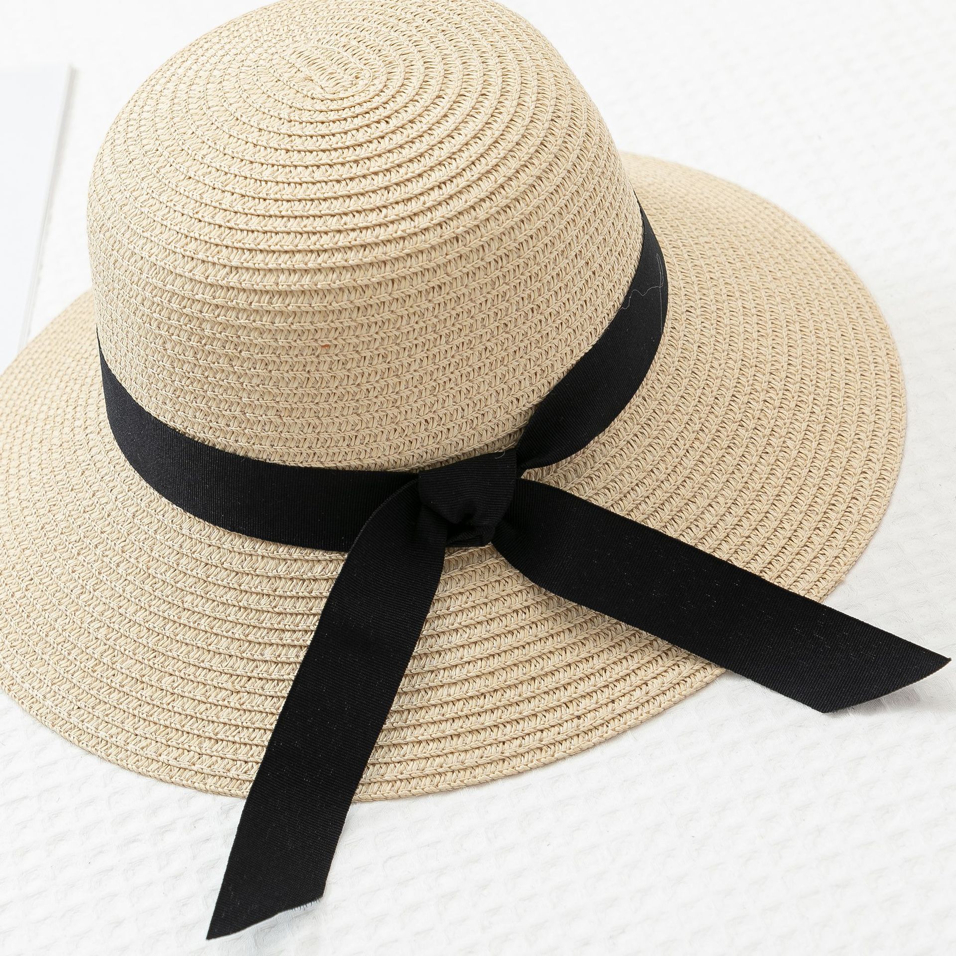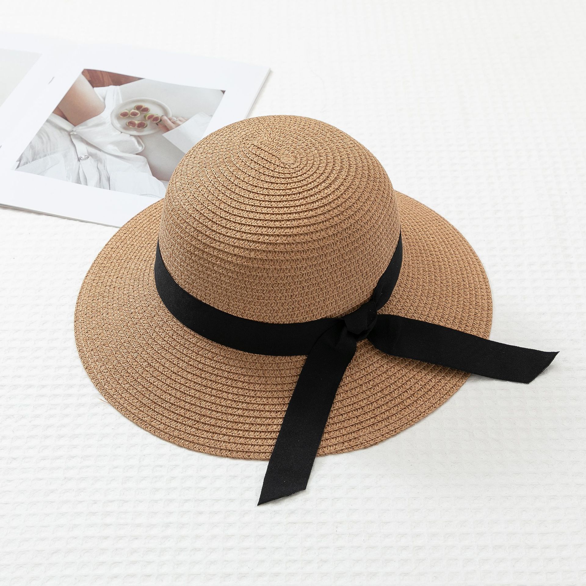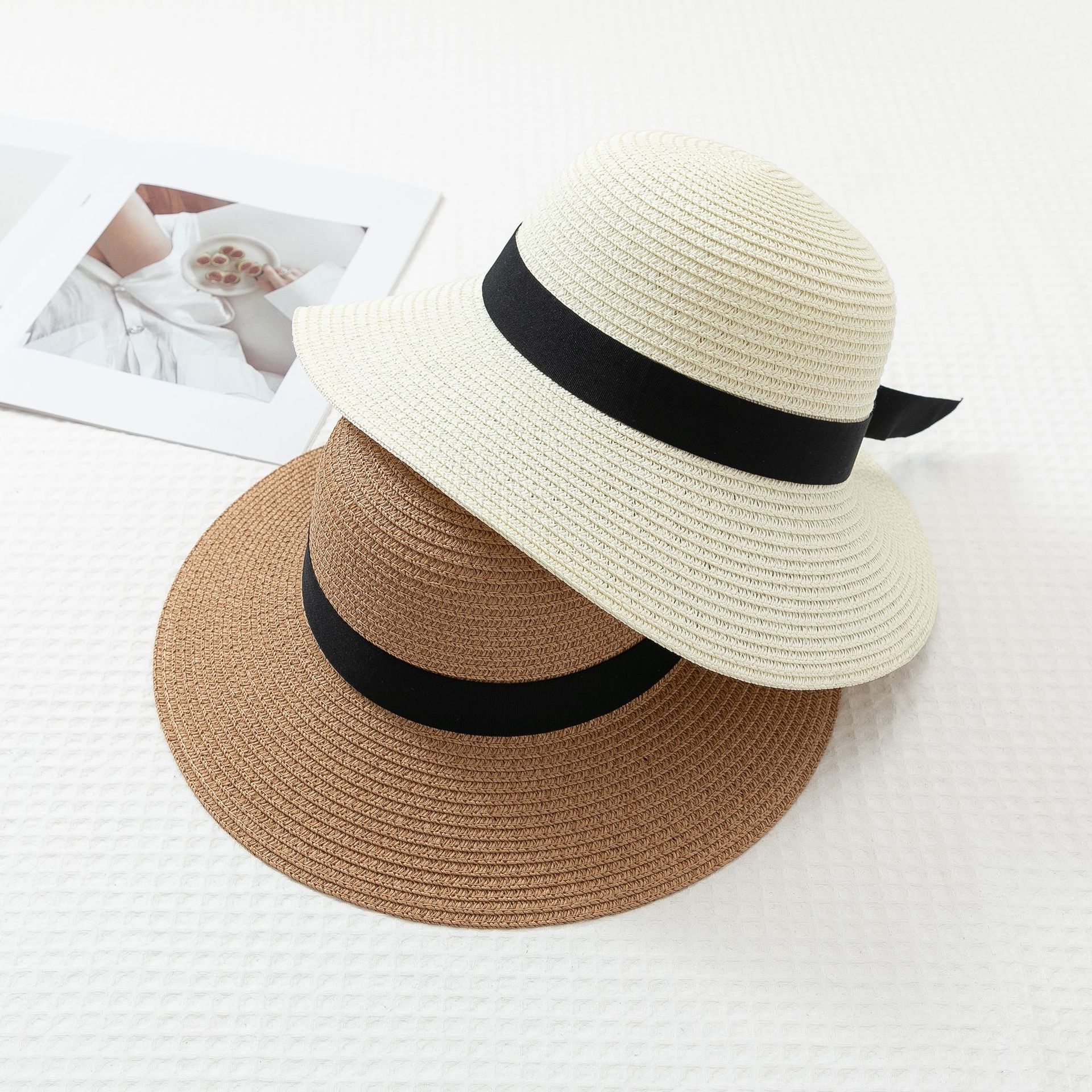 작은 신선한 일본 스타일 햇빛 분지 모자 간단한 스트랩 활 밀짚 모자 여성의 여름 나들이 큰 브림 쿨 모자