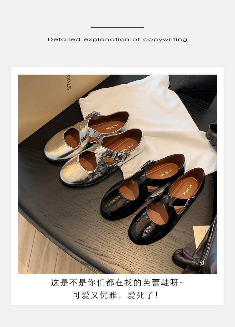 양가죽 그레이프맘 같은 스타일의 크로스 스트랩 실버 라운드 토 가죽 메리제인 슈즈, 얕은 입구 플랫 솔, 출퇴근용, 패셔너블하고 다재다능합니다.스토어 가기