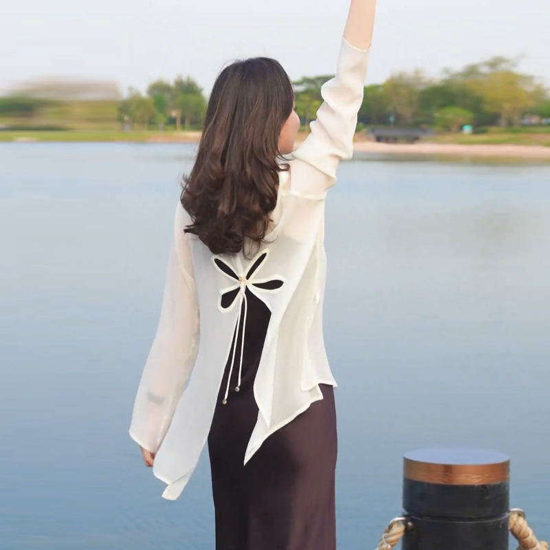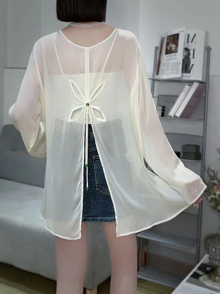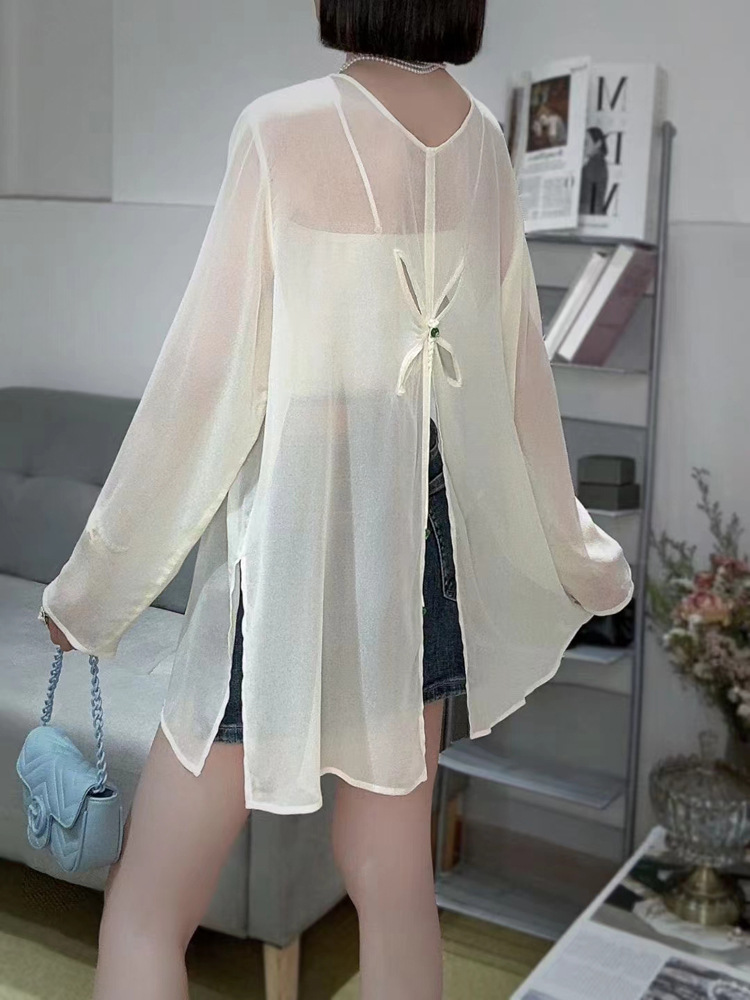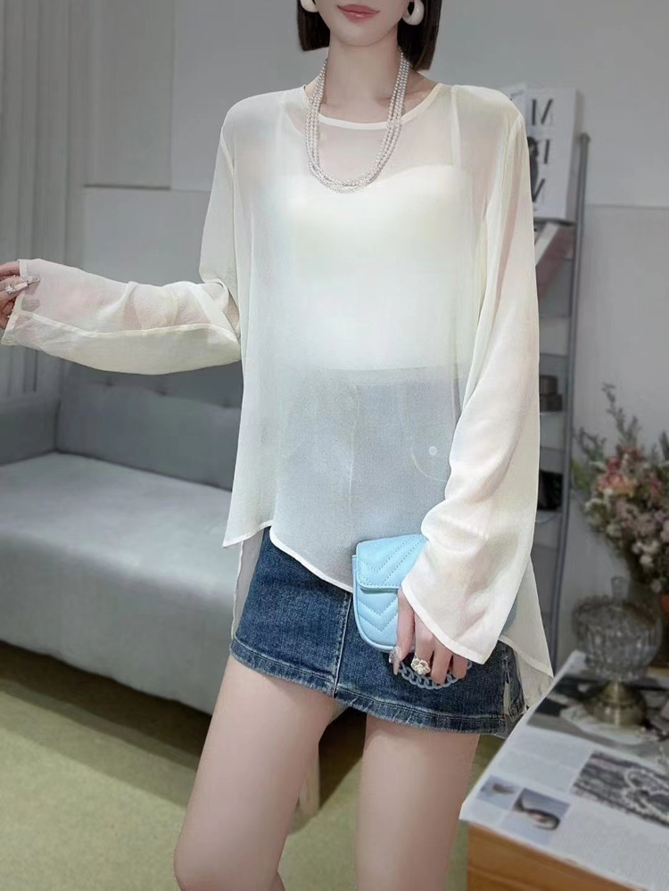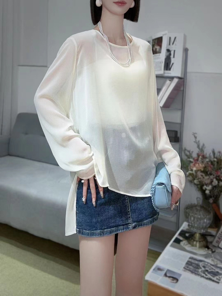 오리지널 디자인 센스 2024 여름 착용 얇은 간단한 원근법 느슨한 올매치 긴소매 쉬폰 선크림 셔츠 섹시한 탑스토어 가기