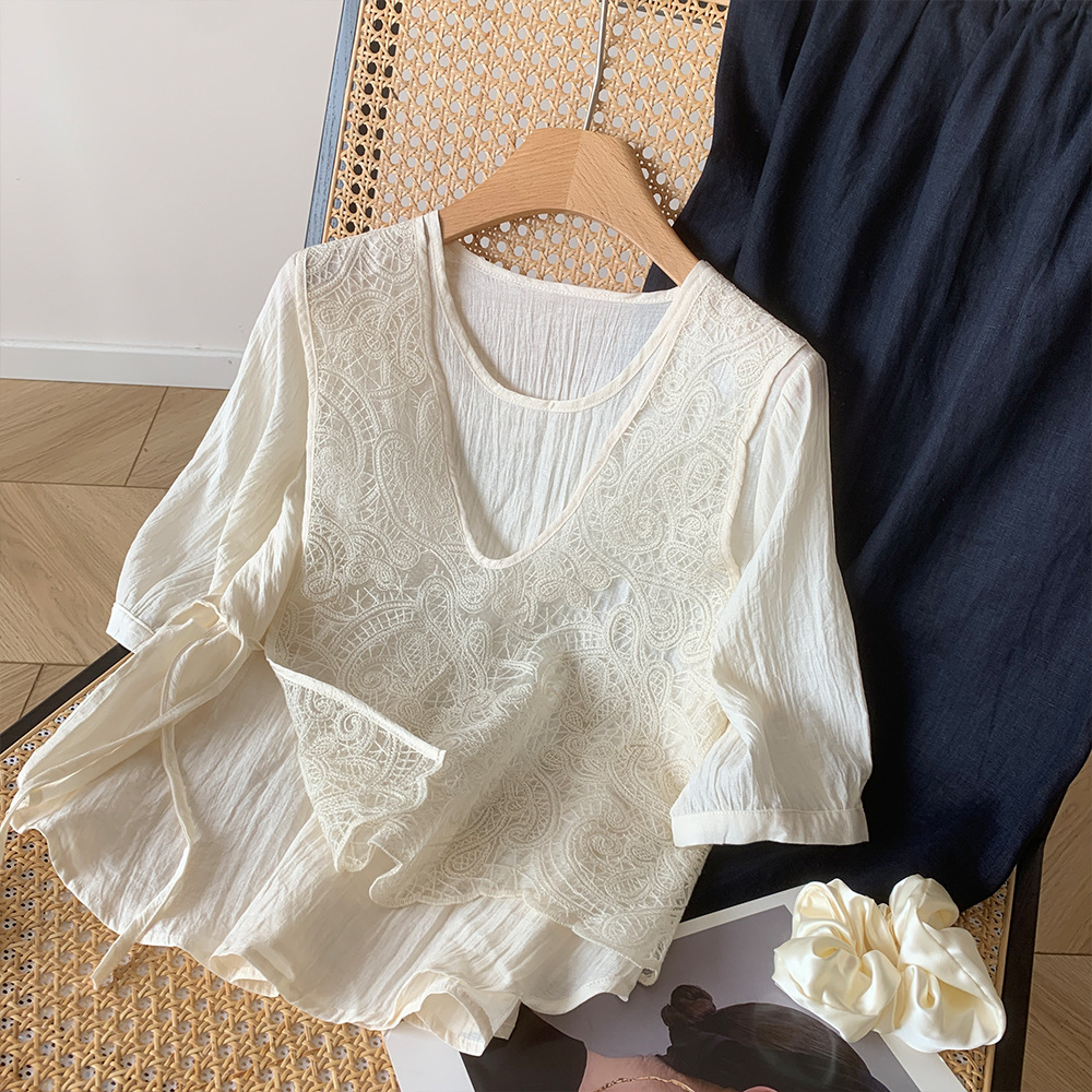 레이스 바느질 가짜 투피스 쉬폰 셔츠 여성용 반팔 2024 뉴 여름 루즈 하이 엔드 웨스턴 스타일 셔츠 탑스토어 가기