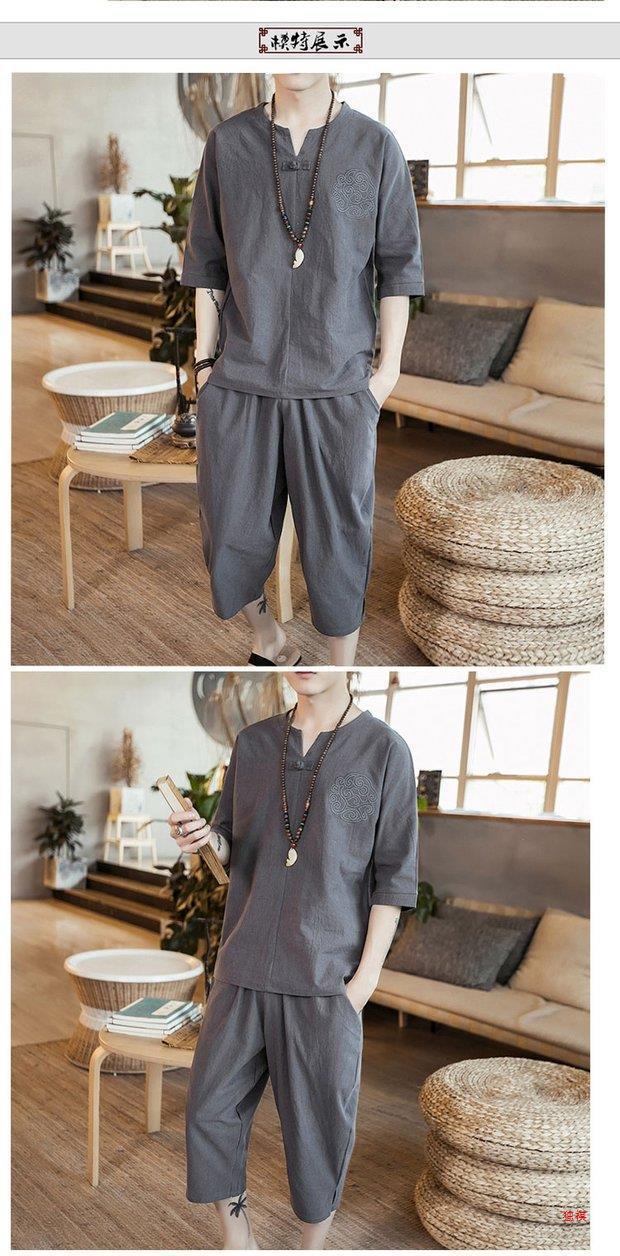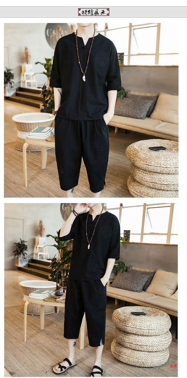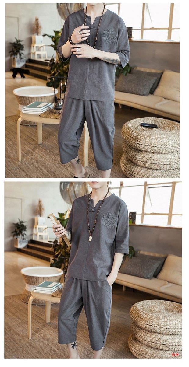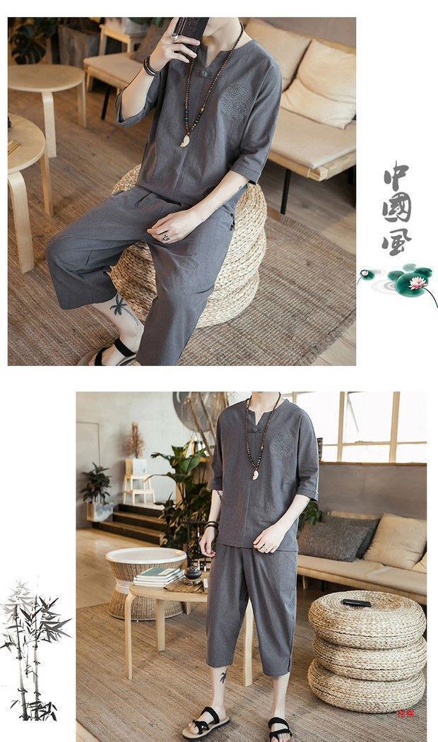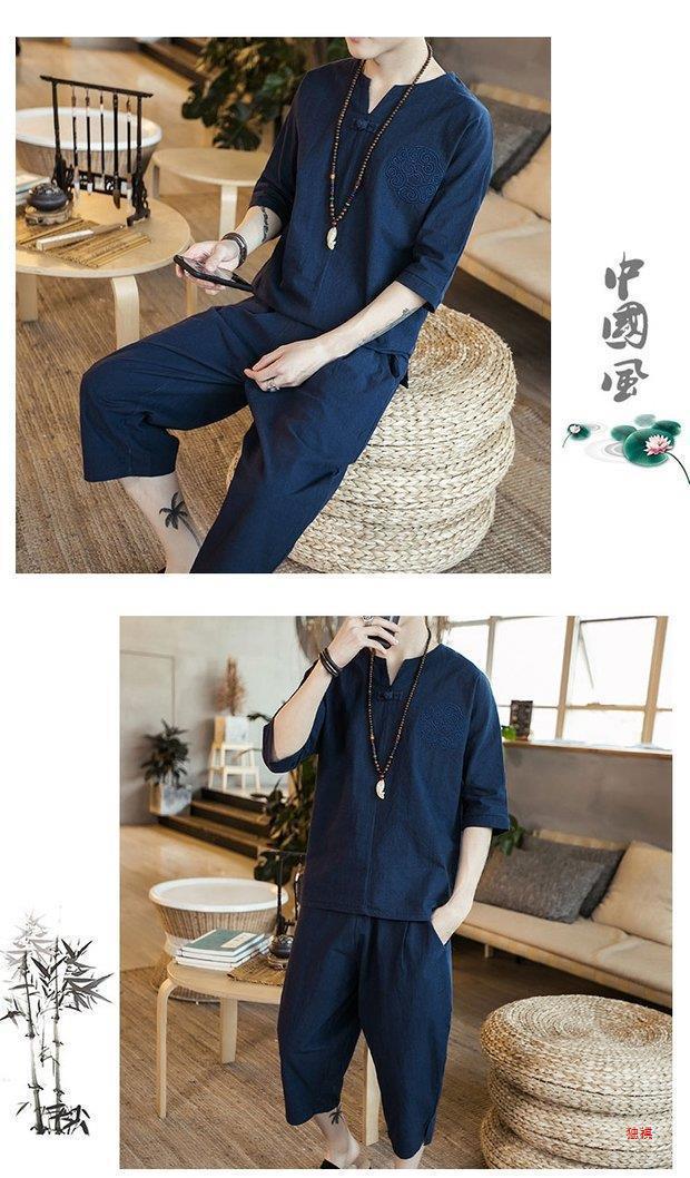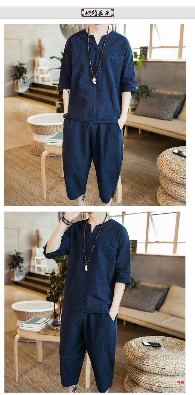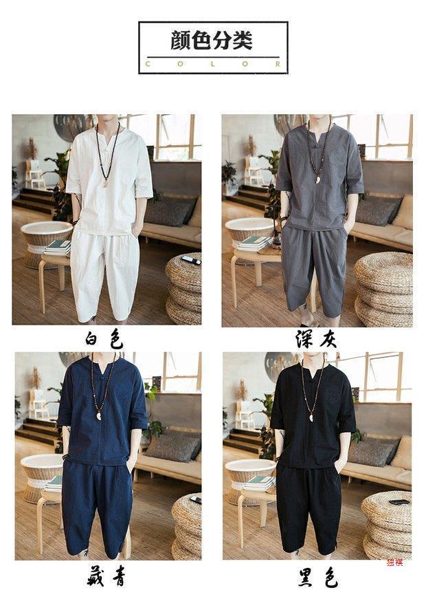중국 스타일 리넨 반팔 잠옷 세트 한푸 남자 버클 탕 세트 코튼 리넨 카프리 바지 홈 의류 루즈 트렌디스토어 가기