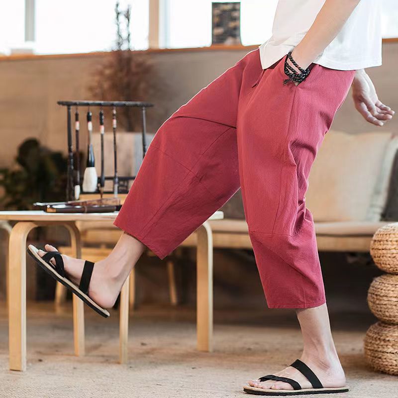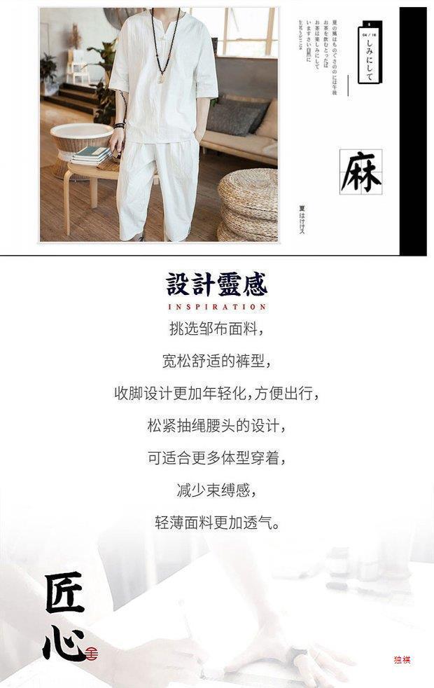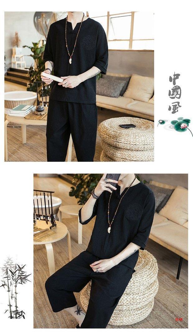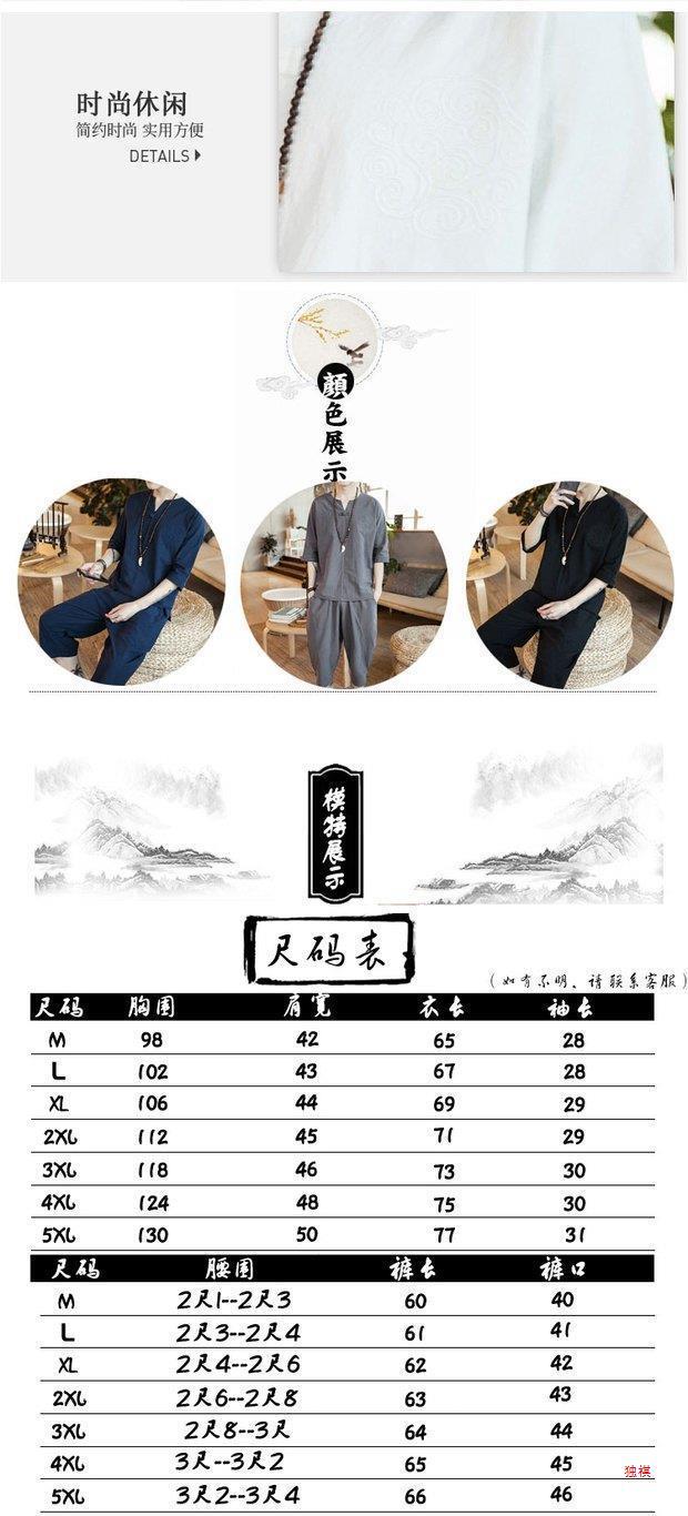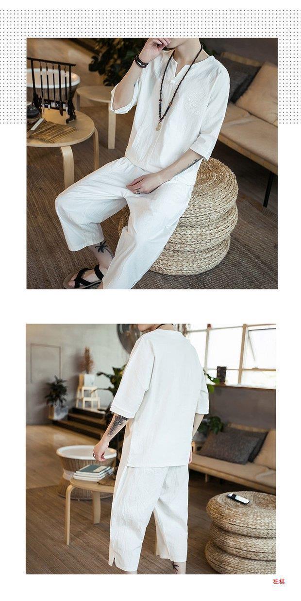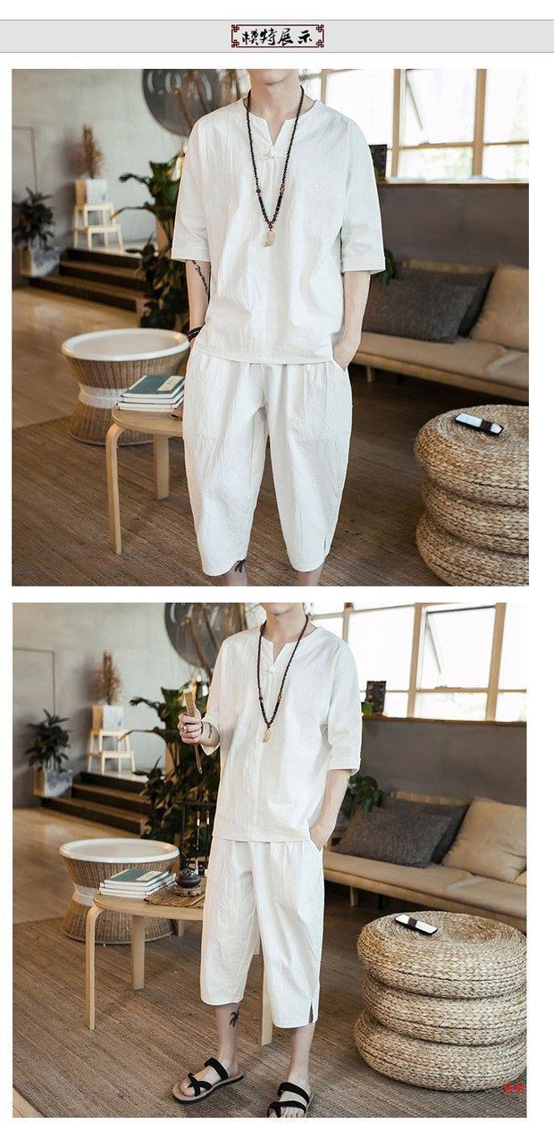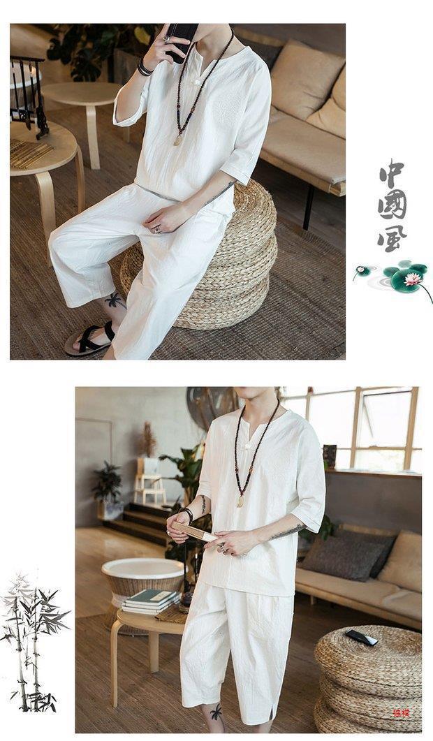 중국 스타일 리넨 반팔 잠옷 세트 한푸 남자 버클 탕 세트 코튼 리넨 카프리 바지 홈 의류 루즈 트렌디스토어 가기