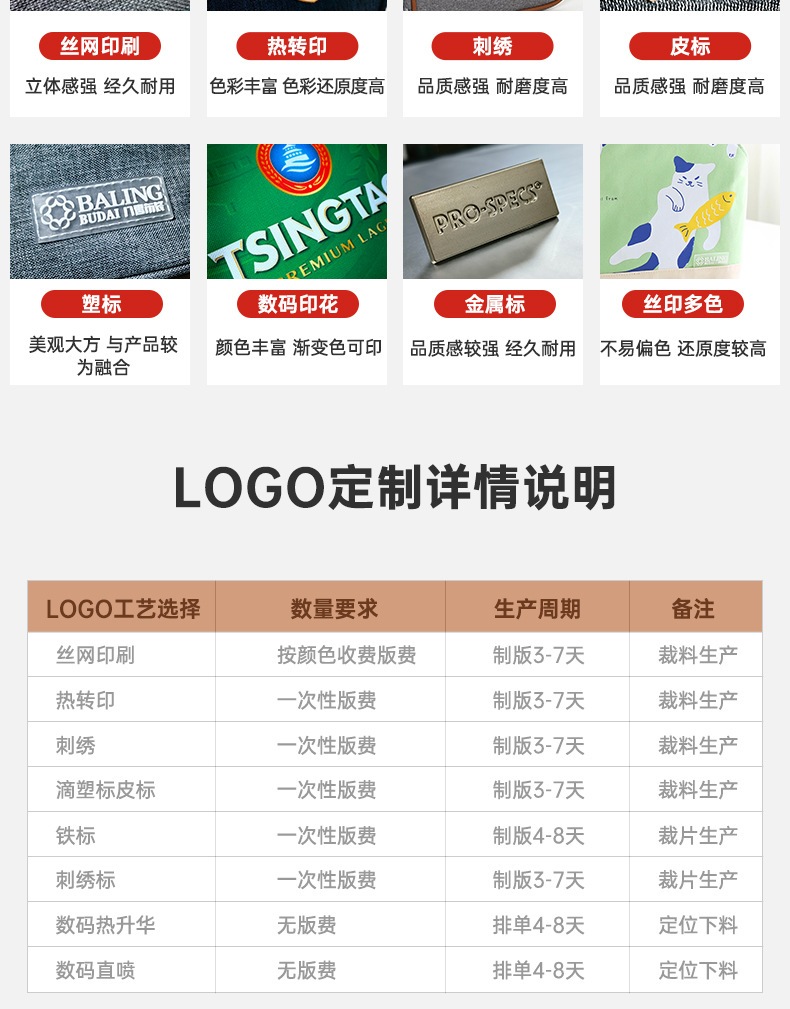 (3) 产品logo可根据客户您的要求进行制作,如压印、烫金、烫银、丝印、热转印、移印等不同做法 。