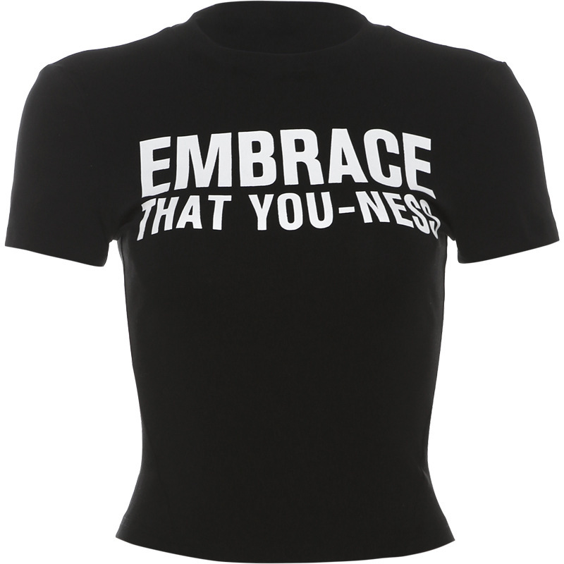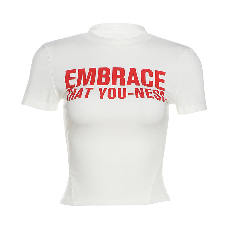 유럽과 미국 스타일 2024 여름 새로운 여성 승무원 편지 인쇄 슬림 핏 타이트 허리 배꼽 단색 통근 티셔츠
