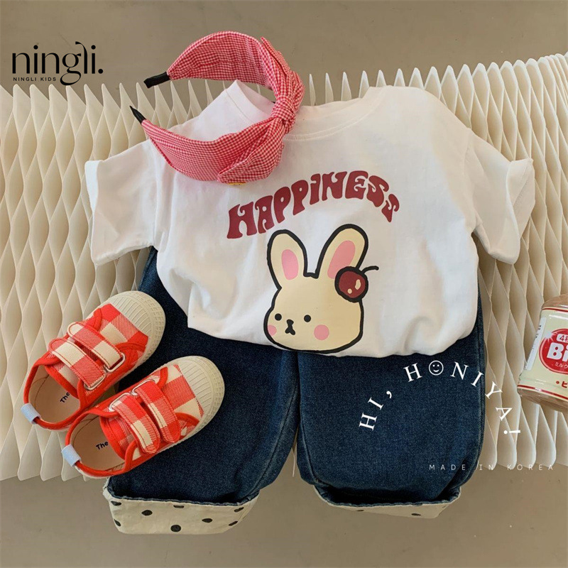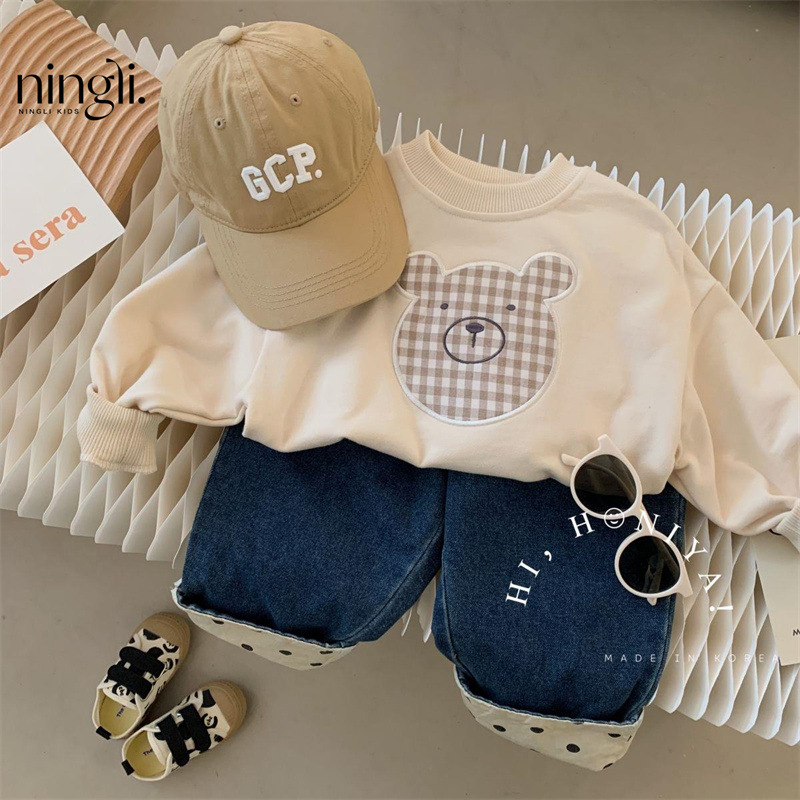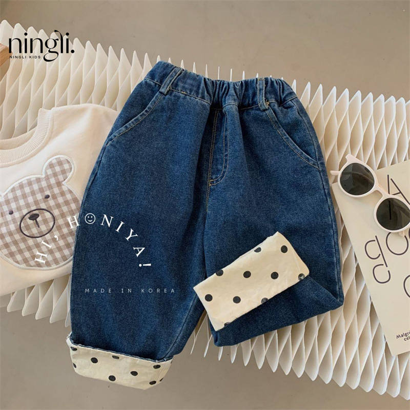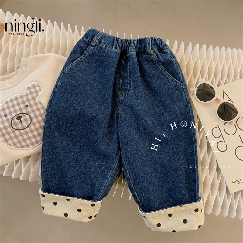 닝리 걸스의 봄과 가을 청바지 중소 소녀 아기 소녀 가을 웨이브 도트 대조 컬러 가장자리 느슨한 단단한 청바지 부드러운 왁스 패션스토어 가기