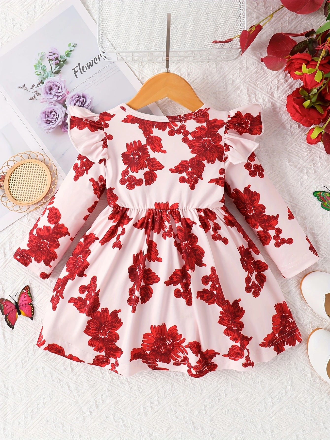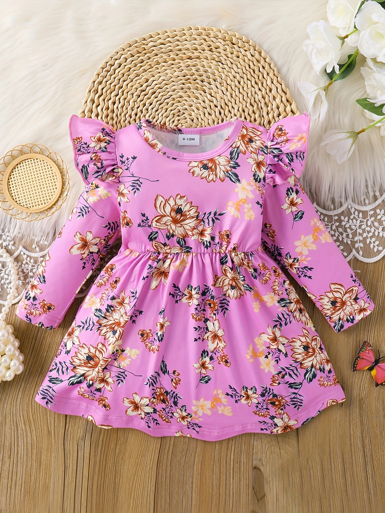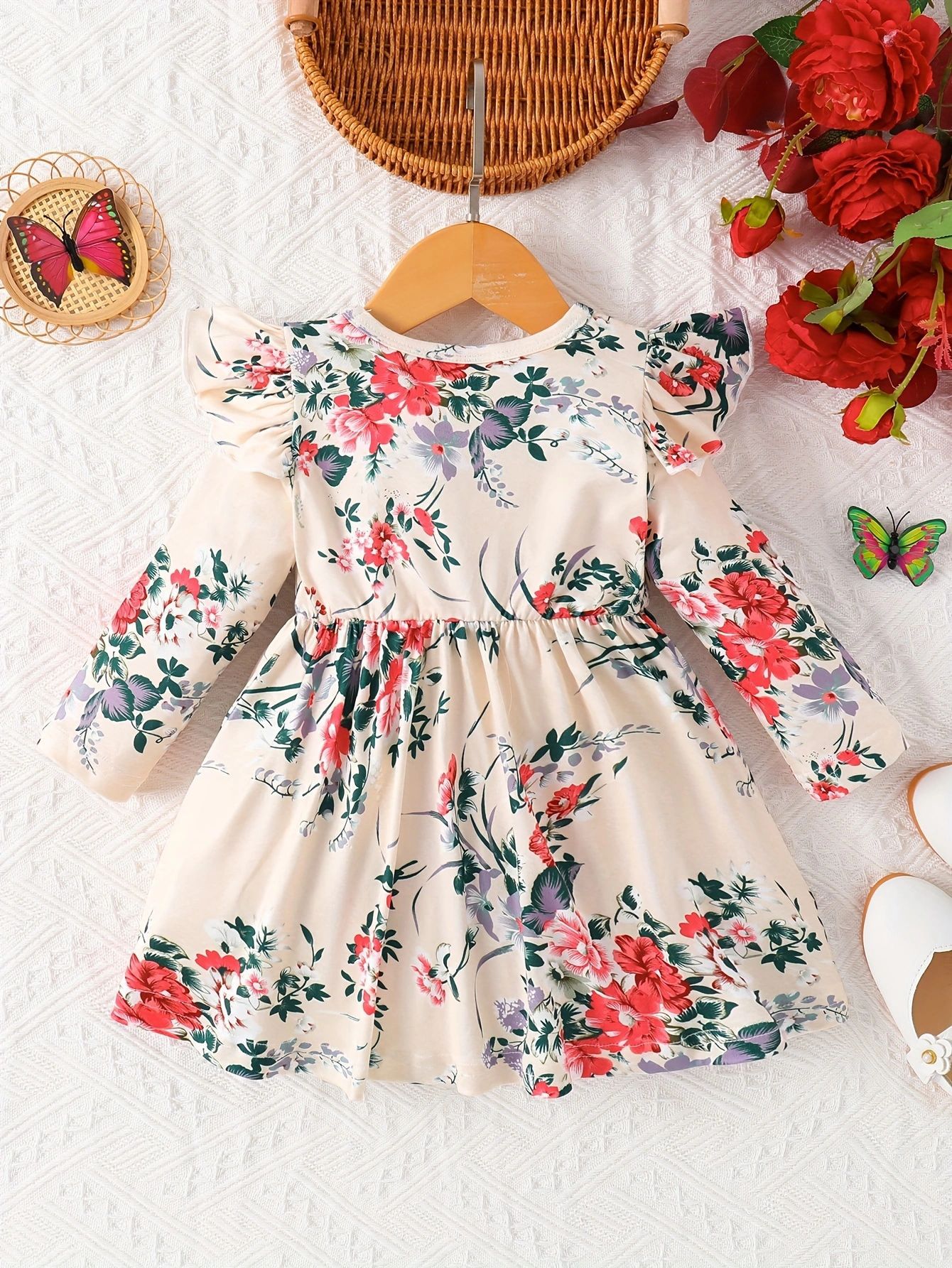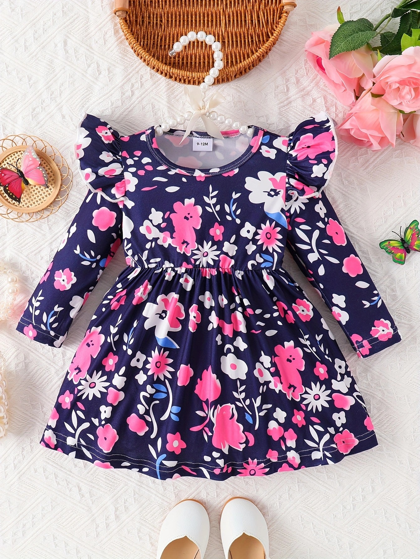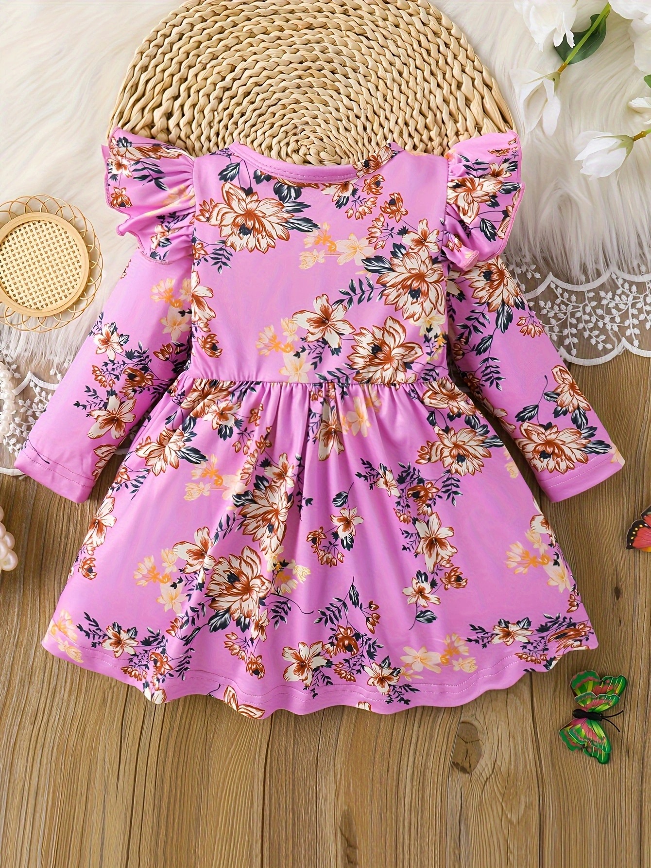 국경 INS 아기 소녀 봄과 가을 둥근 목 터틀넥 플라잉 슬리브 꽃 프린트 긴 소매 원피스 트렌디스토어 가기