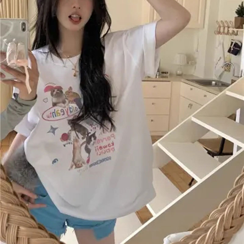2024 년 여름 한국 스타일 새로운 반팔 티셔츠 여성 느슨한 캐주얼 올 매치 어깨 슬리밍 탑
