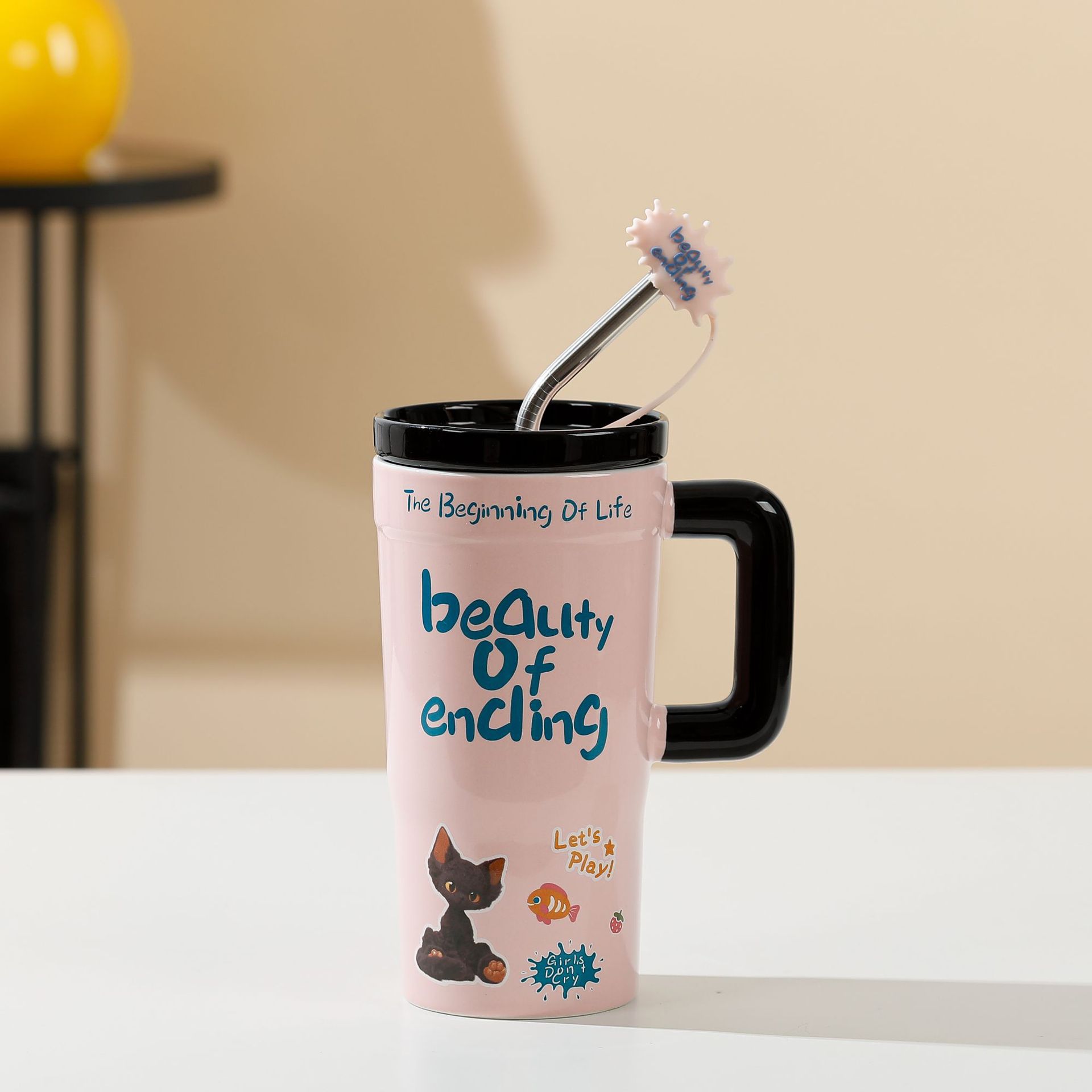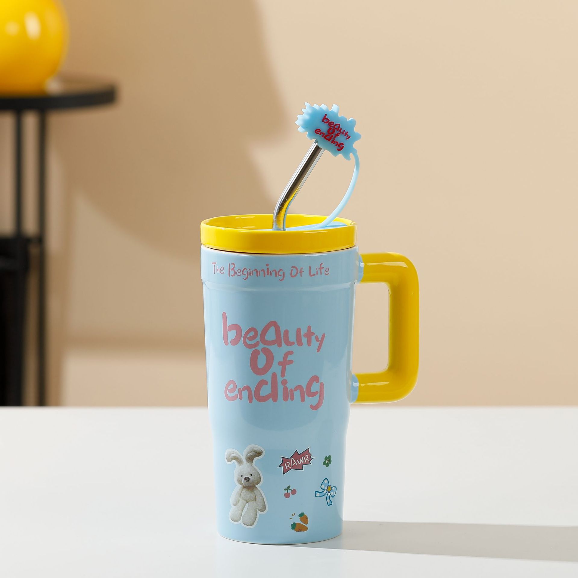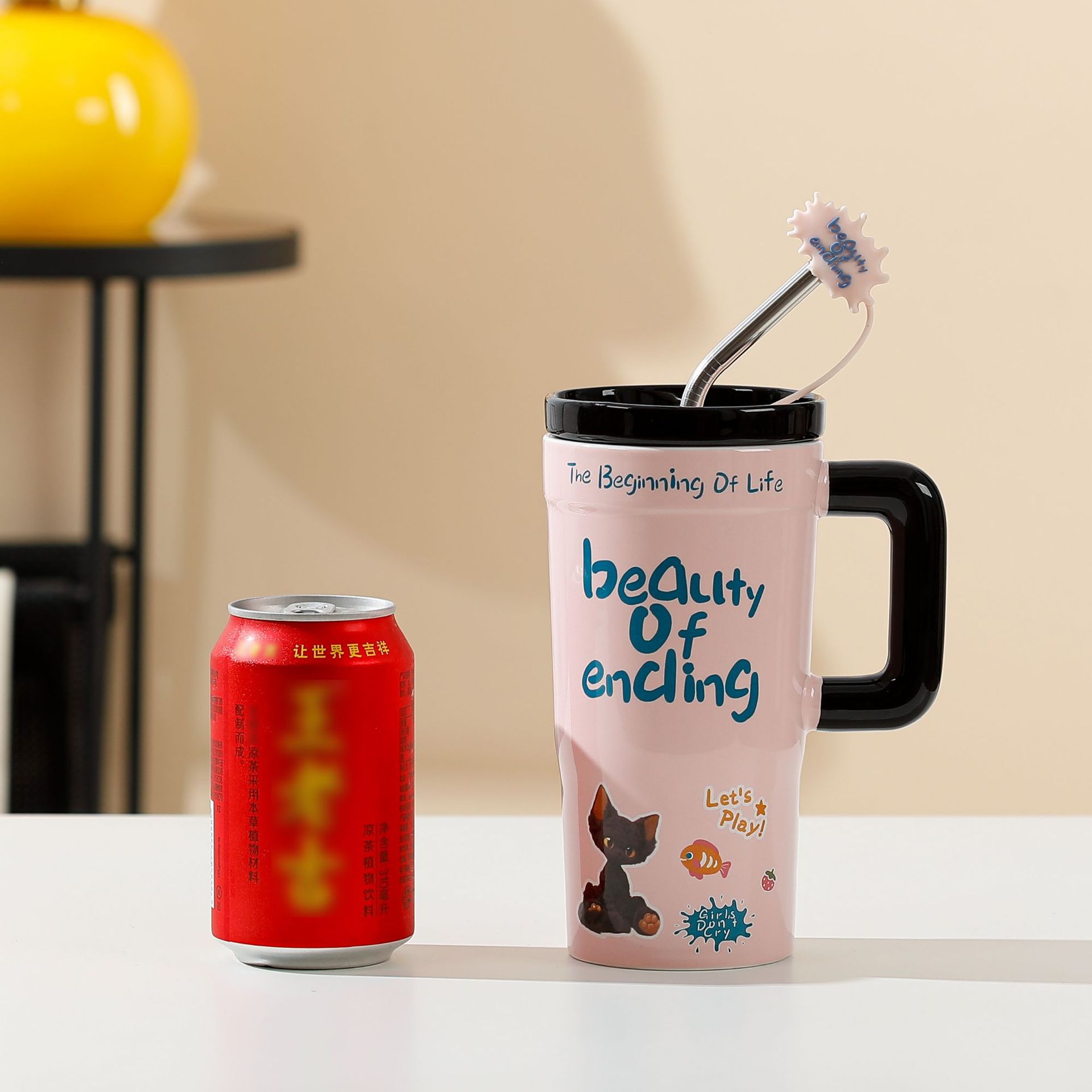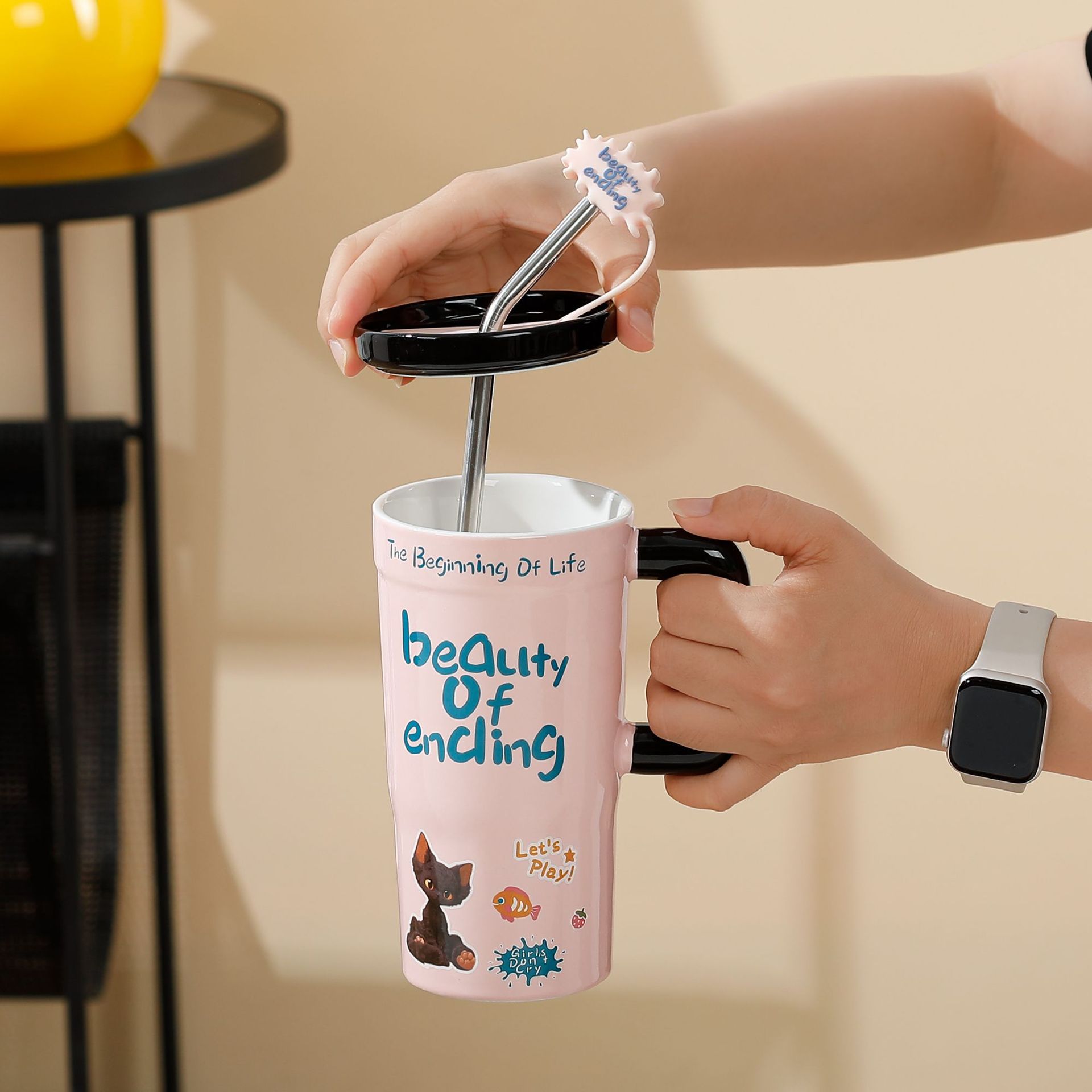 만화 밀짚 컵 소녀 높은 가치 여름 홈 세라믹 컵 뚜껑 사무실 찻잔 선물 도매
