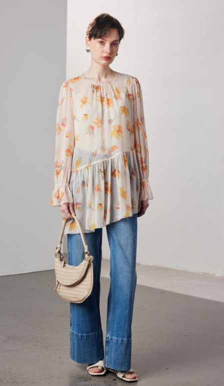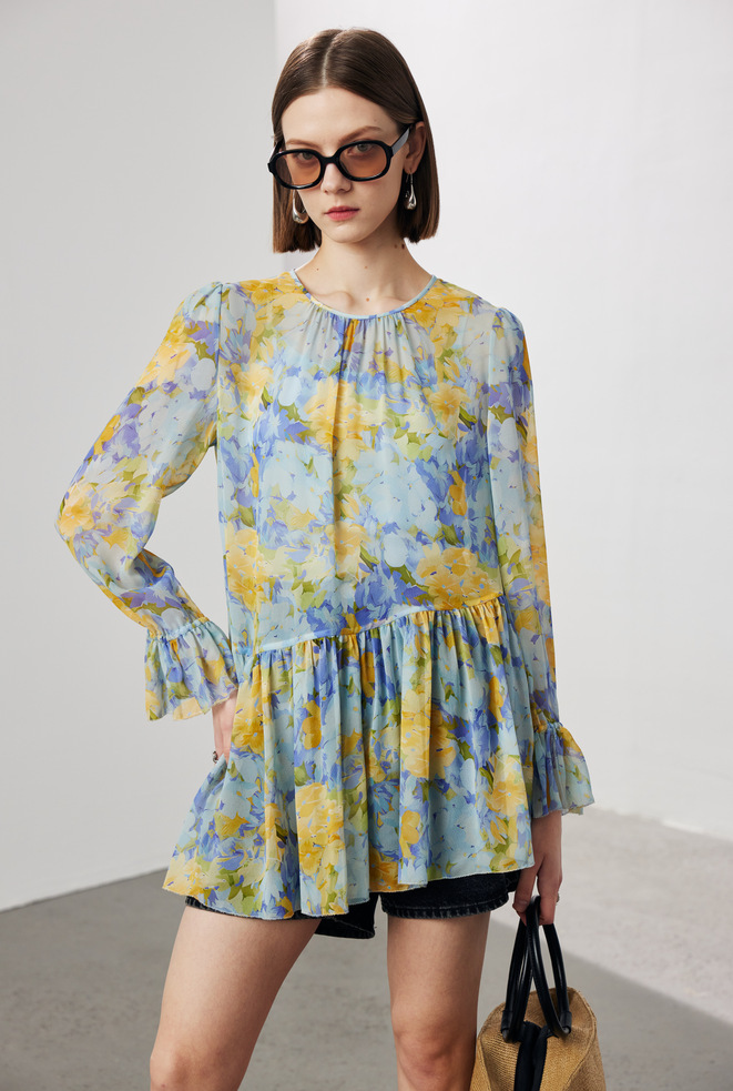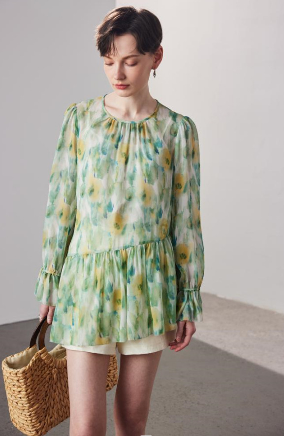 여성용 실크 셔츠 2026 봄 여름 신상 투피스 세트 인형풍 셔츠 프린트 살짝 비치는 조젯 100% 뽕나무 실크 탑스토어 가기