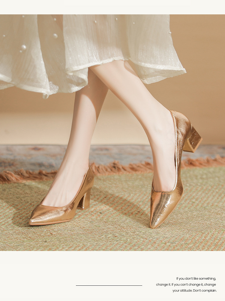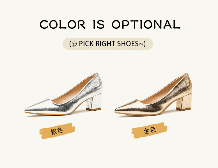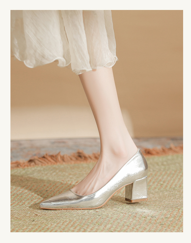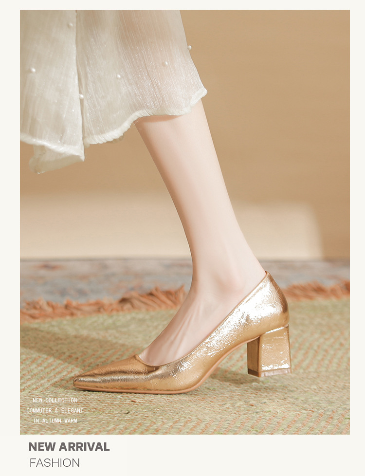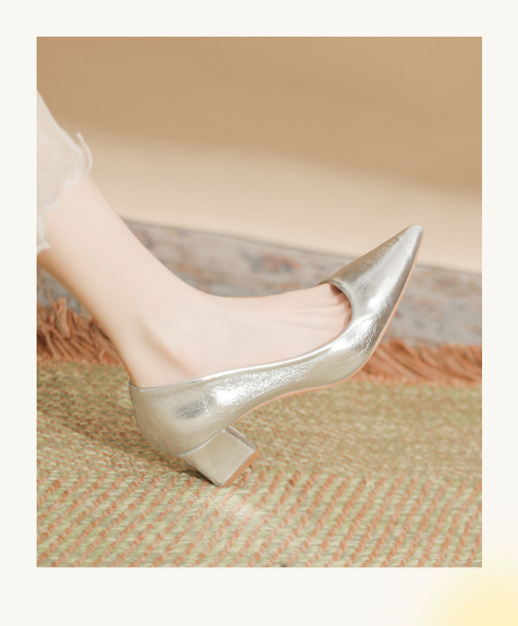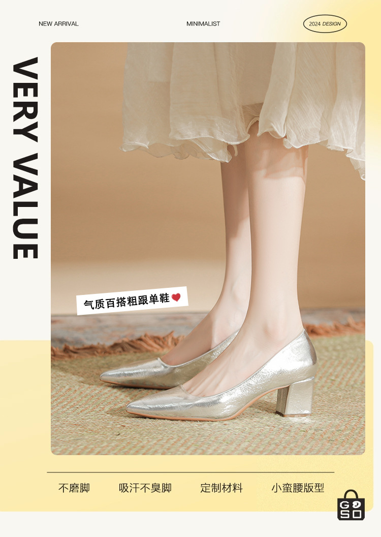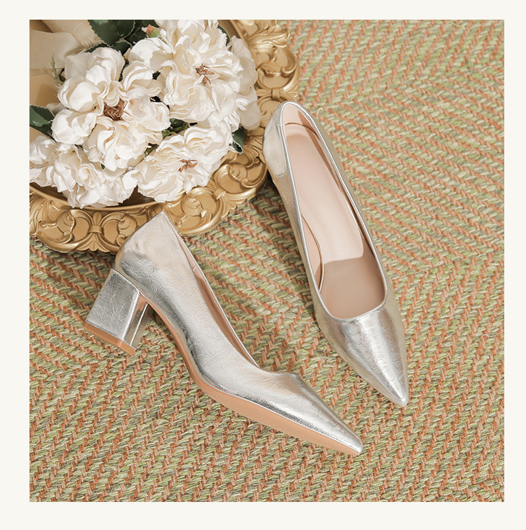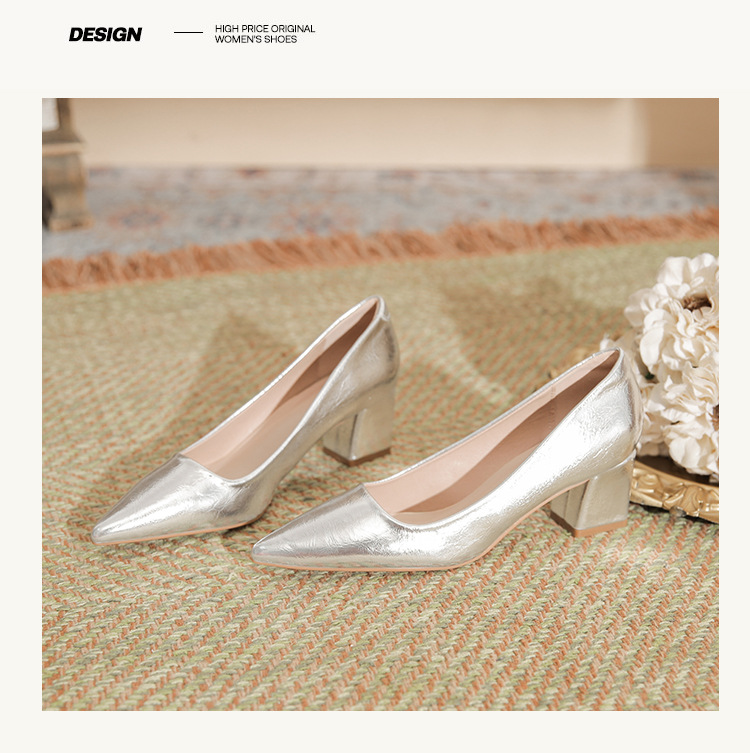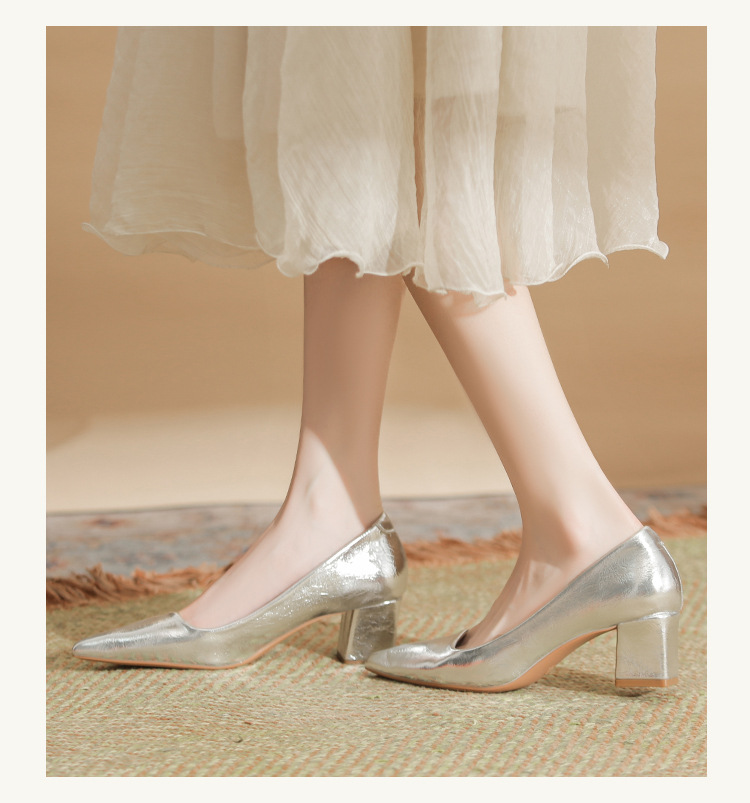 프렌치 골드 실버 하이힐 2025 새로운 스타일의 부드러운 가죽으로 발이 피곤하지 않고 오랫동안 작업할 수 있는 두꺼운 굽의 얕은 구두스토어 가기