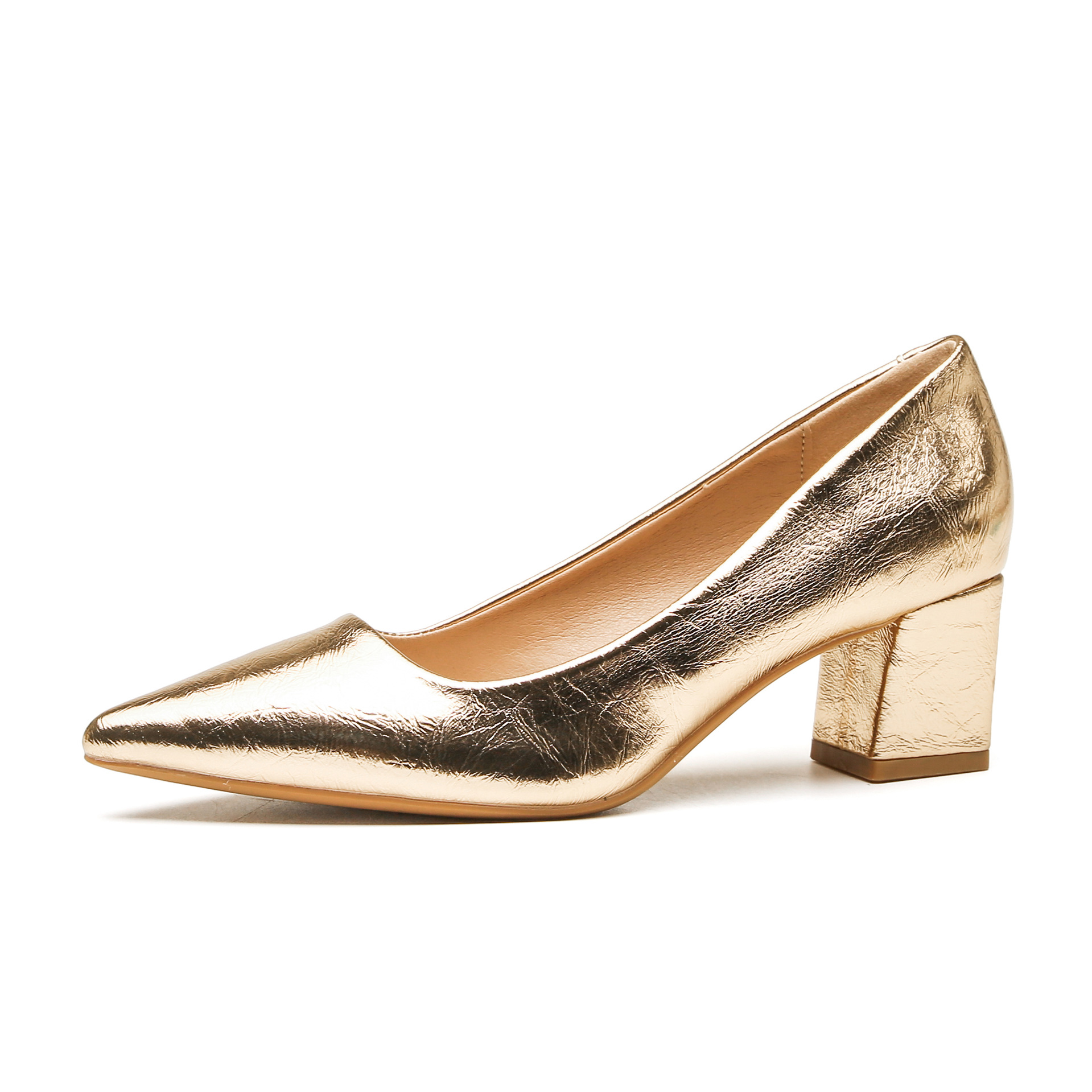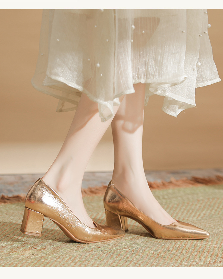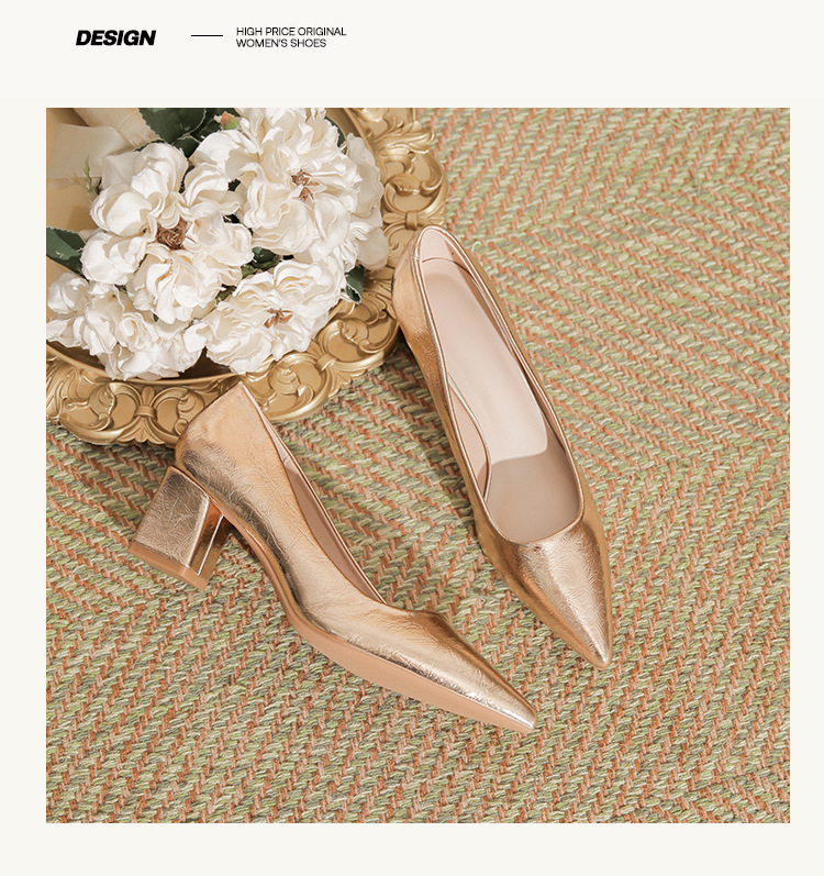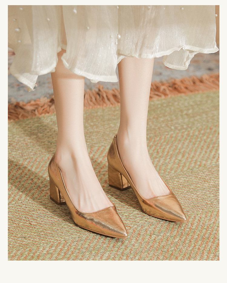 프렌치 골드 실버 하이힐 2025 새로운 스타일의 부드러운 가죽으로 발이 피곤하지 않고 오랫동안 작업할 수 있는 두꺼운 굽의 얕은 구두