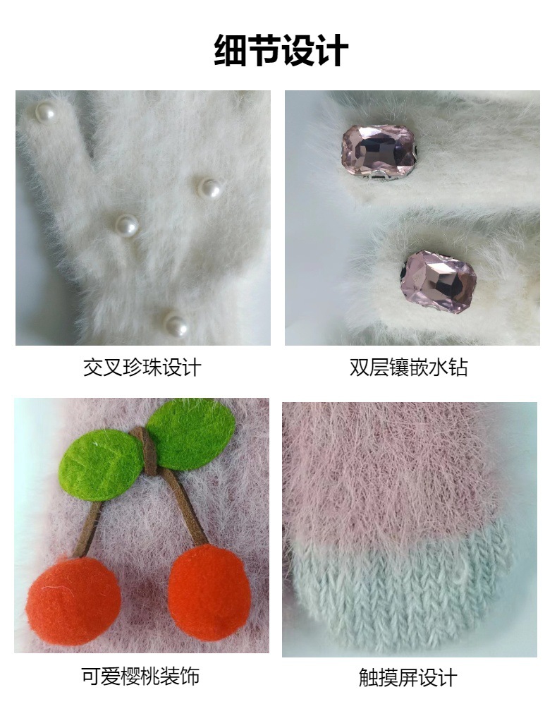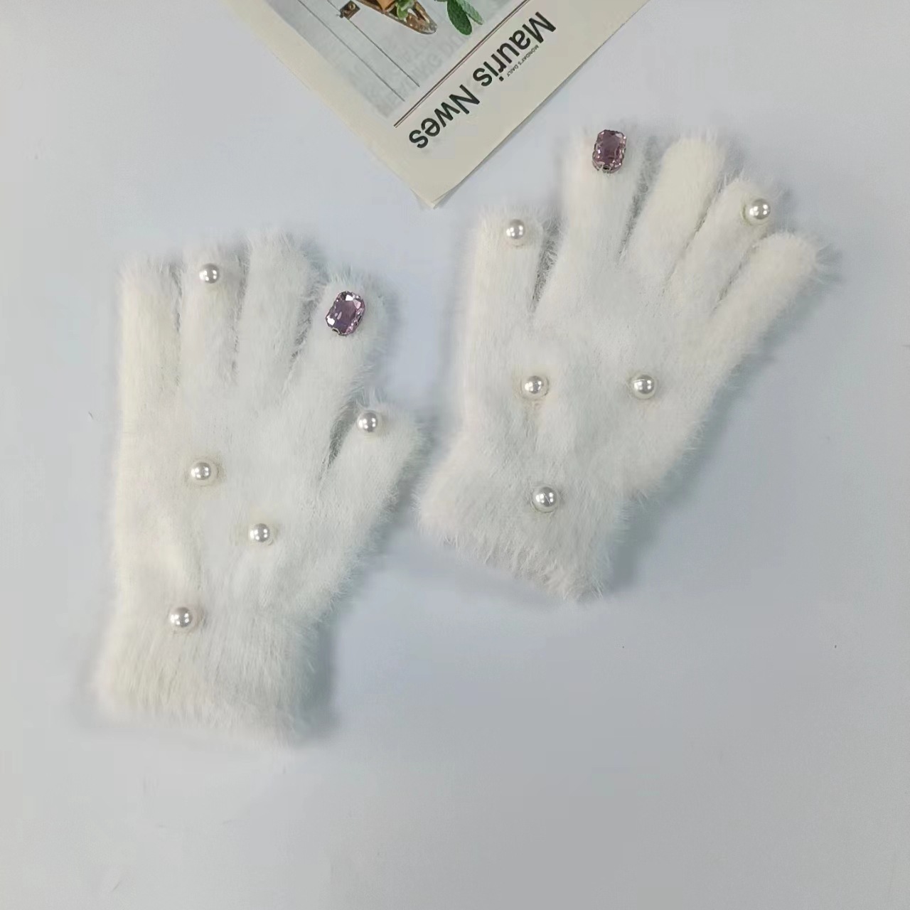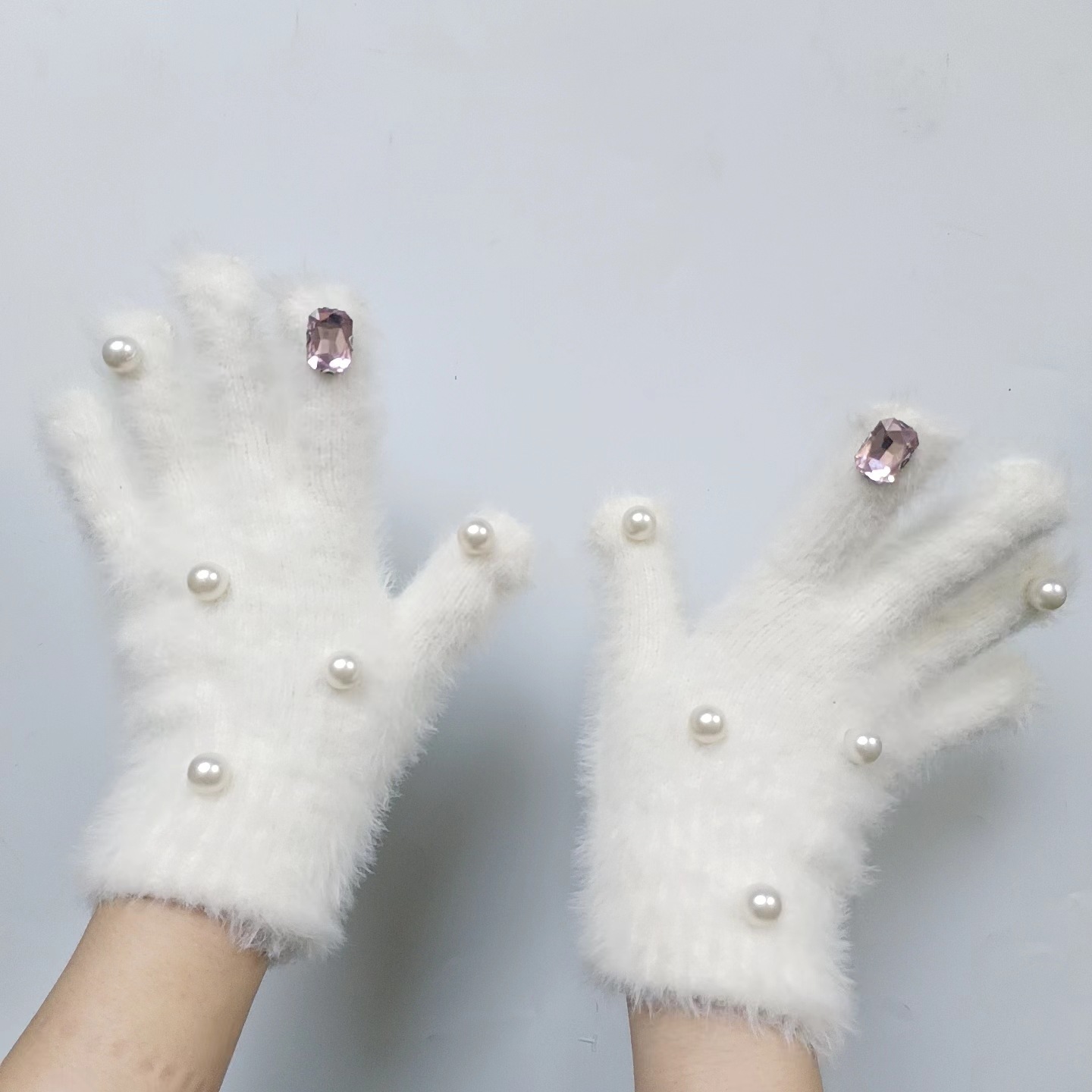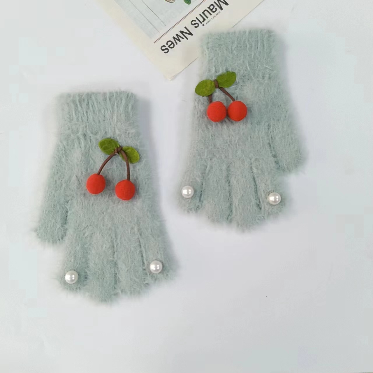새로운 겨울 진주 다이아몬드 체리 장갑 여성 기모 따뜻한 장갑 한국식 다섯 손가락 니트 장갑