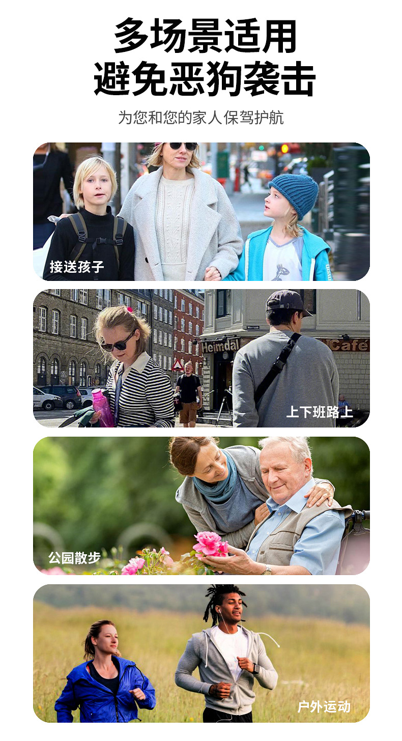 本产品主要用于外出时防止被狗攻击。能对狗、猫产生强烈的刺激(人耳会有听不到)对于动物会产生不舒服及难以忍受的干扰,而且此一刺耳的声音会在动物接近时更加严重让狗感觉不适宜而做出非常惊恐并仓惶逃离。