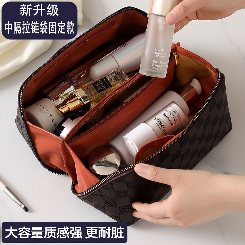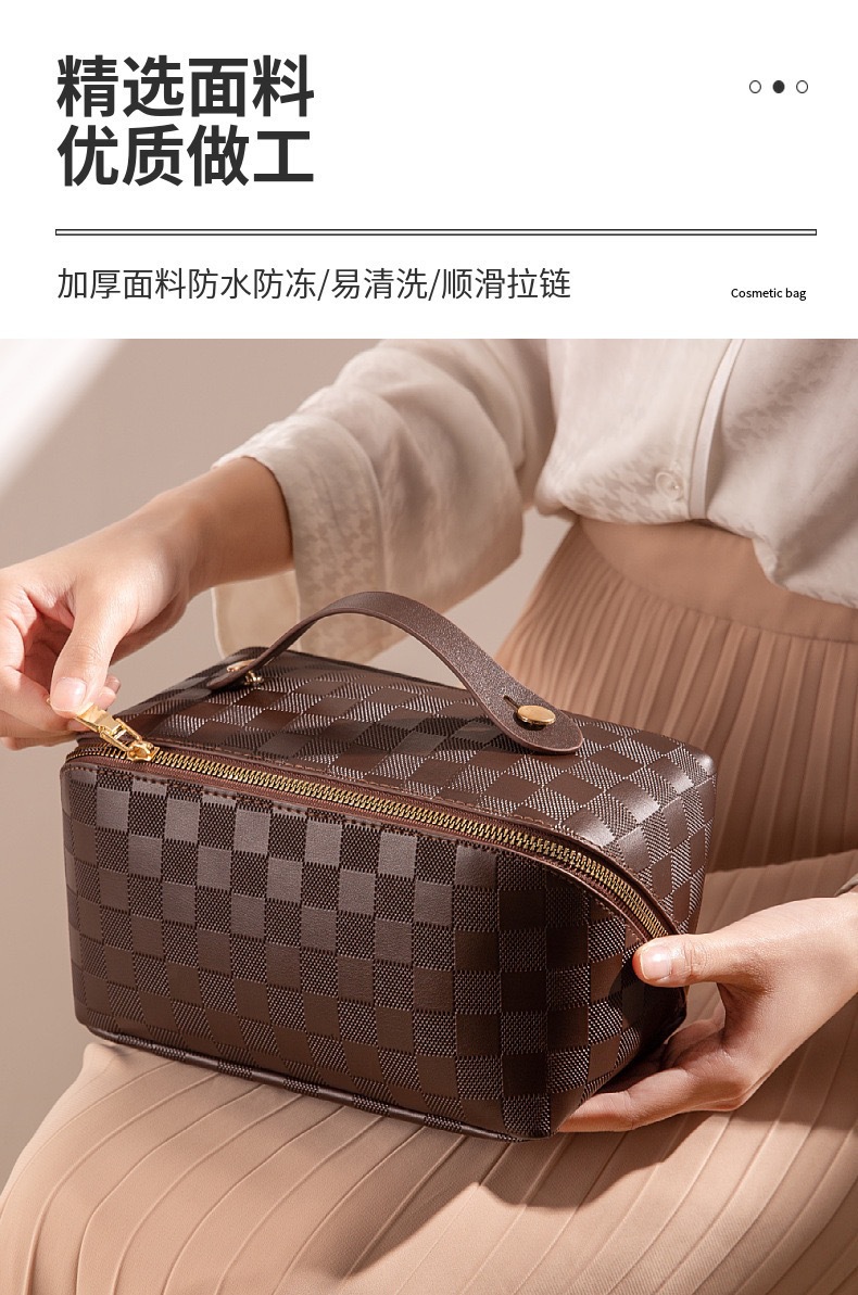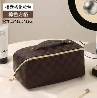 • 다크 브라운 체크 무늬 화장품 가방 [업그레이드 된 파티션 고정 단락]]