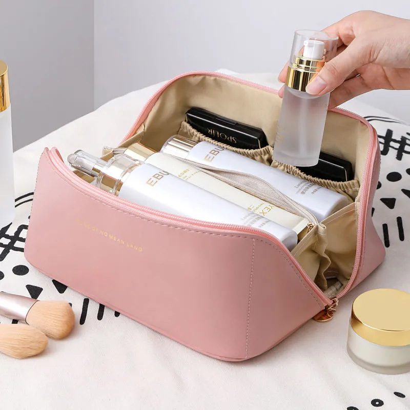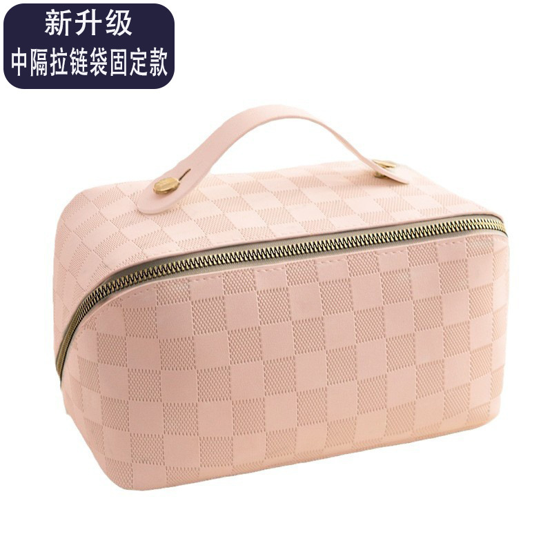 • 핑크 체크 무늬 화장품 가방 [업그레이드 파티션 고정 단락]]
