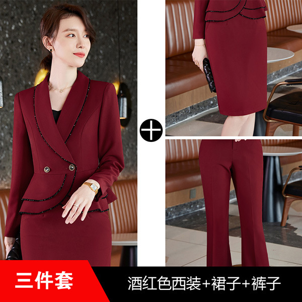 러플 헤드 버건디 긴팔 세트 재킷 여성 봄과 가을 슬림 핏 우아한 프로페셔널 세트 블랙 세트 원피스