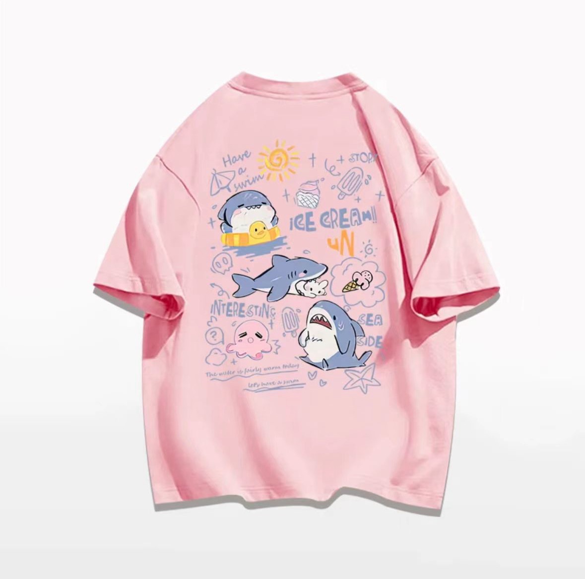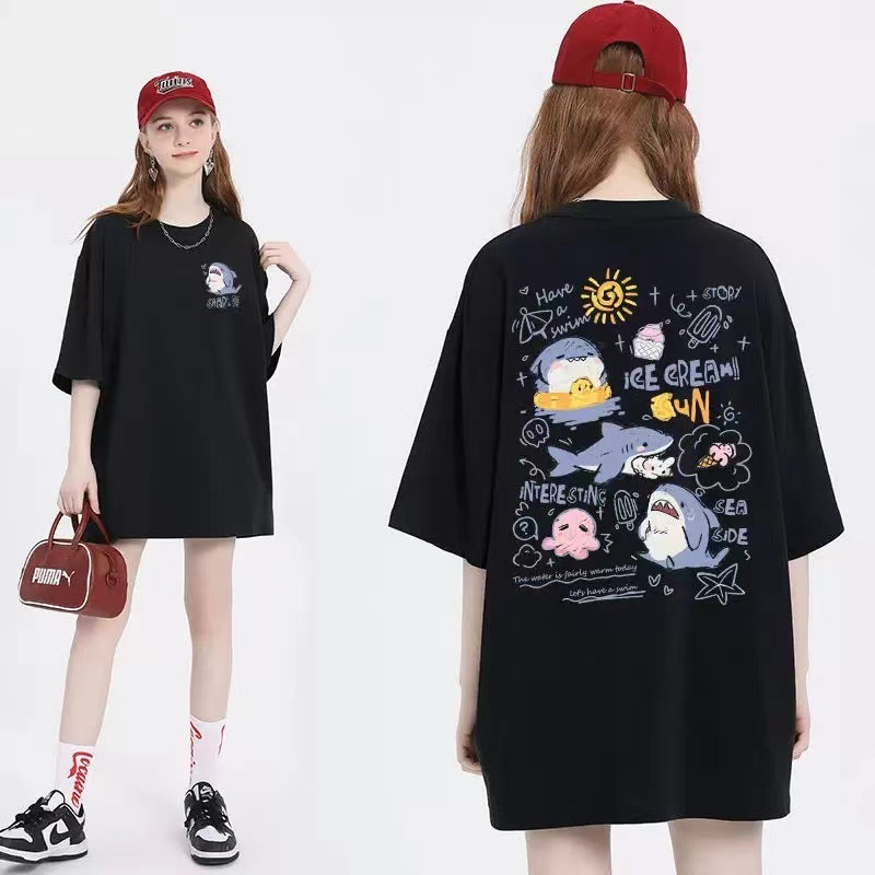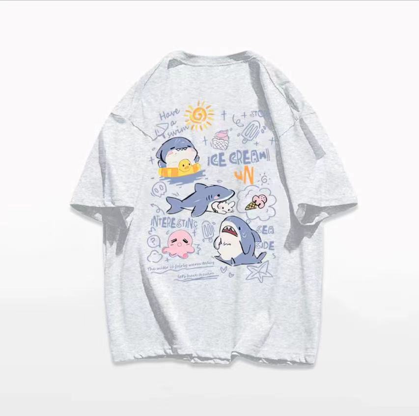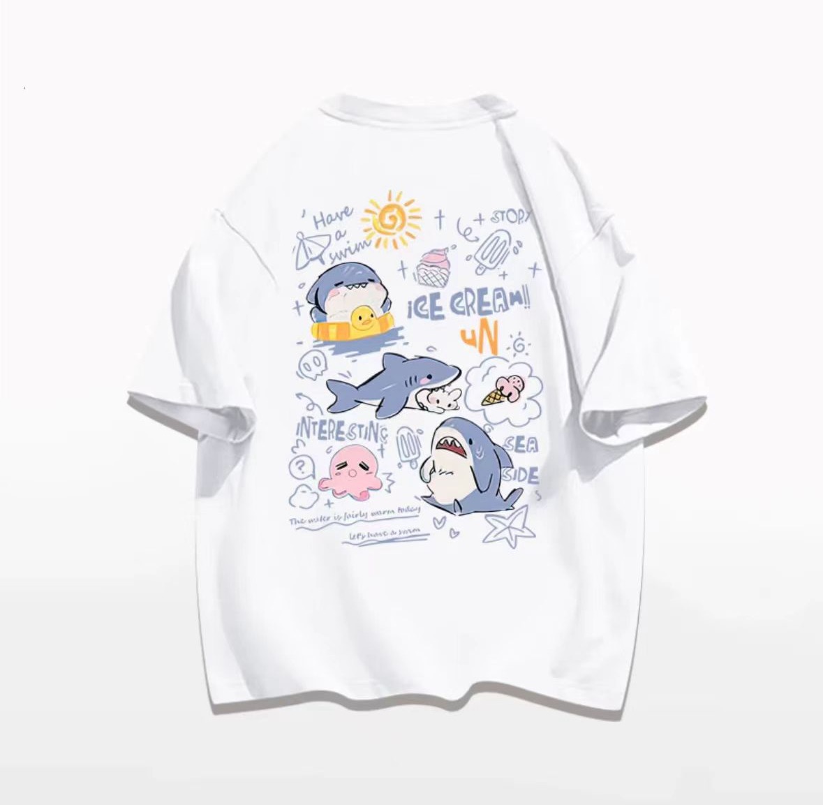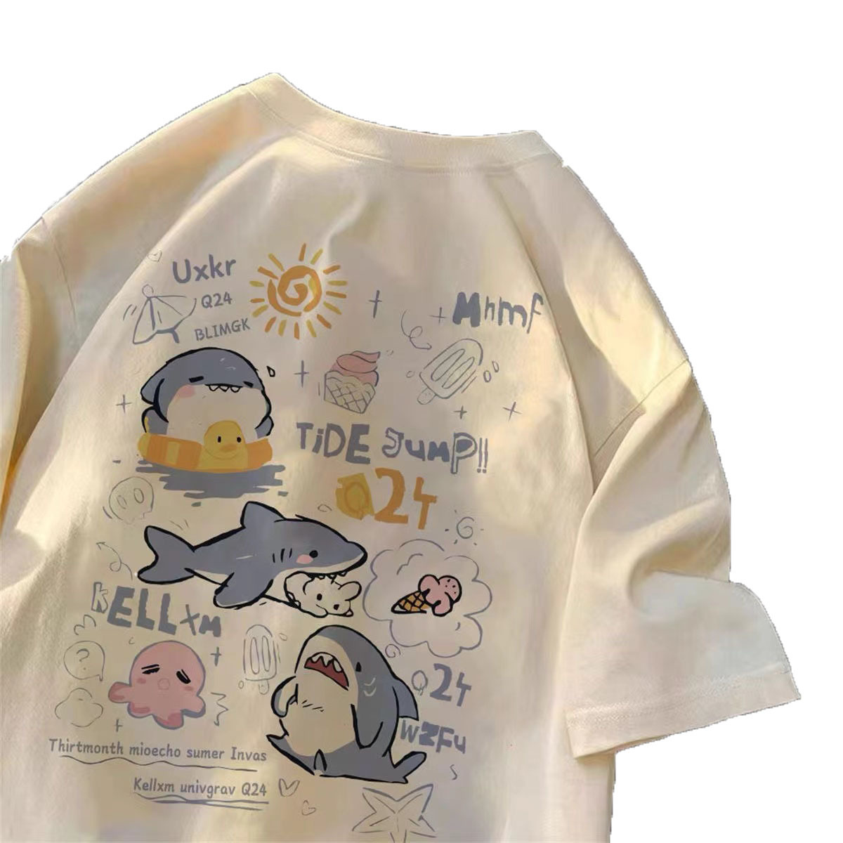 코튼 백 백 칼라 여름 새로운 일본 스타일 만화 상어 인쇄 남성과 여성을위한 반팔 라운드 넥 티셔츠 올 매치 게으른