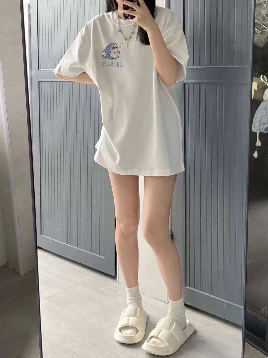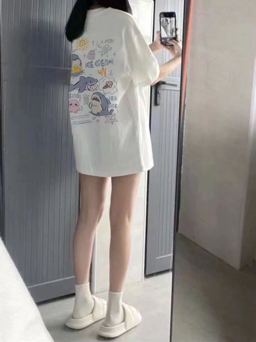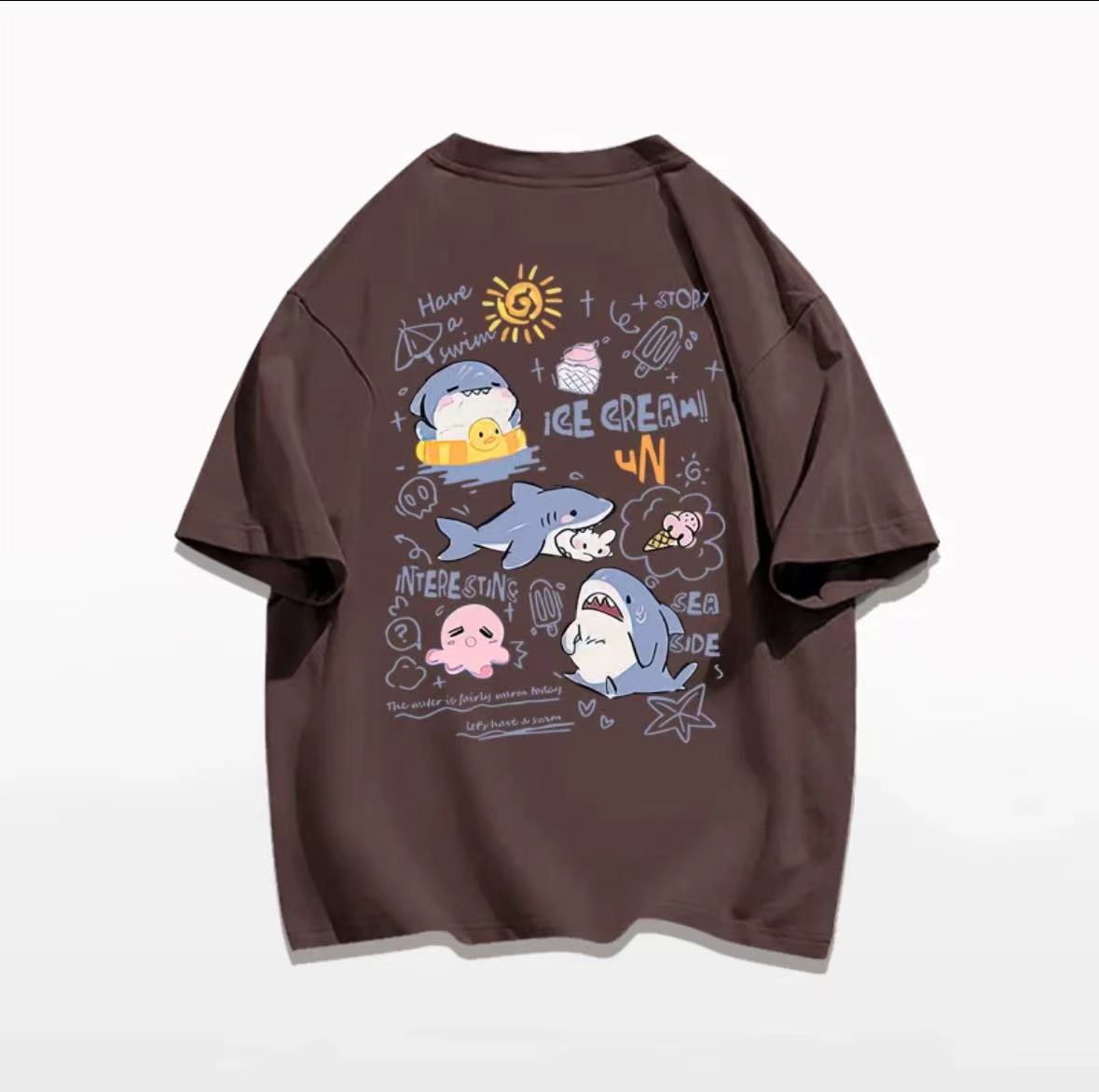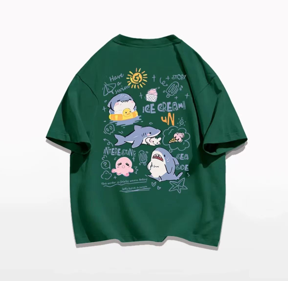 코튼 백 백 칼라 여름 새로운 일본 스타일 만화 상어 인쇄 남성과 여성을위한 반팔 라운드 넥 티셔츠 올 매치 게으른