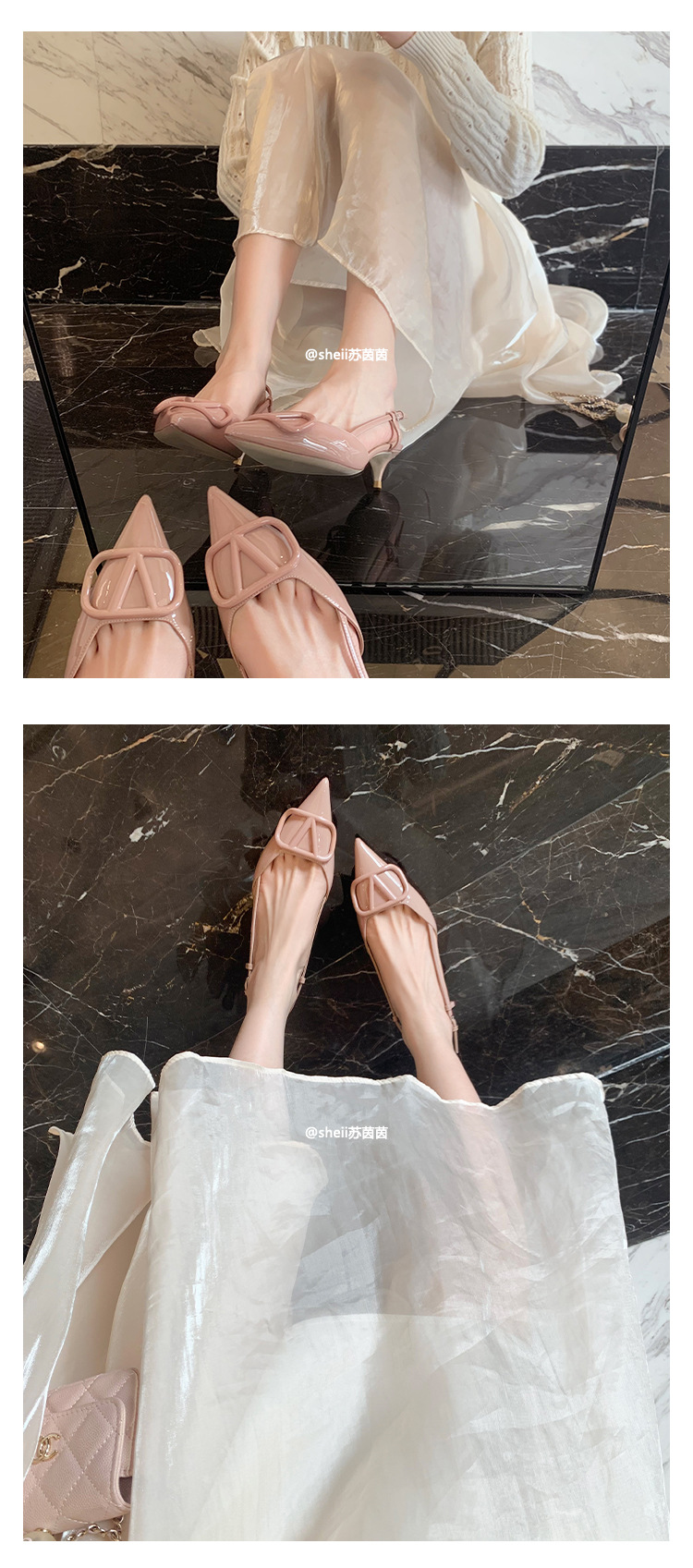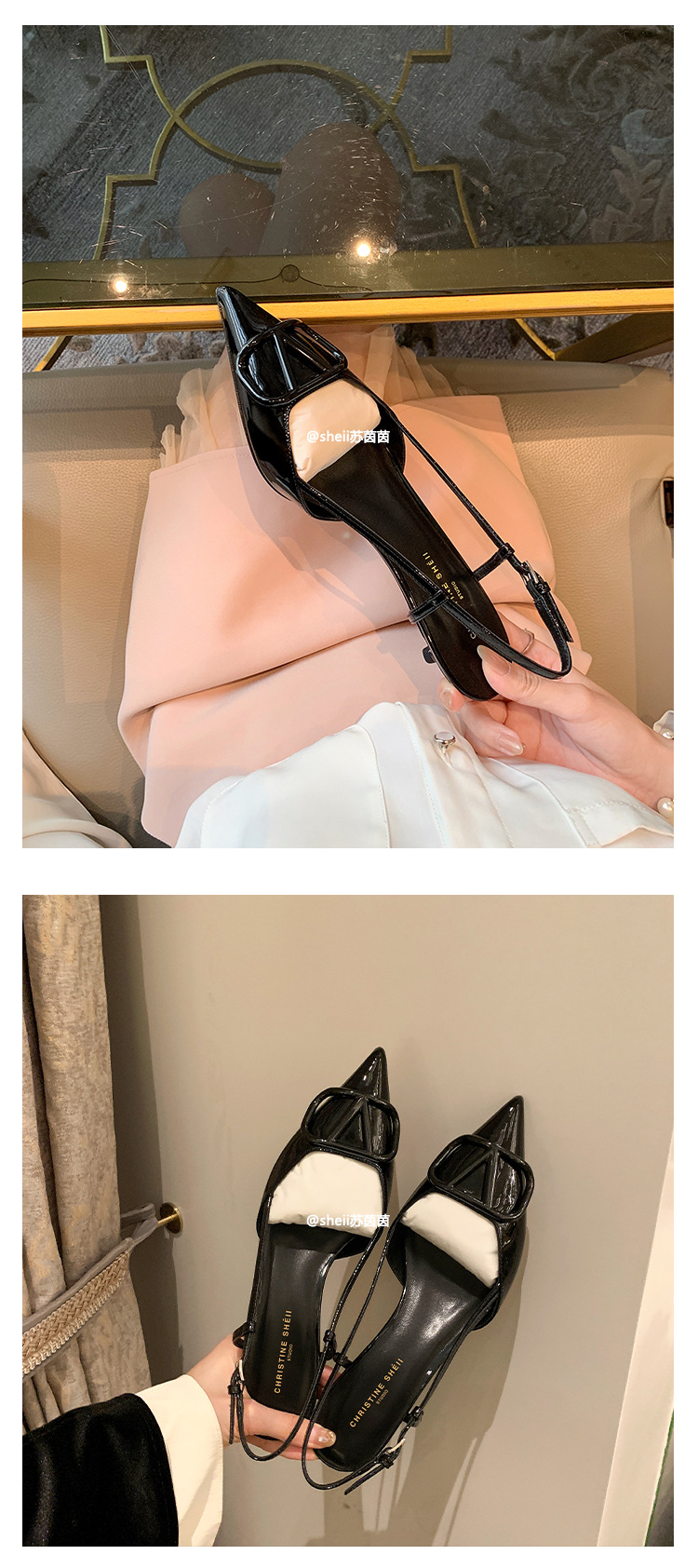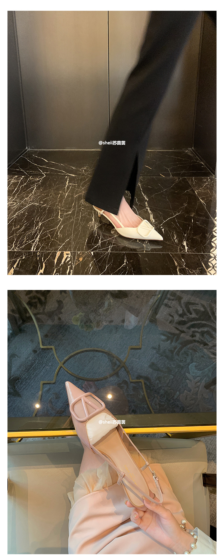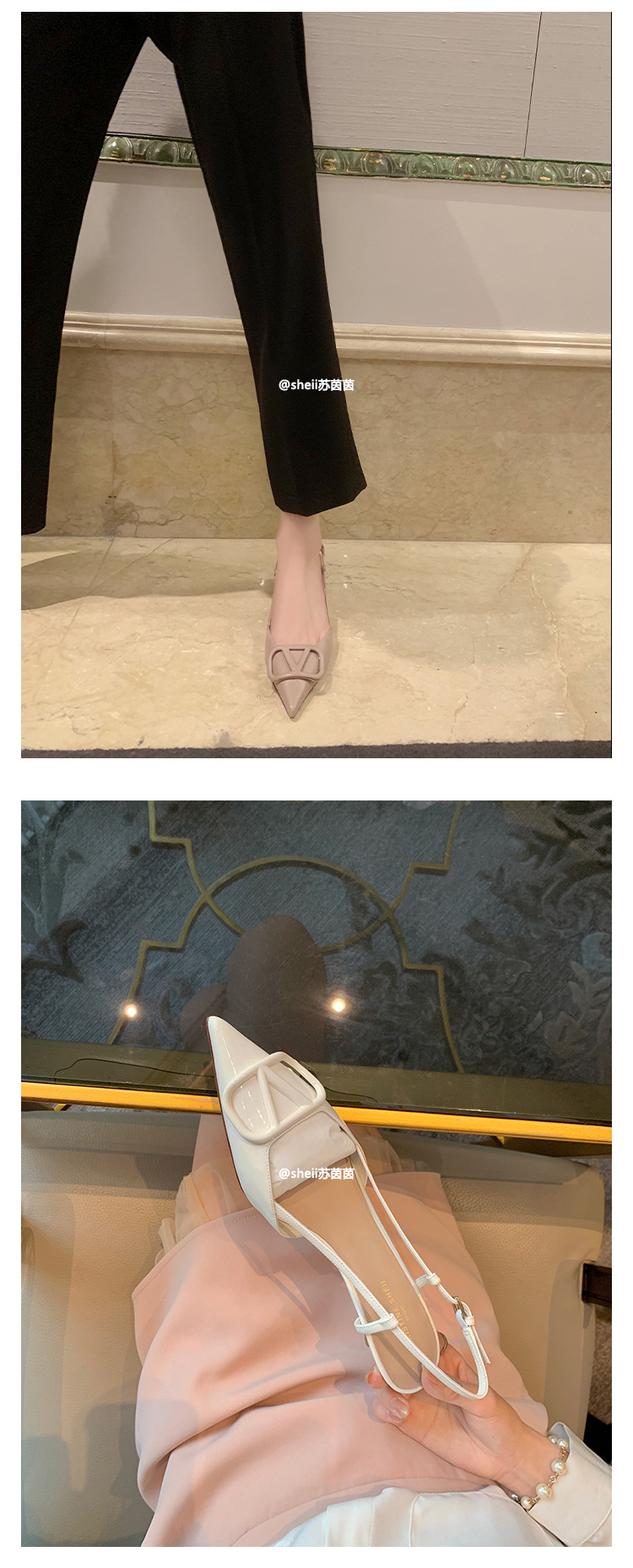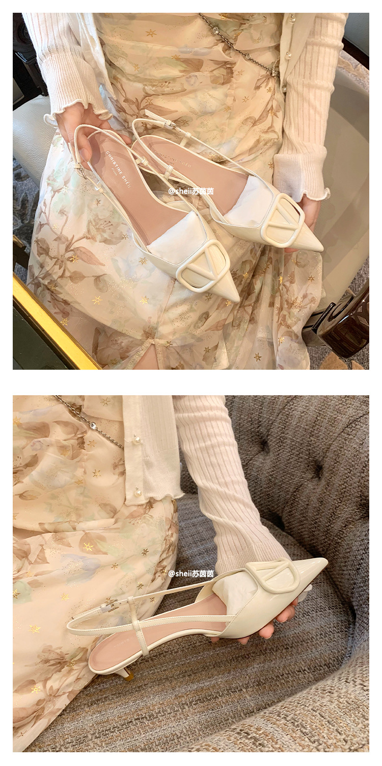 [Sheii Su Yinyin] 비교 ~ 뾰족한 V 버튼 가죽 Baotou 스틸레토 신발 통근 용 여성용 빈 샌들