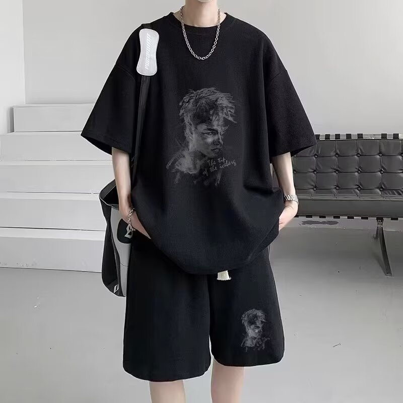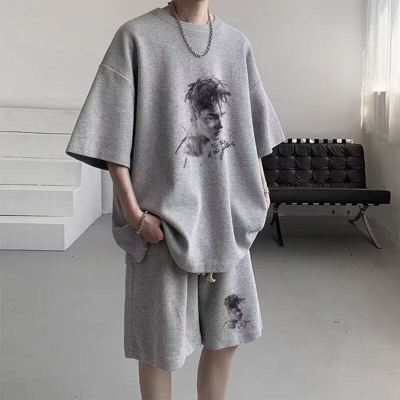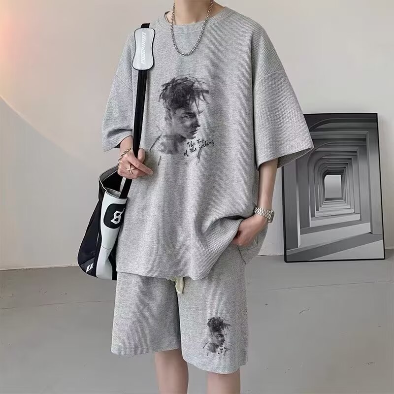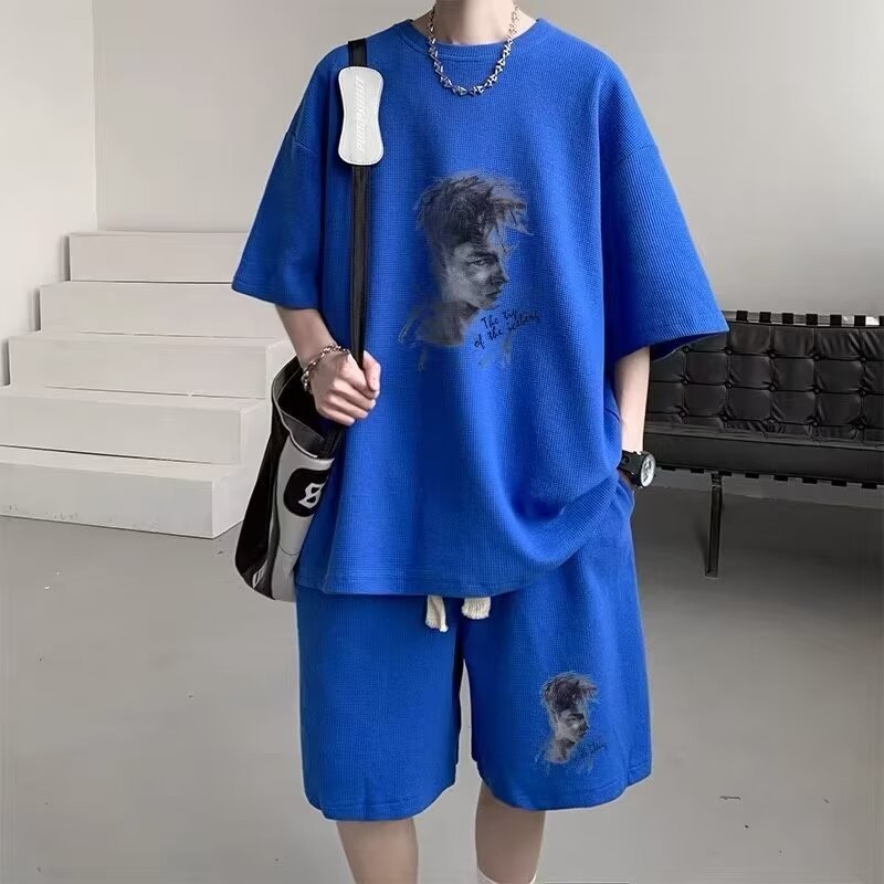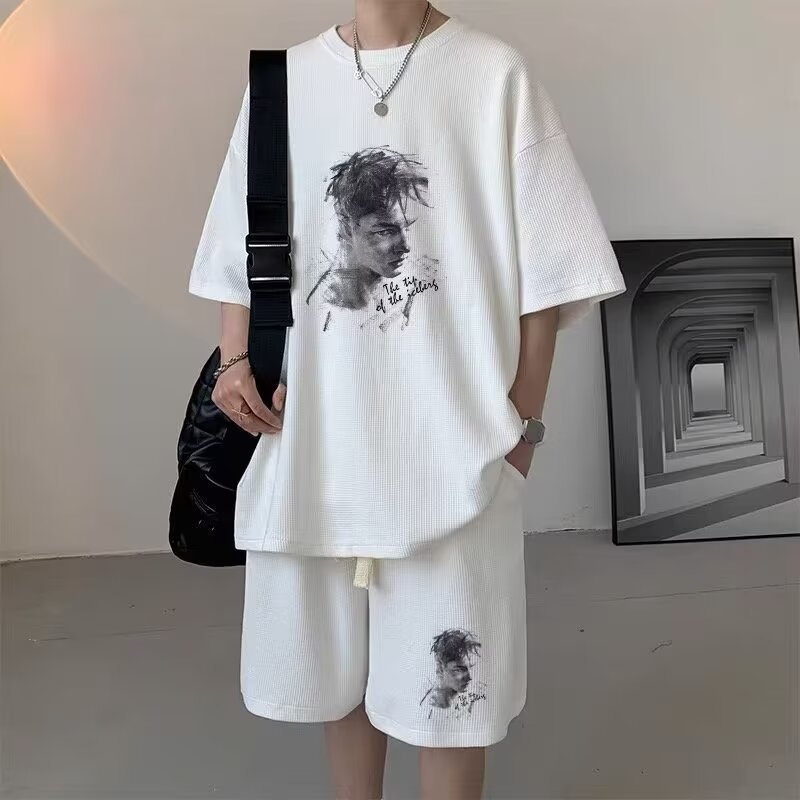 반팔 티셔츠 남성 캐주얼 스포츠 세트 여름 와플 러피 잘 생긴 고급 남성복 옷 세트스토어 가기