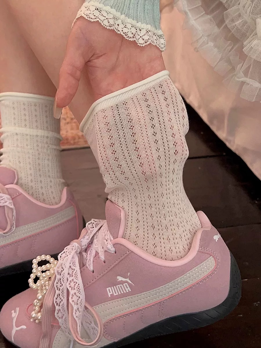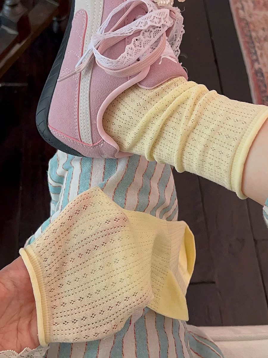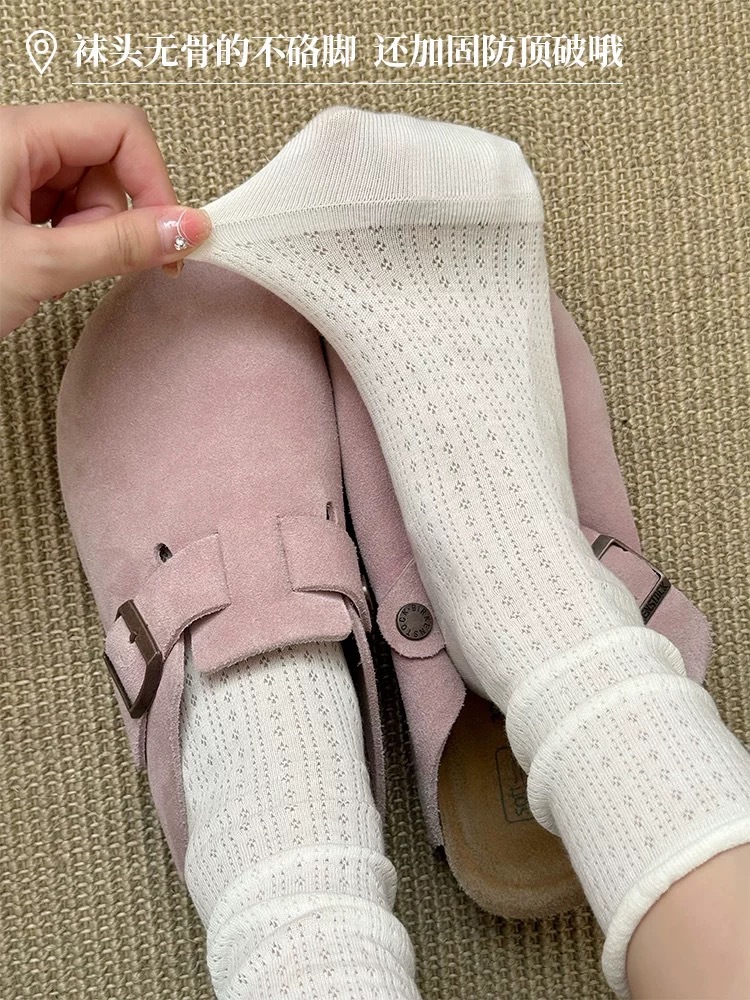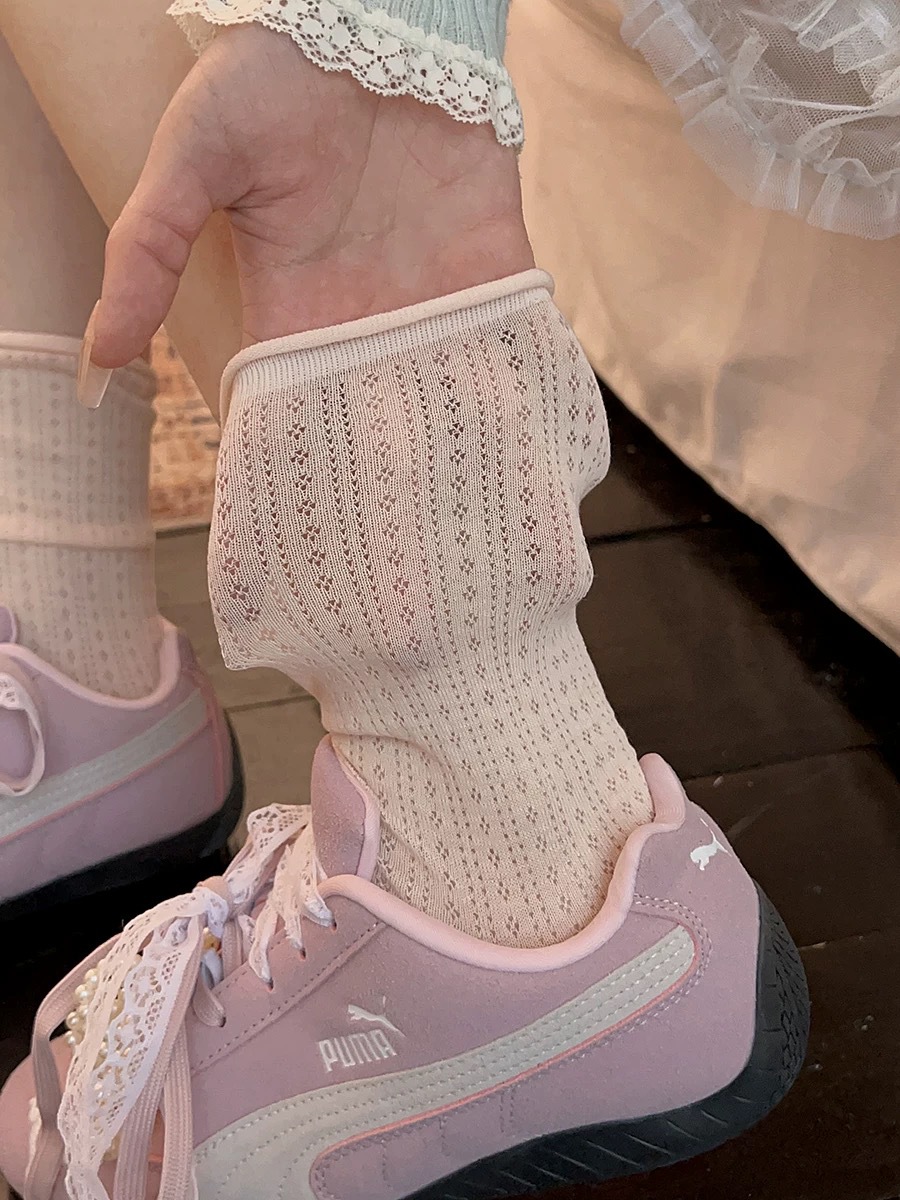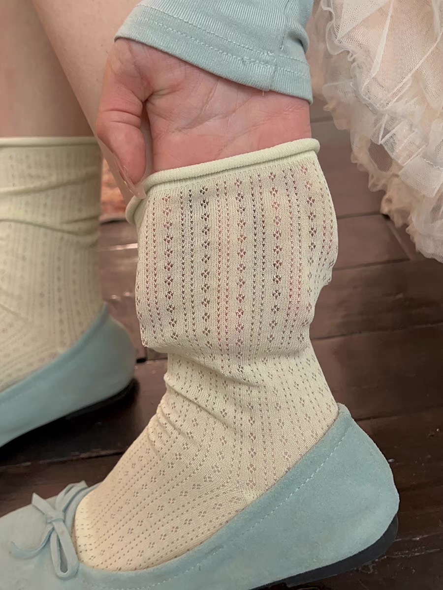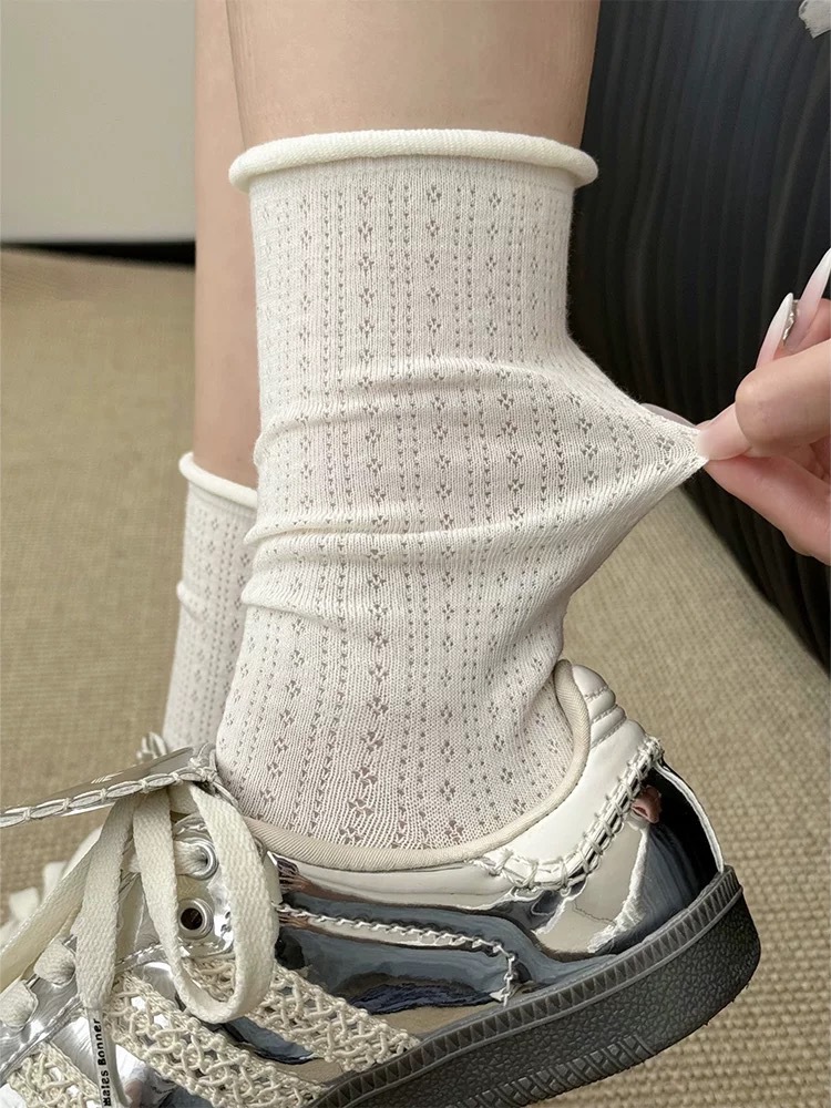 여성용 양말, 여름용 속이 빈 디자인, 무봉제 스타일, 한국식 심플 통기성 양말, 여름용 롤업 양말, 데일리룩, 땀 흡수