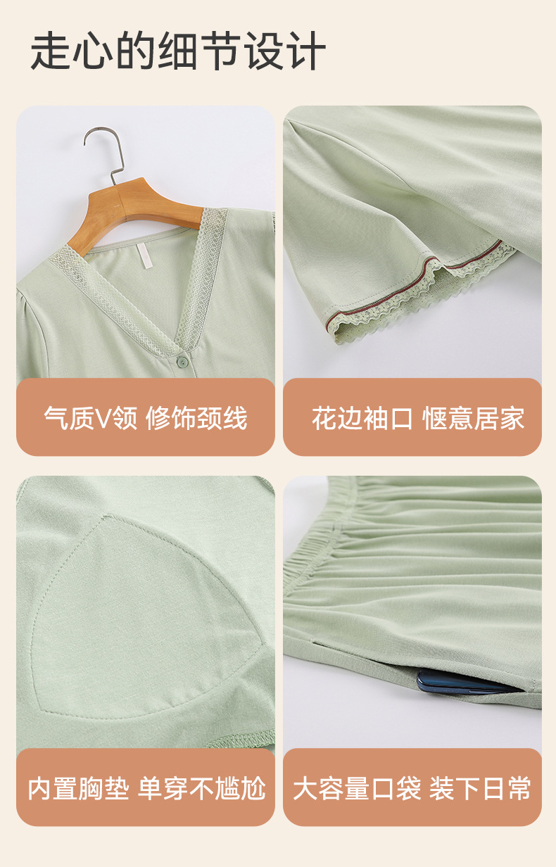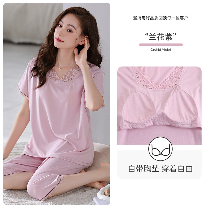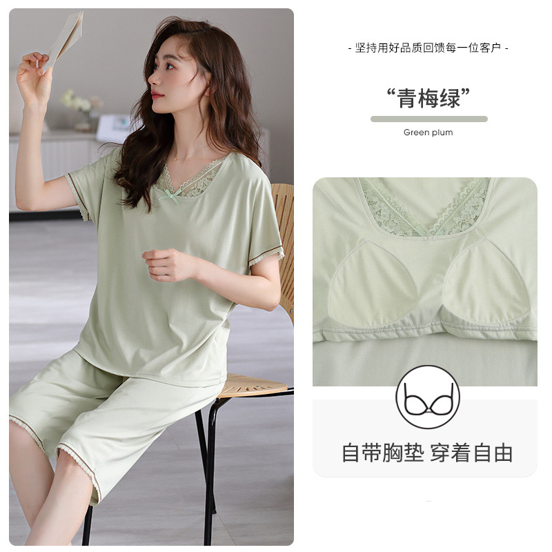 여성용 잠옷, 가슴 패드가 있는 여름 반팔 바지, 여성용 홈웨어, 여름 텐셀 면 실크 시원한 얇은 대형 세트