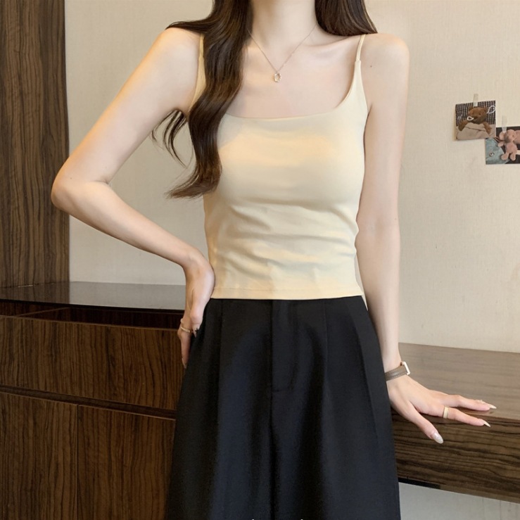 순수하고 섹시한 스타일의 여성용 화이트 이너탑, 가슴 패드가 있는 슬림핏 순면 뷰티백 탑, 외부 착용 가능