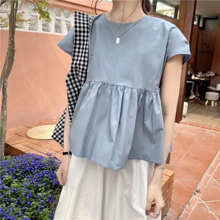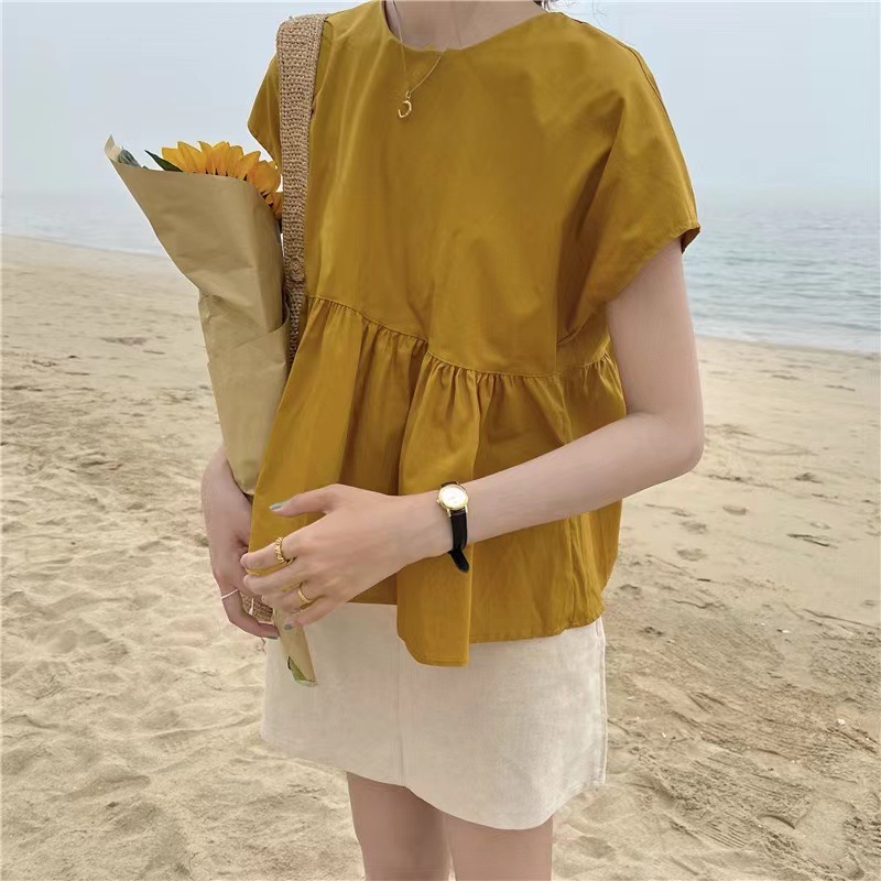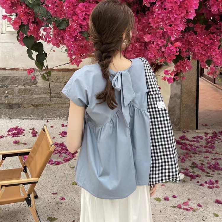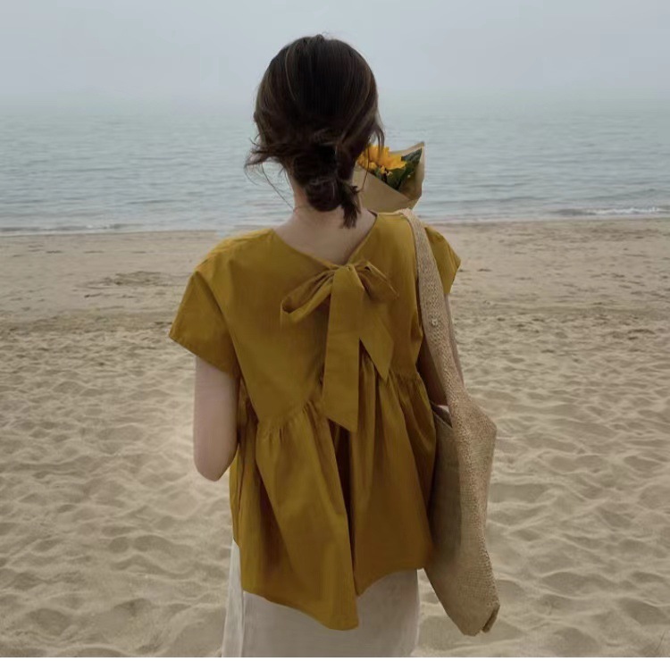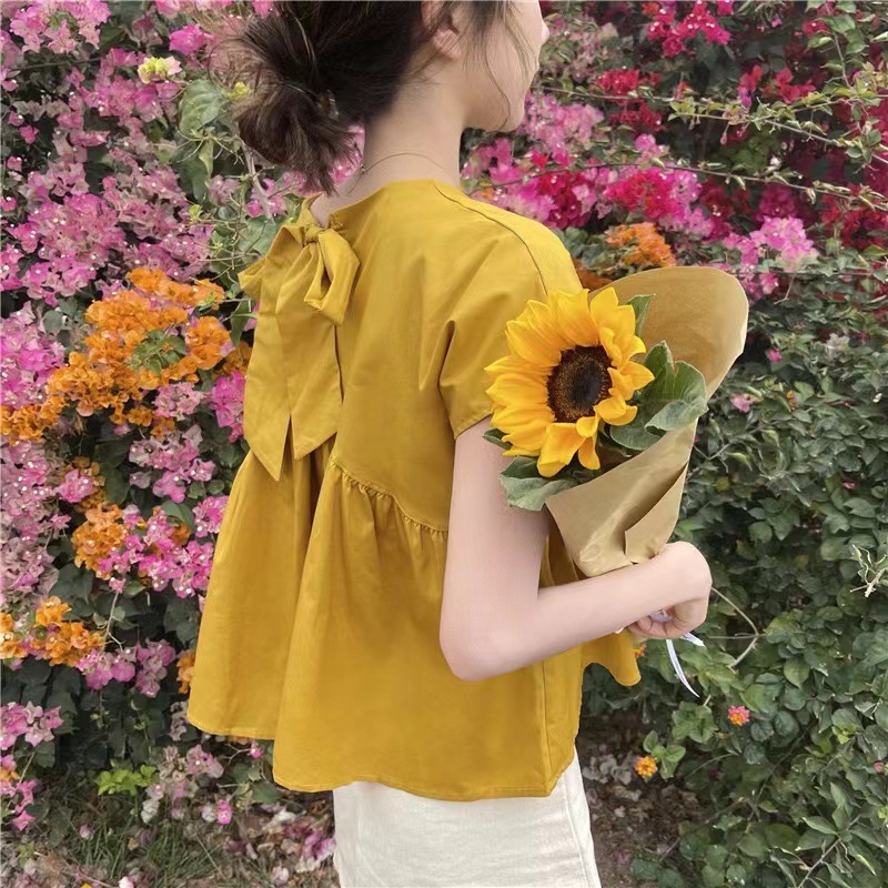 다시 활 셔츠 여성의 여름 반팔 얇은 노란색 둥근 목 최고 연령 감소 여름 뒤로 레이스 업 달콤하고 귀여운스토어 가기