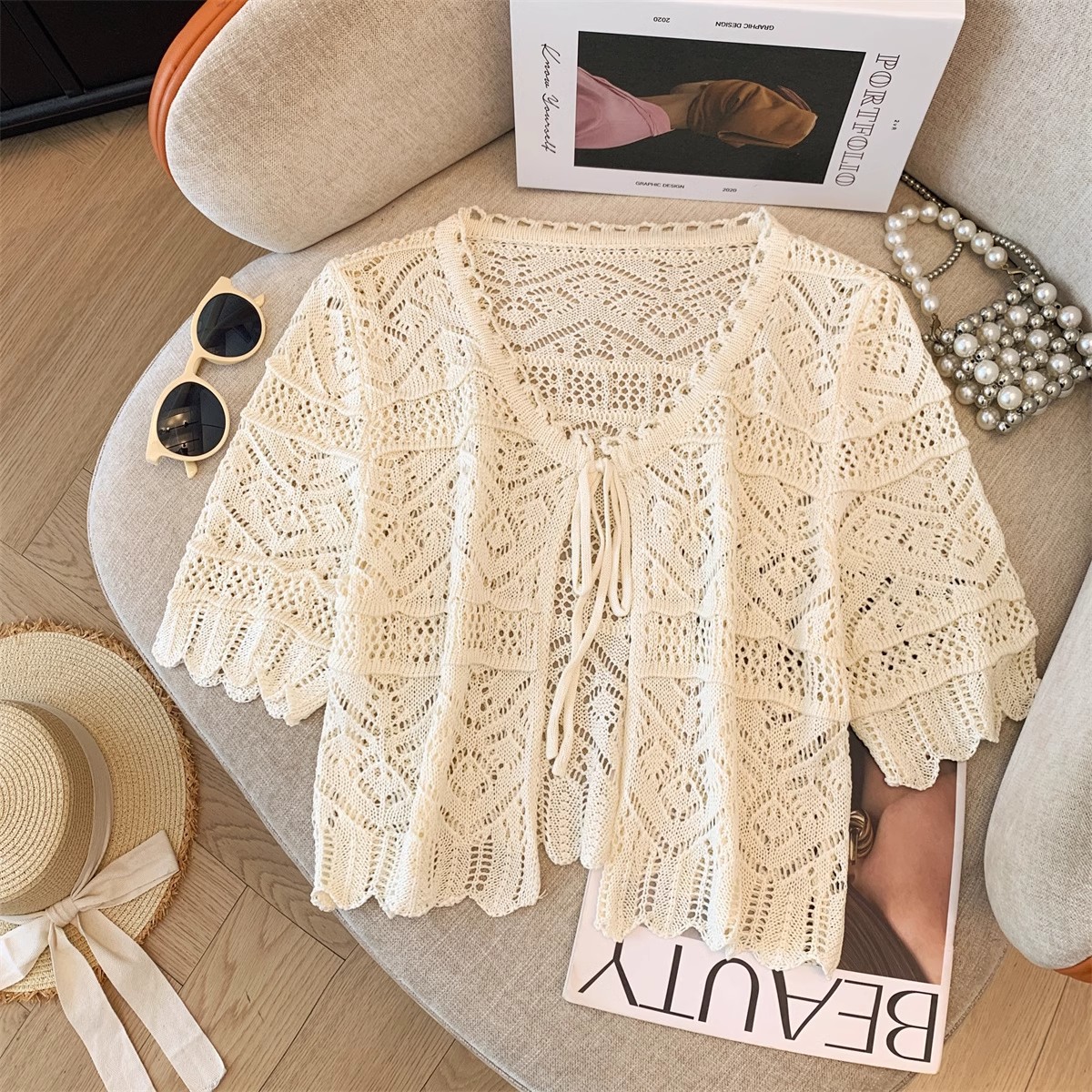 패션 할로우 니트 카디건 여성 여름 2024 새로운 선 스크린 블라우스 슬링 외부 목도리 얇은 짧은 탑