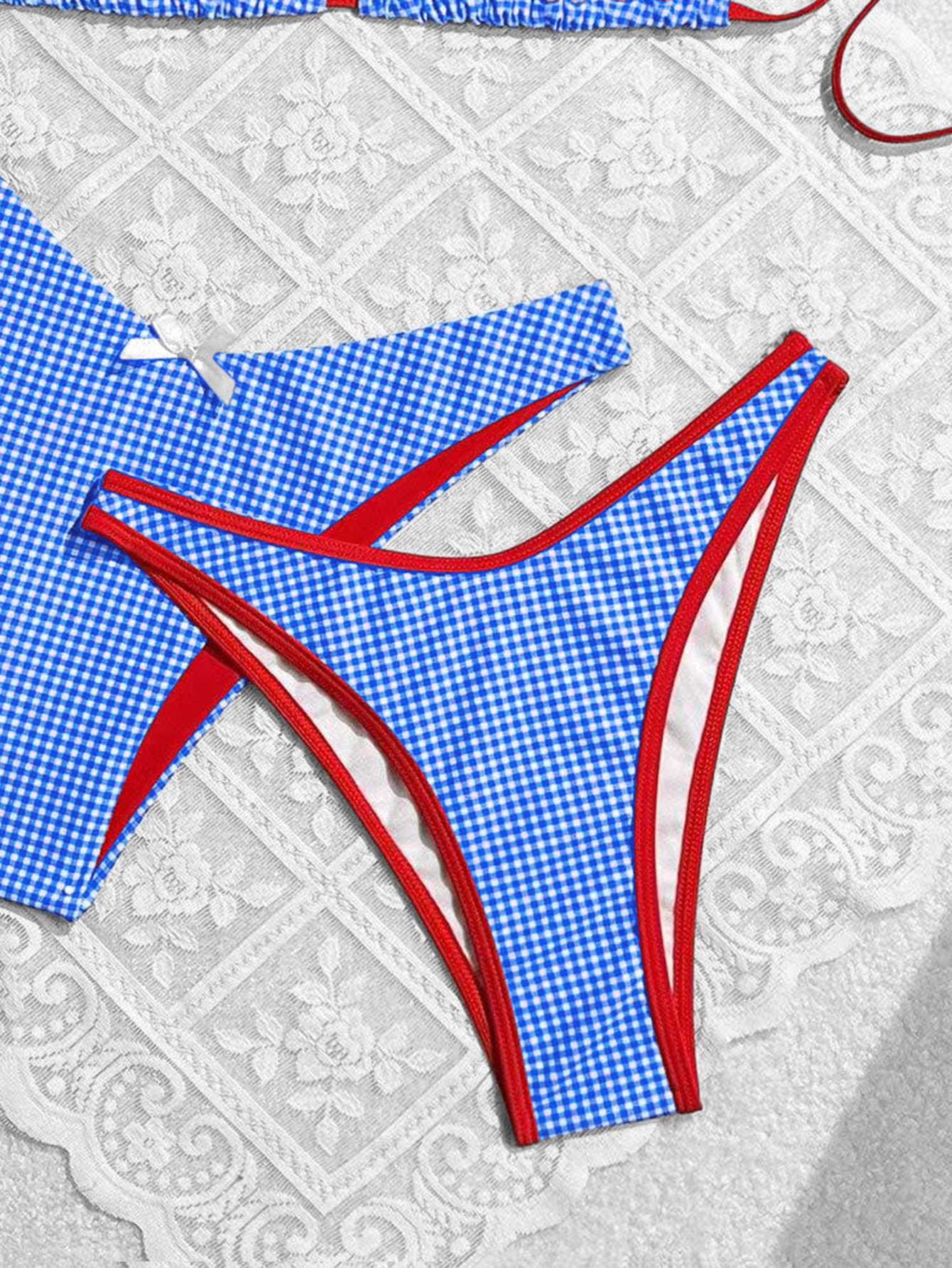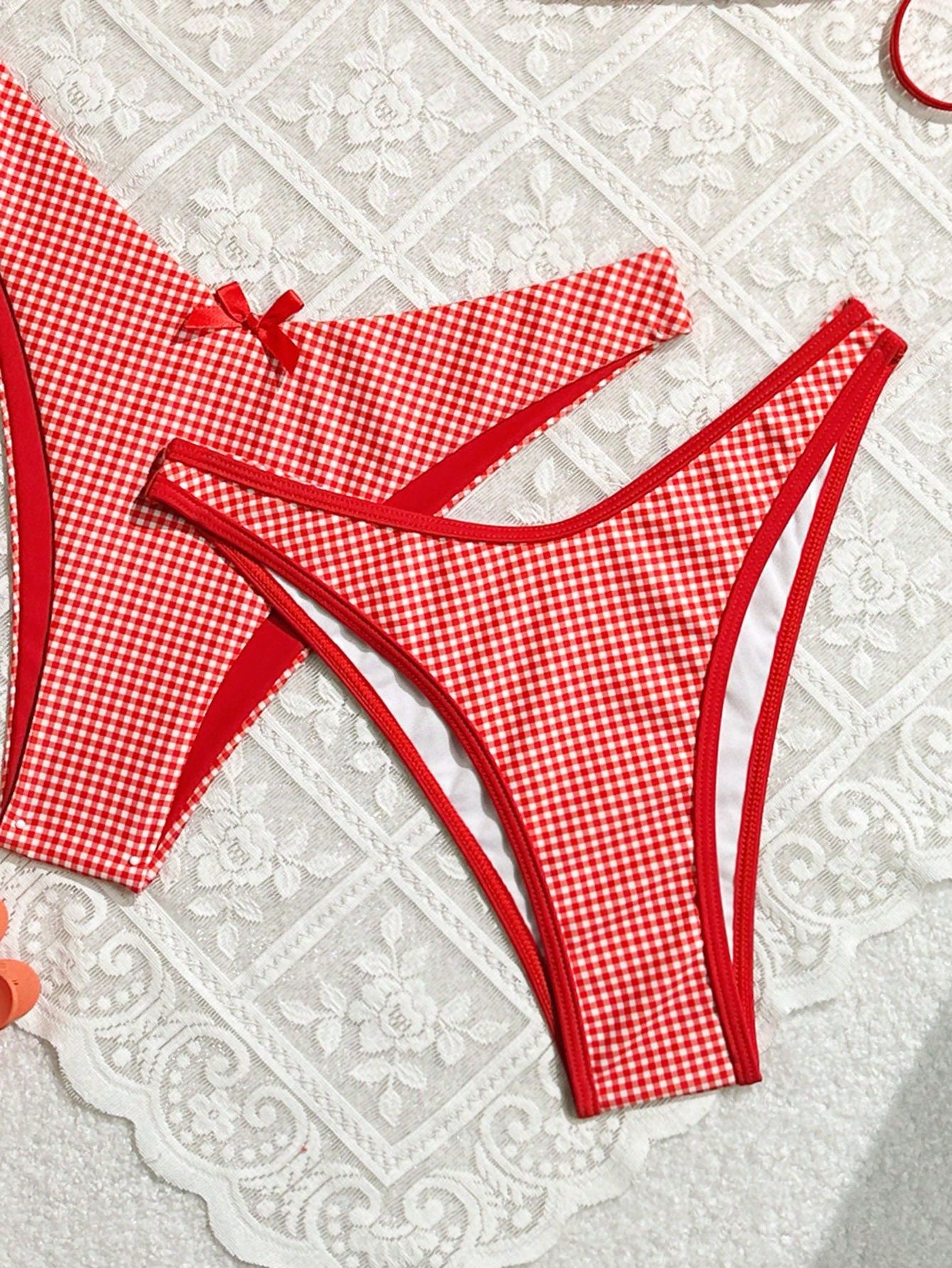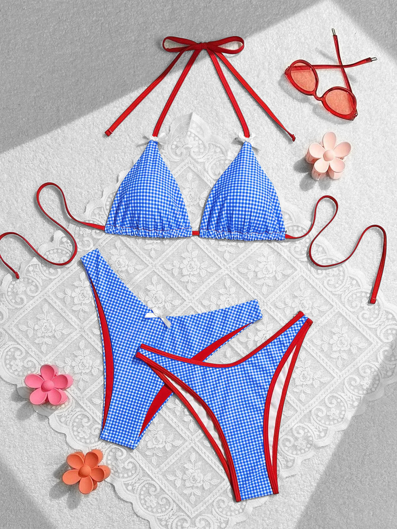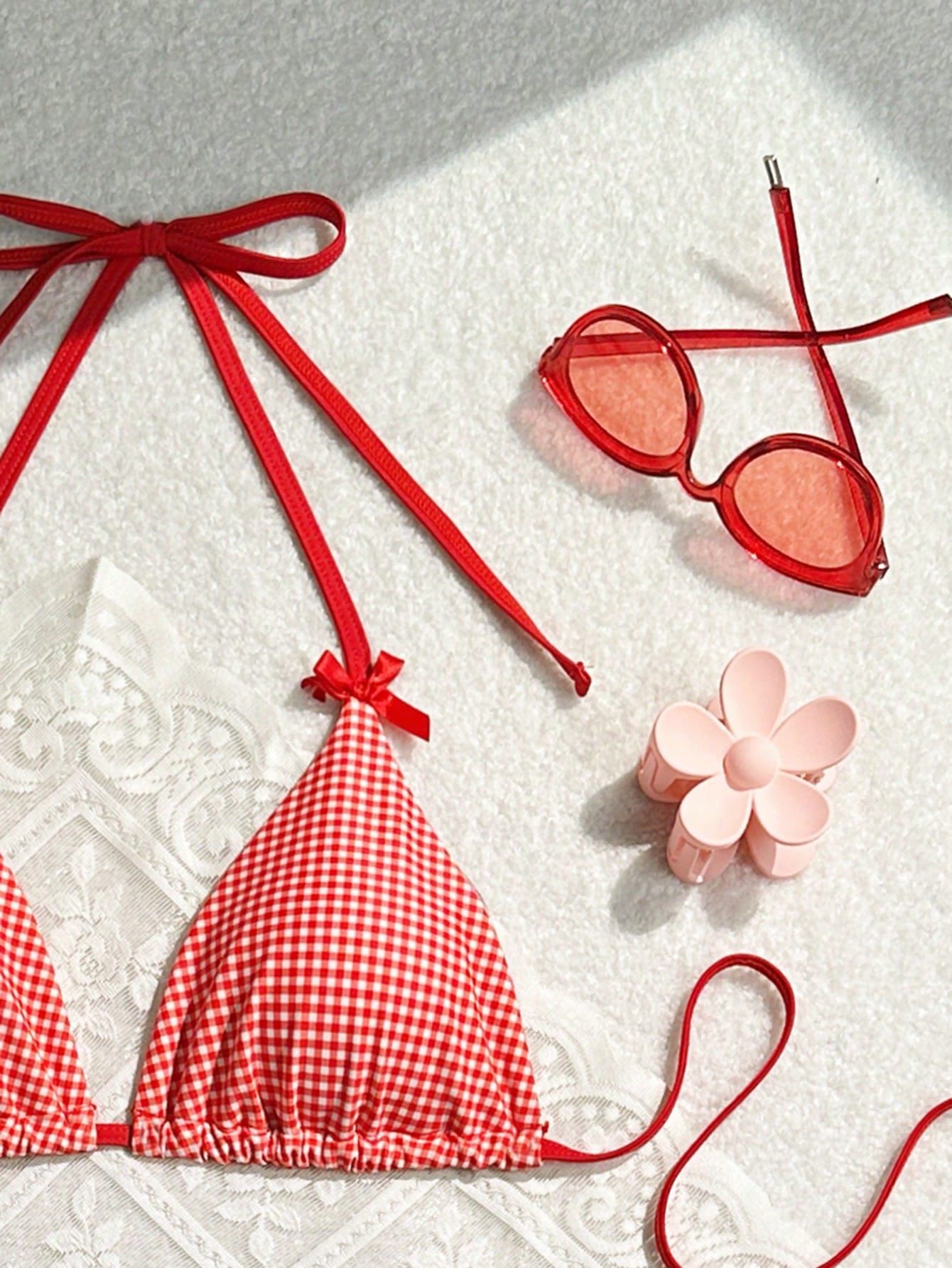 2024 여름 새로운 달콤한 스타일 활 꽃 격자 무늬 여성 분할 휴일 수영복 크로스 국경 비키니