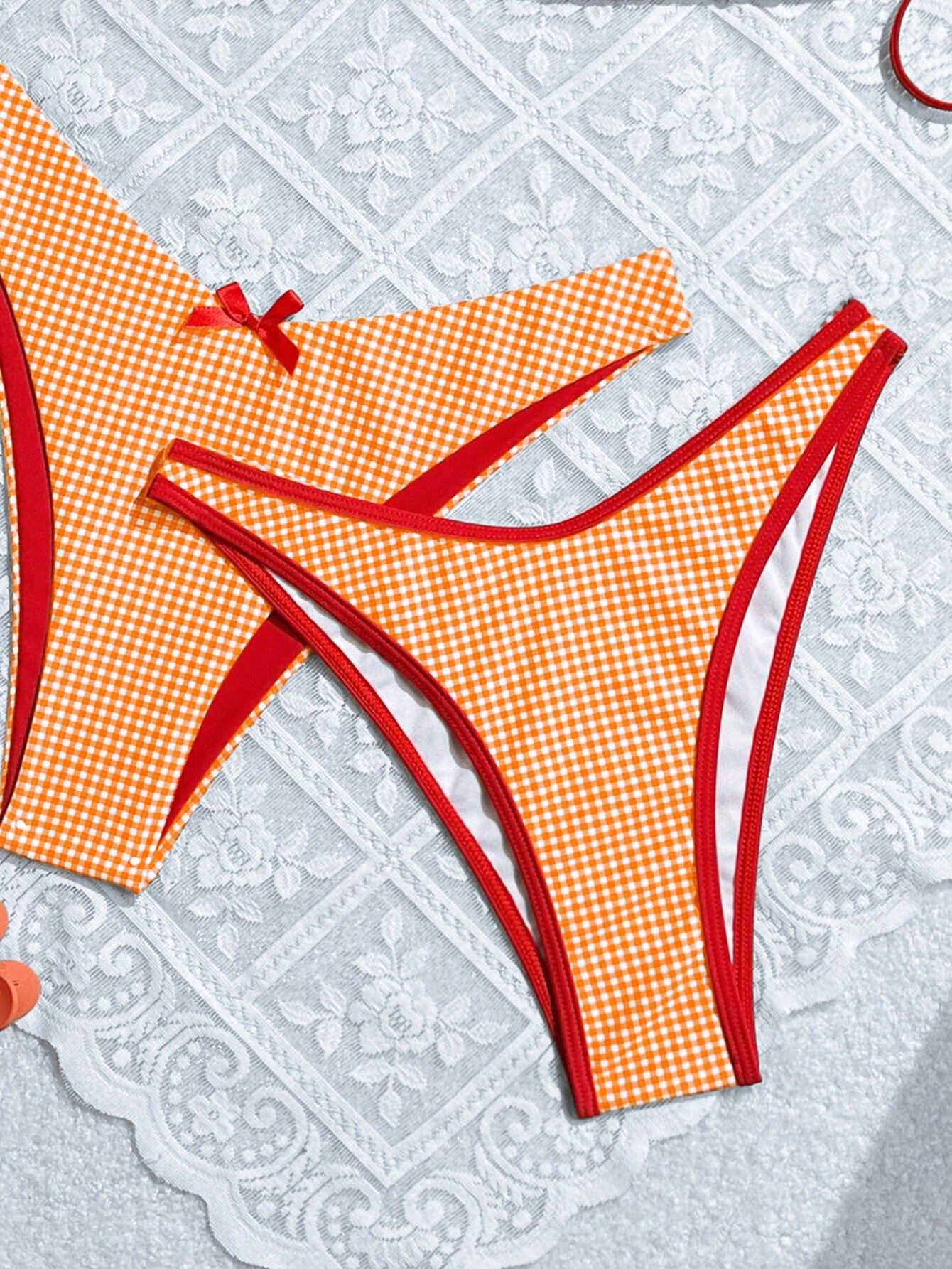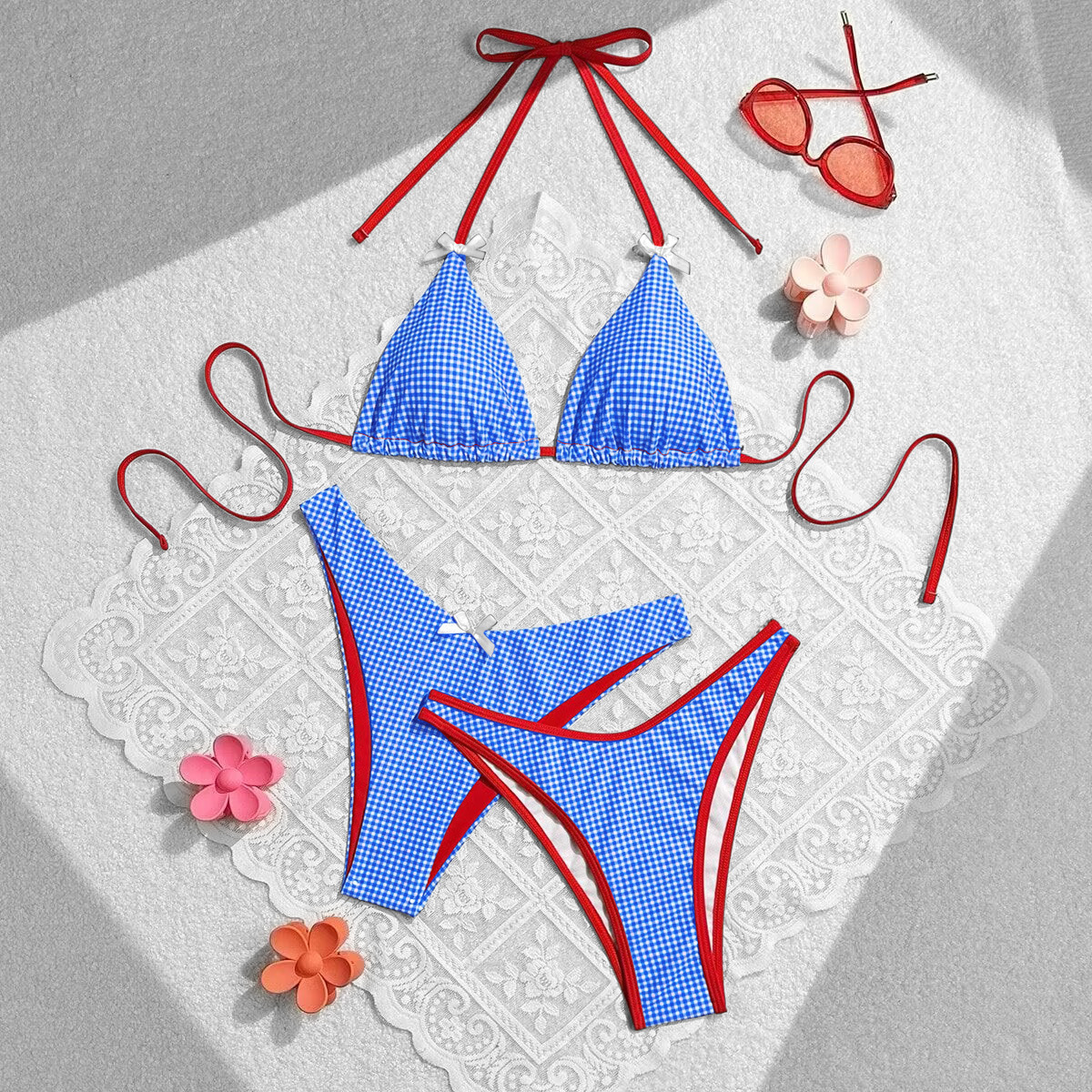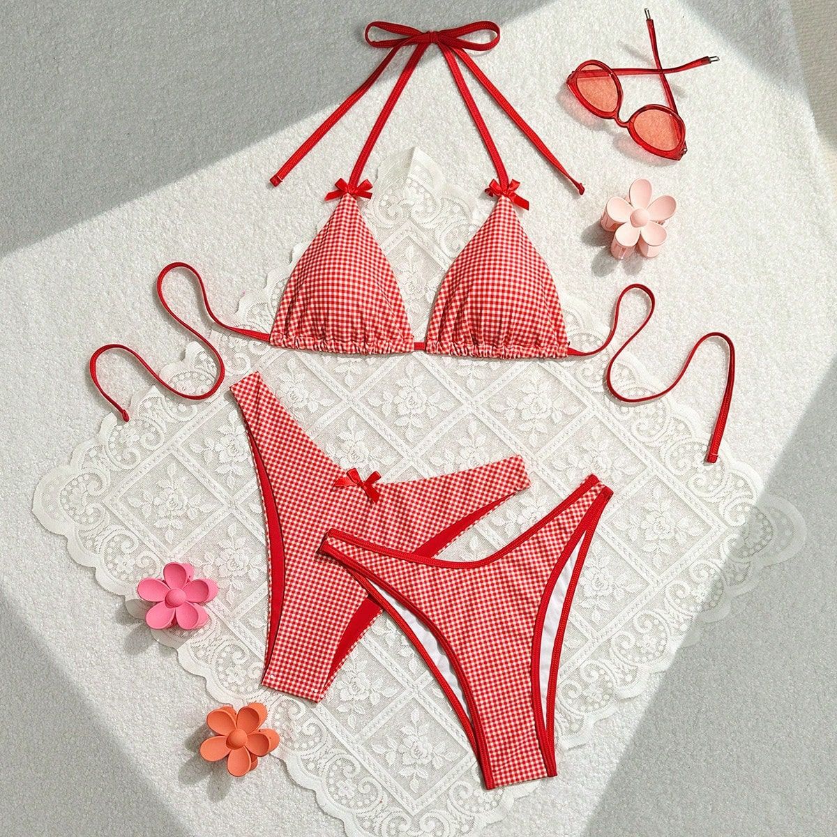 2024 여름 새로운 달콤한 스타일 활 꽃 격자 무늬 여성 분할 휴일 수영복 크로스 국경 비키니