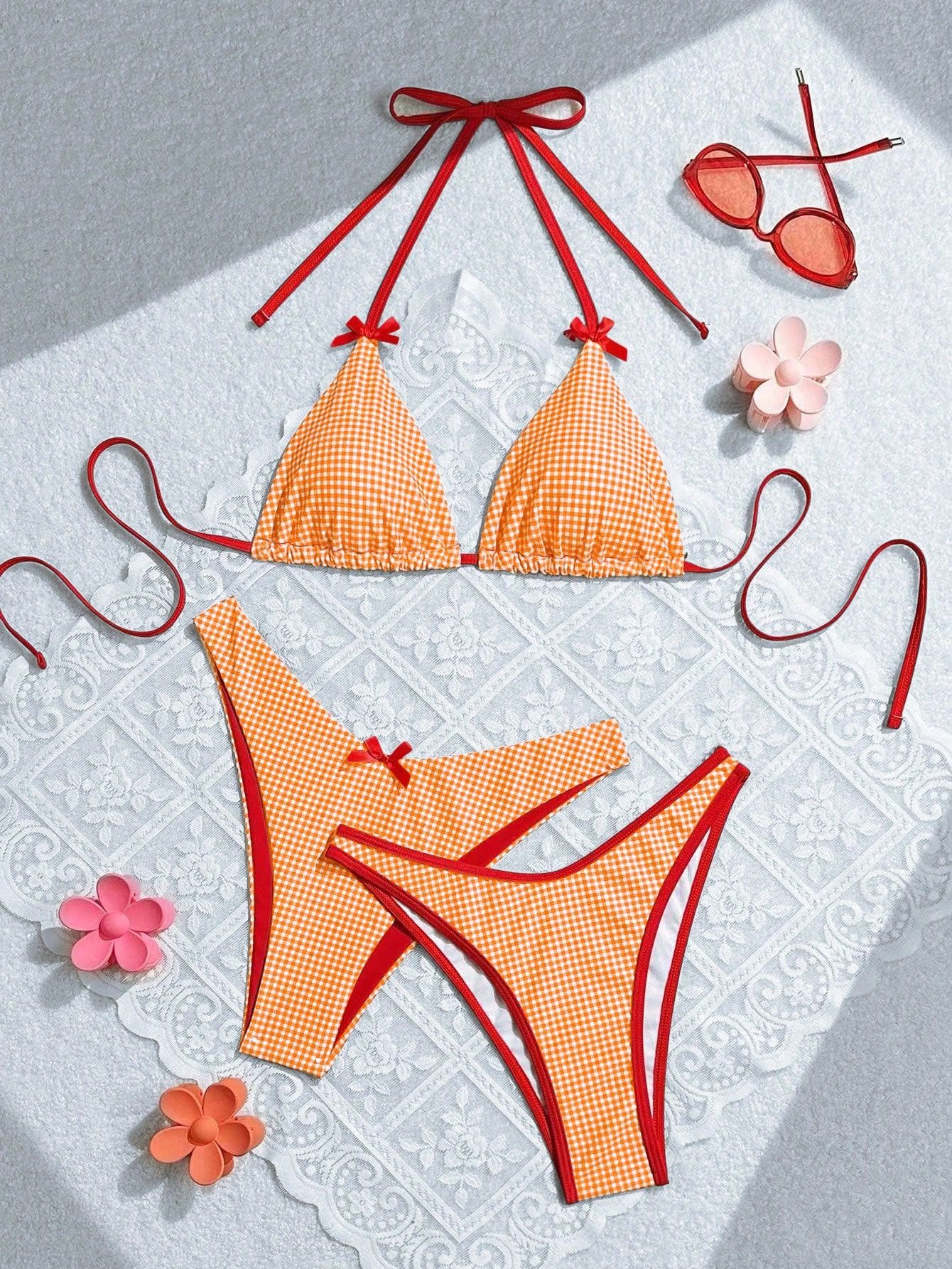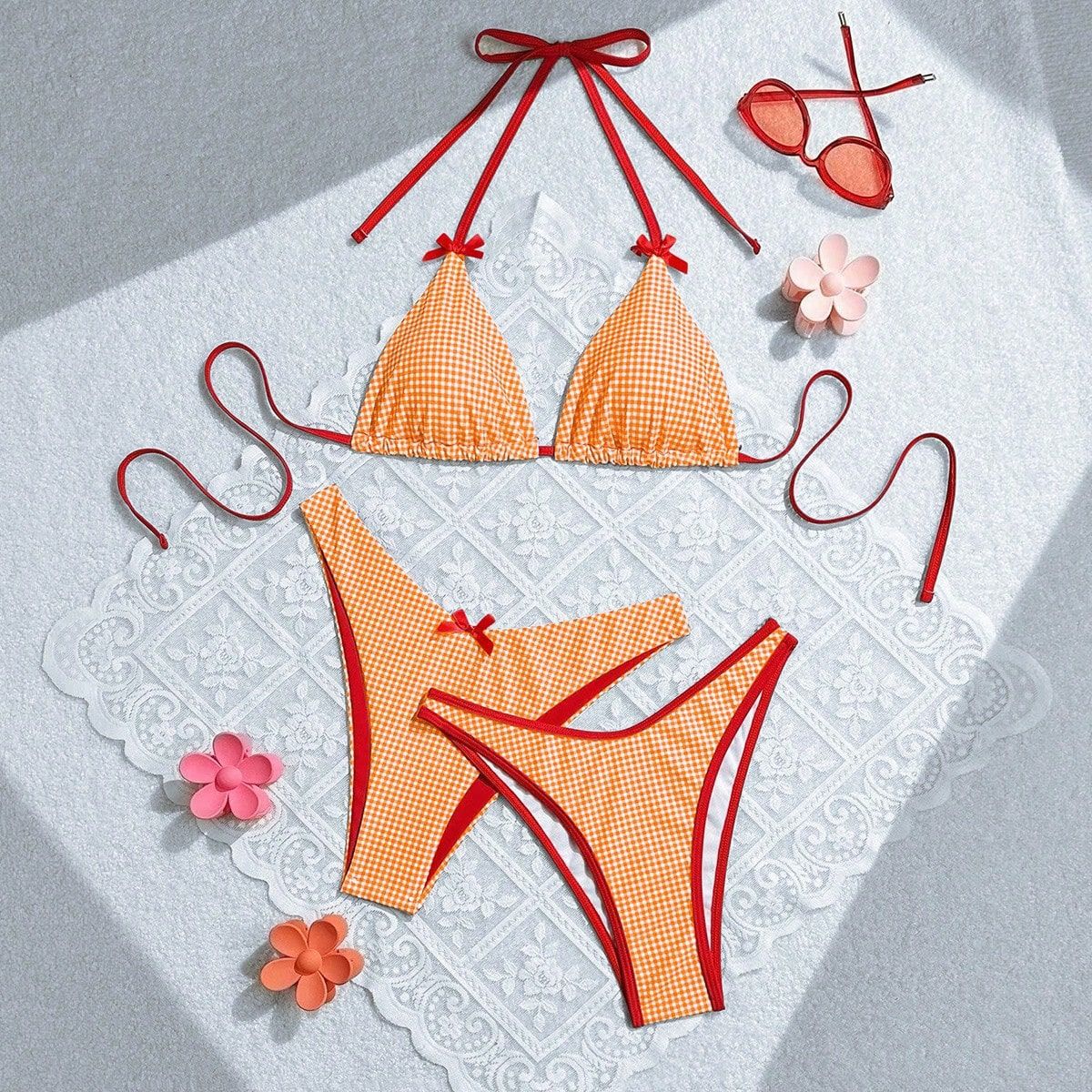 2024 여름 새로운 달콤한 스타일 활 꽃 격자 무늬 여성 분할 휴일 수영복 크로스 국경 비키니스토어 가기