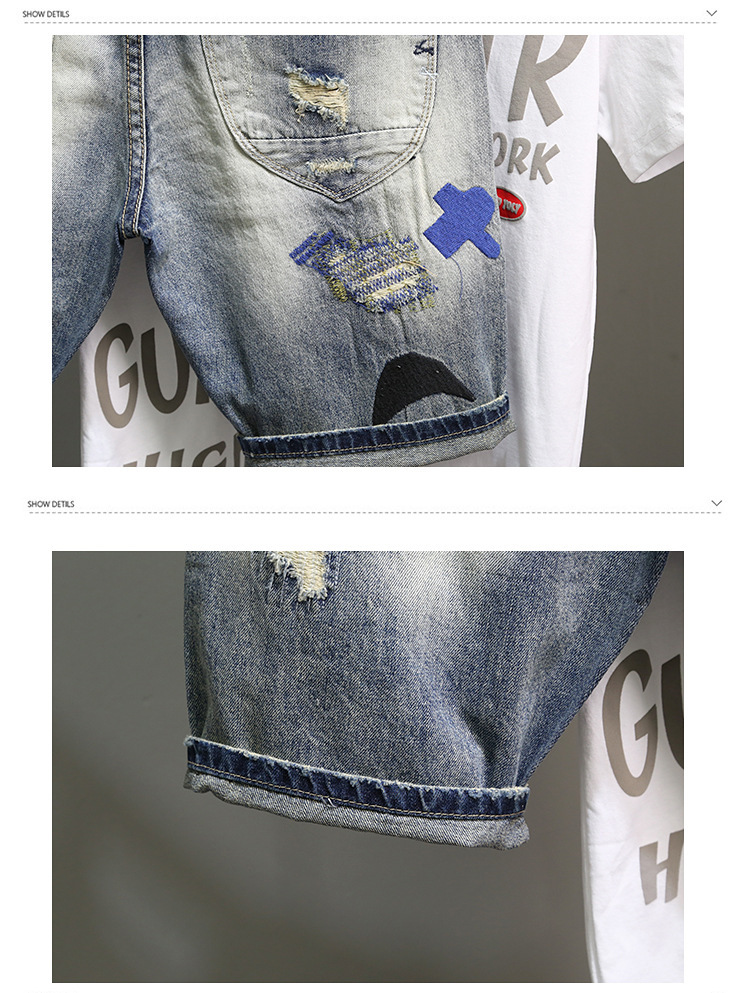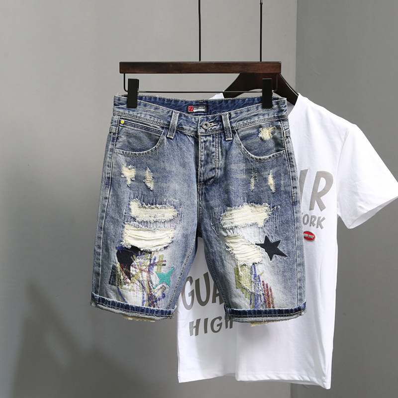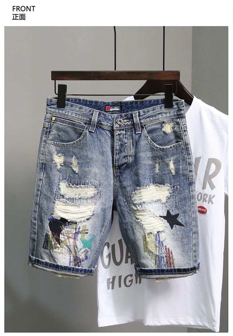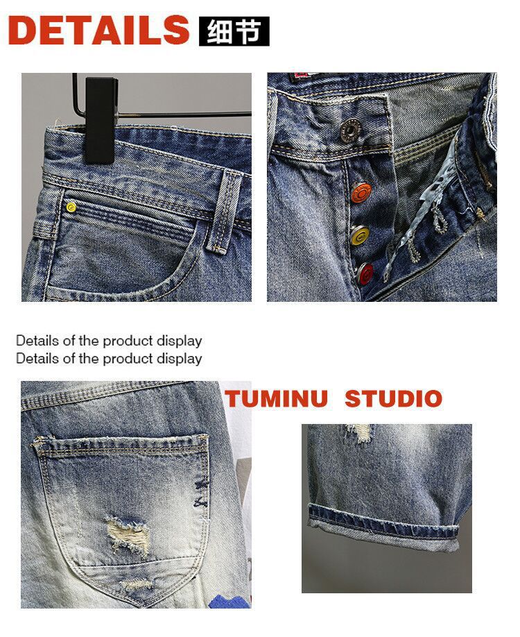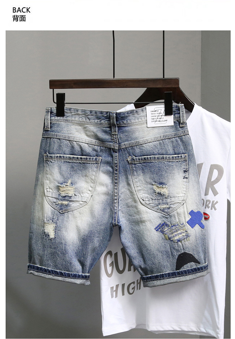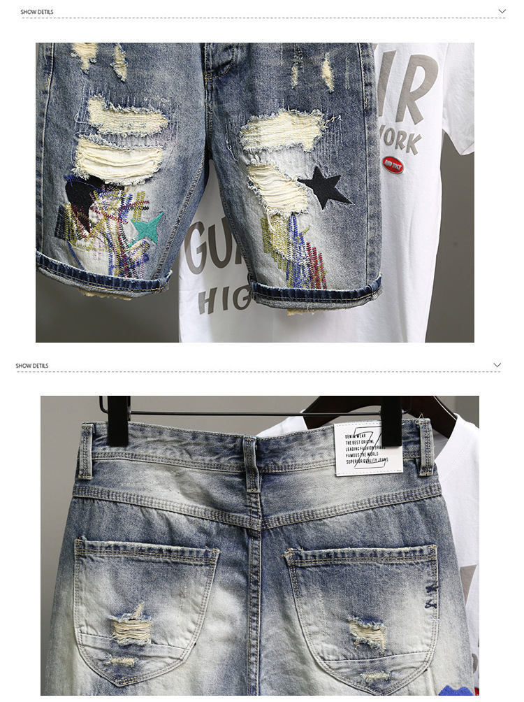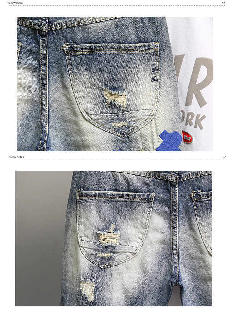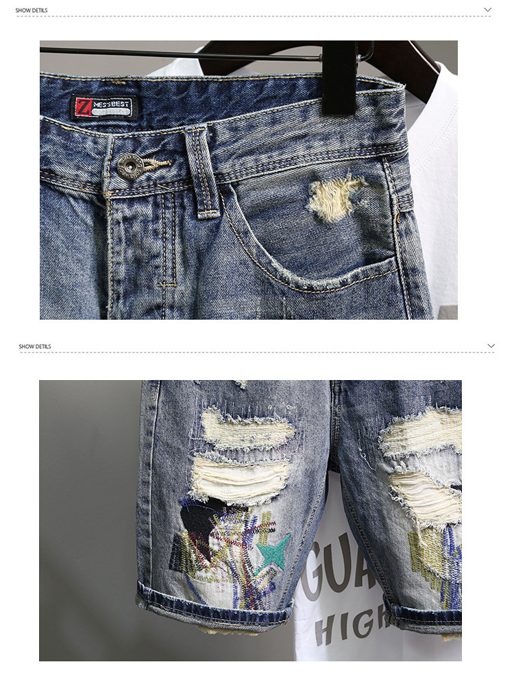 찢어진 데님 반바지를 입은 남자 고양이 바늘 스티치 자수 하이 스트리트 강아지 잘 생긴 거지 바지 슬림 핏 홀핏 만찬 바지스토어 가기