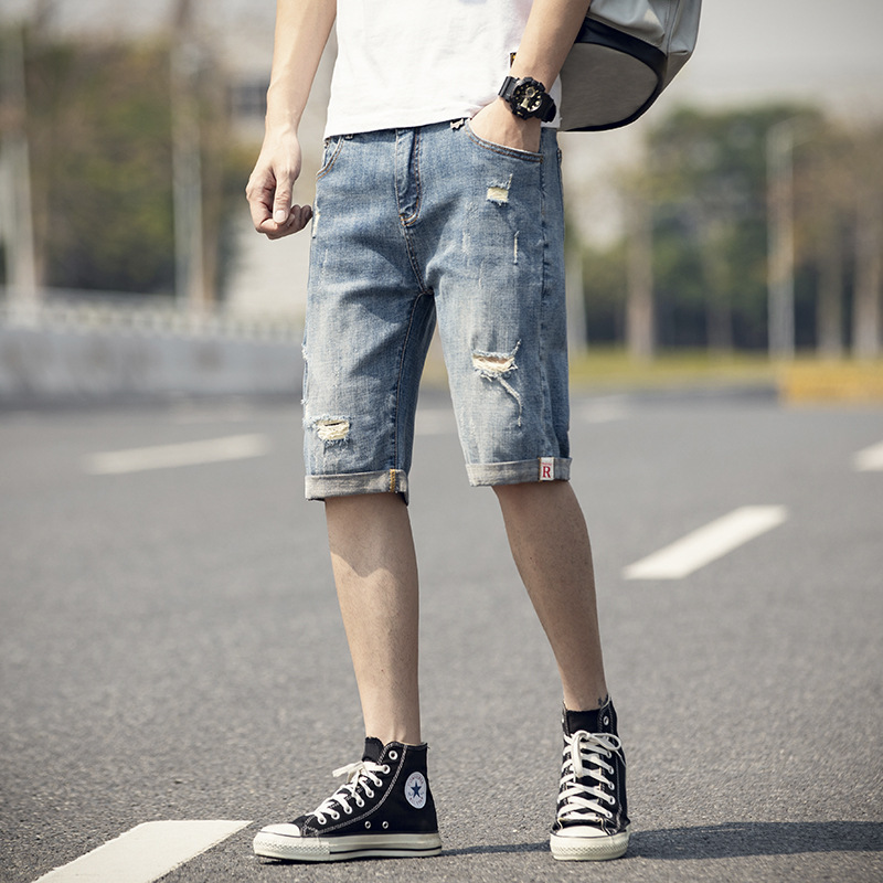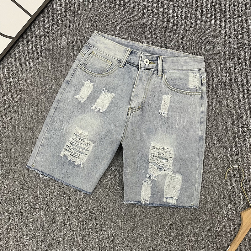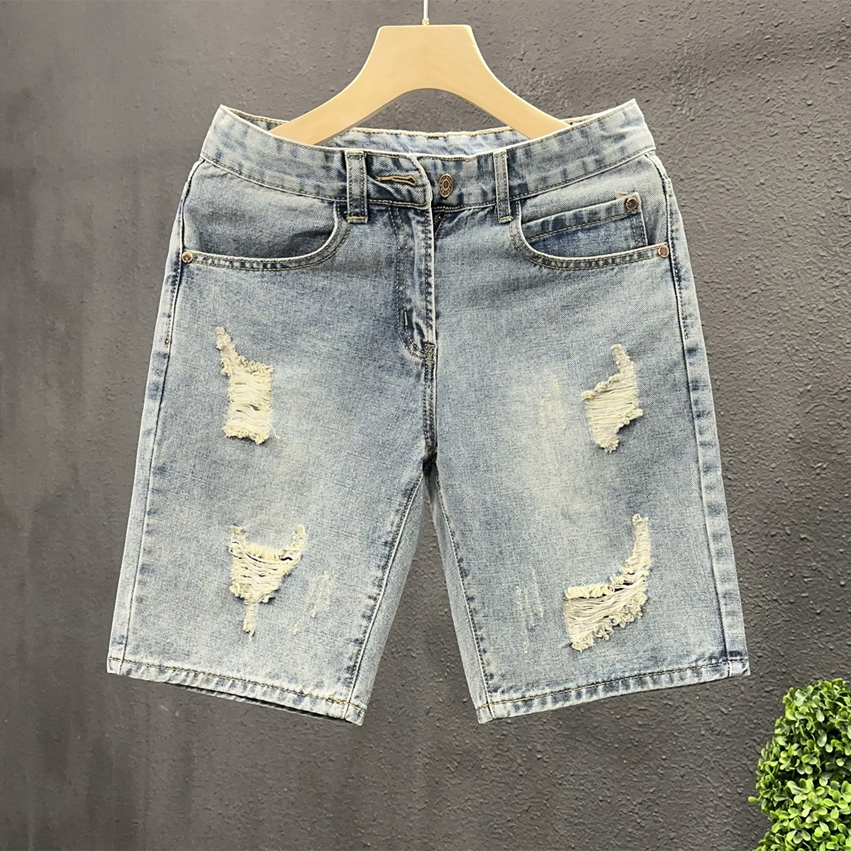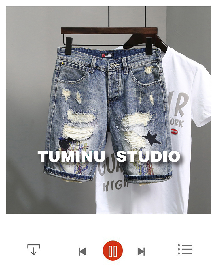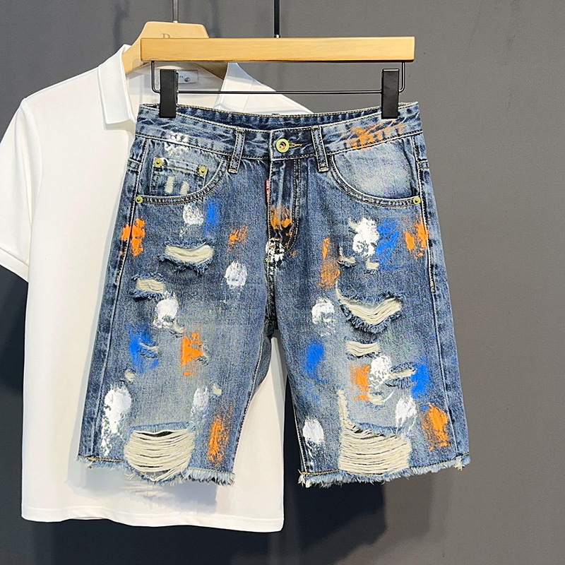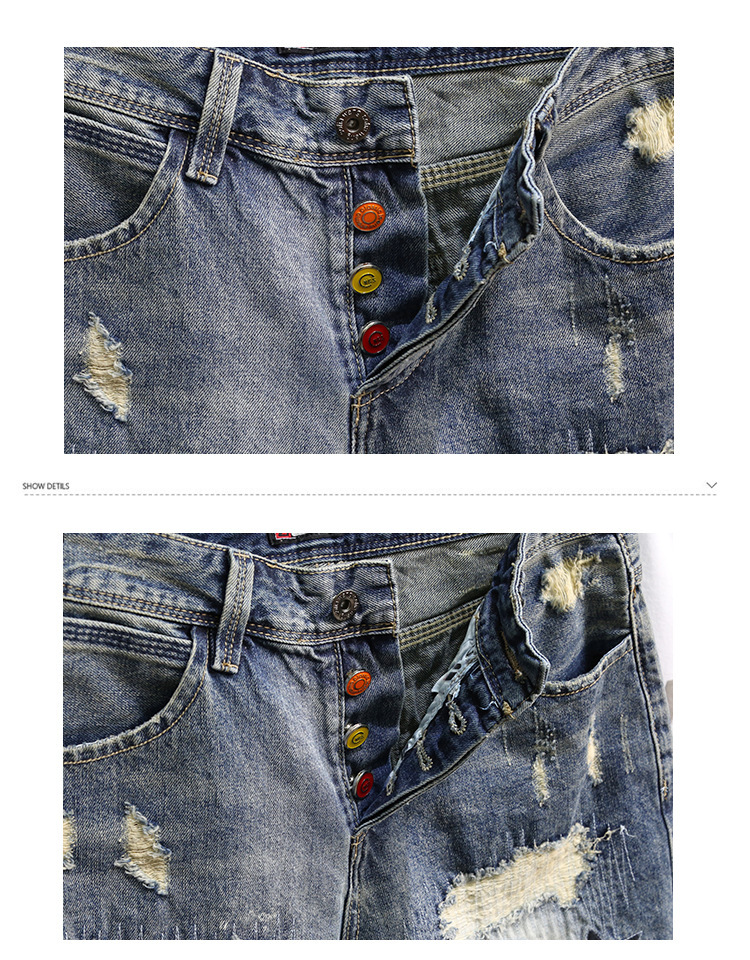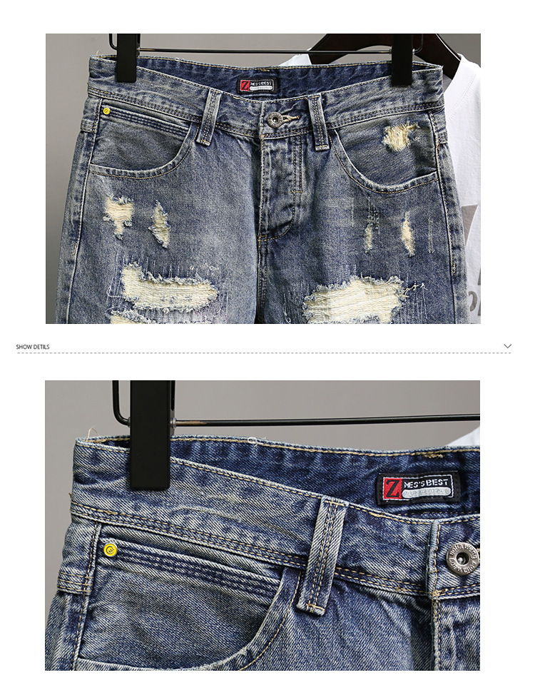 찢어진 데님 반바지를 입은 남자 고양이 바늘 스티치 자수 하이 스트리트 강아지 잘 생긴 거지 바지 슬림 핏 홀핏 만찬 바지스토어 가기