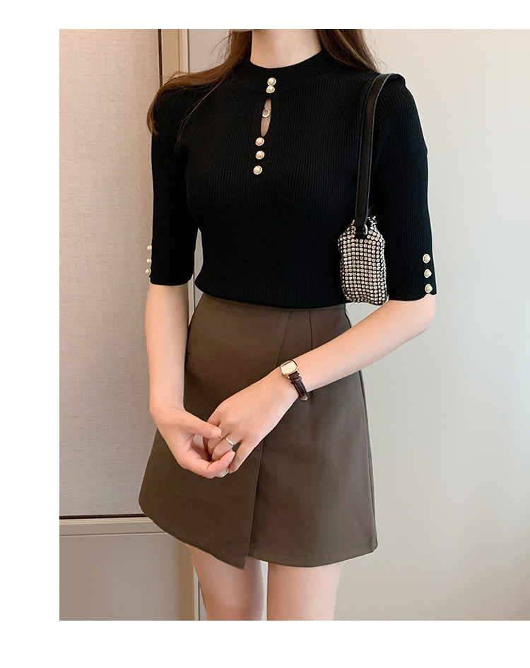 봄과 가을 디자인 센스 틈새 외부 반소매 니트 탑 티셔츠를 입고 여성용 세트 내부 얇은 미드 슬리브베이스 셔츠