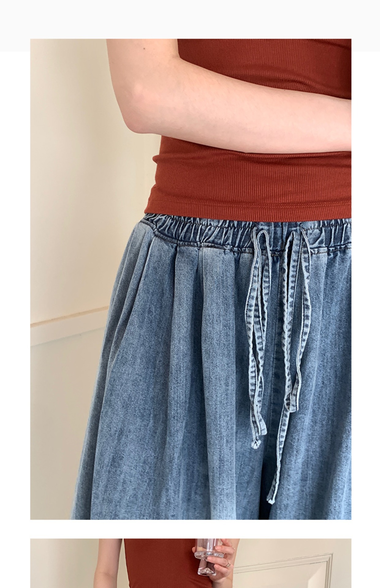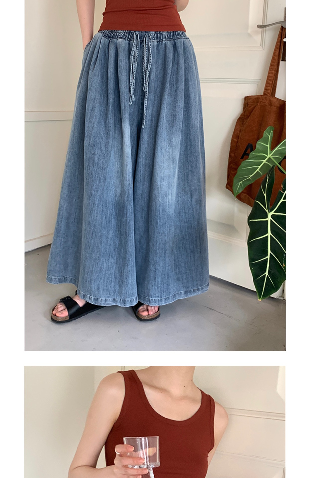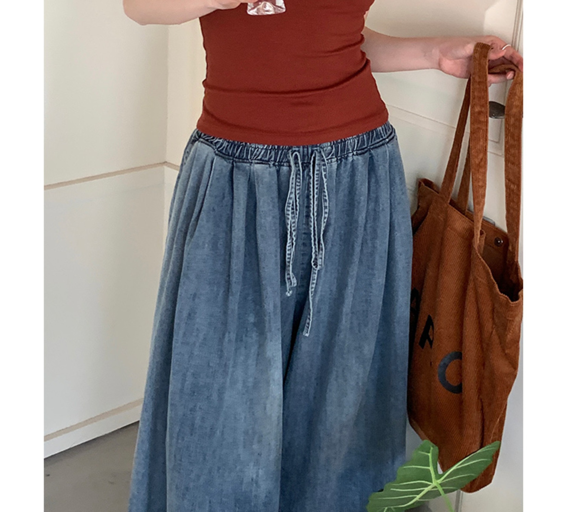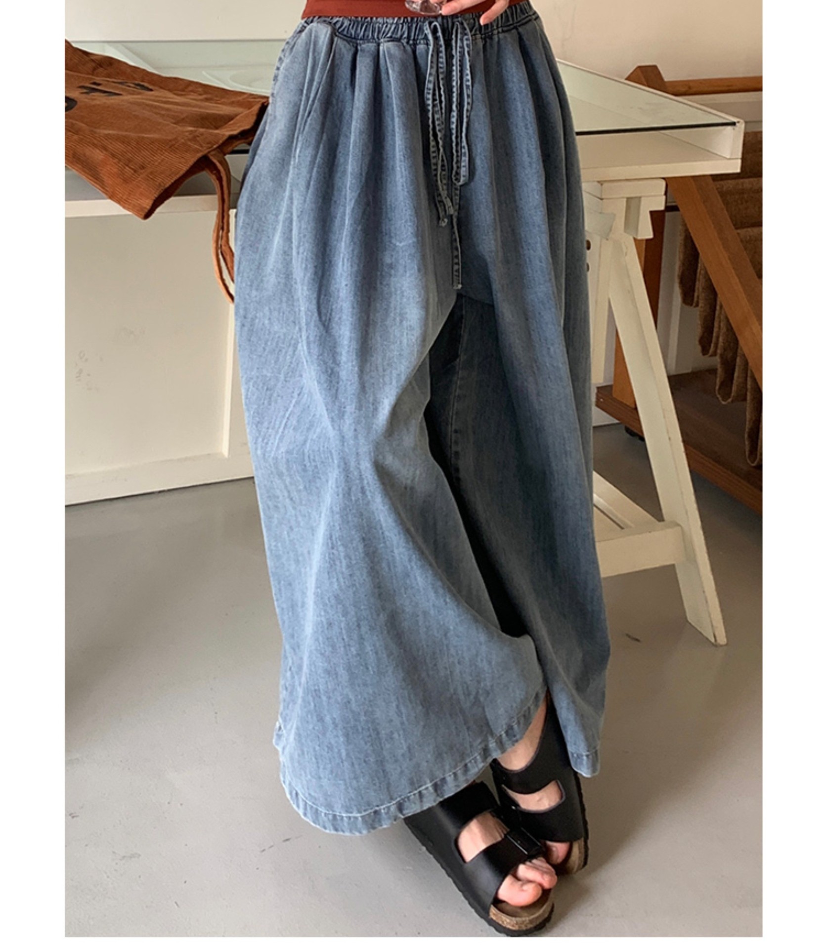 레이스업 데님 넓은 다리 바지 봄과 가을 새로운 예술적 느슨한 캐주얼 세척 슬리밍 바지 여성용 트렌디 스커트 바지
