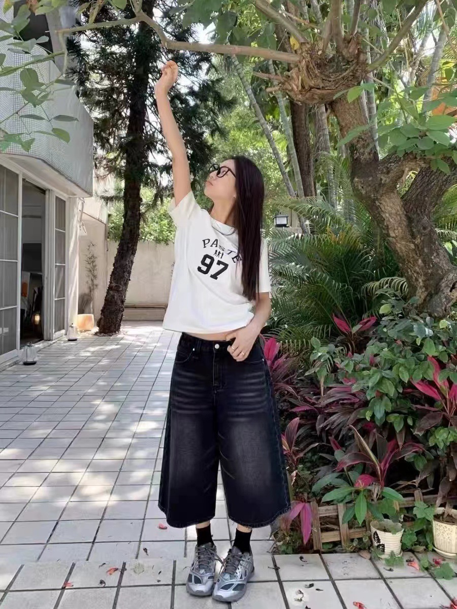 미국 블랙 데님 카프리 바지 여자 여름 레트로 바지 느슨한 바지 스트레이트 바지 플러스 사이즈 반바지 튀김스토어 가기