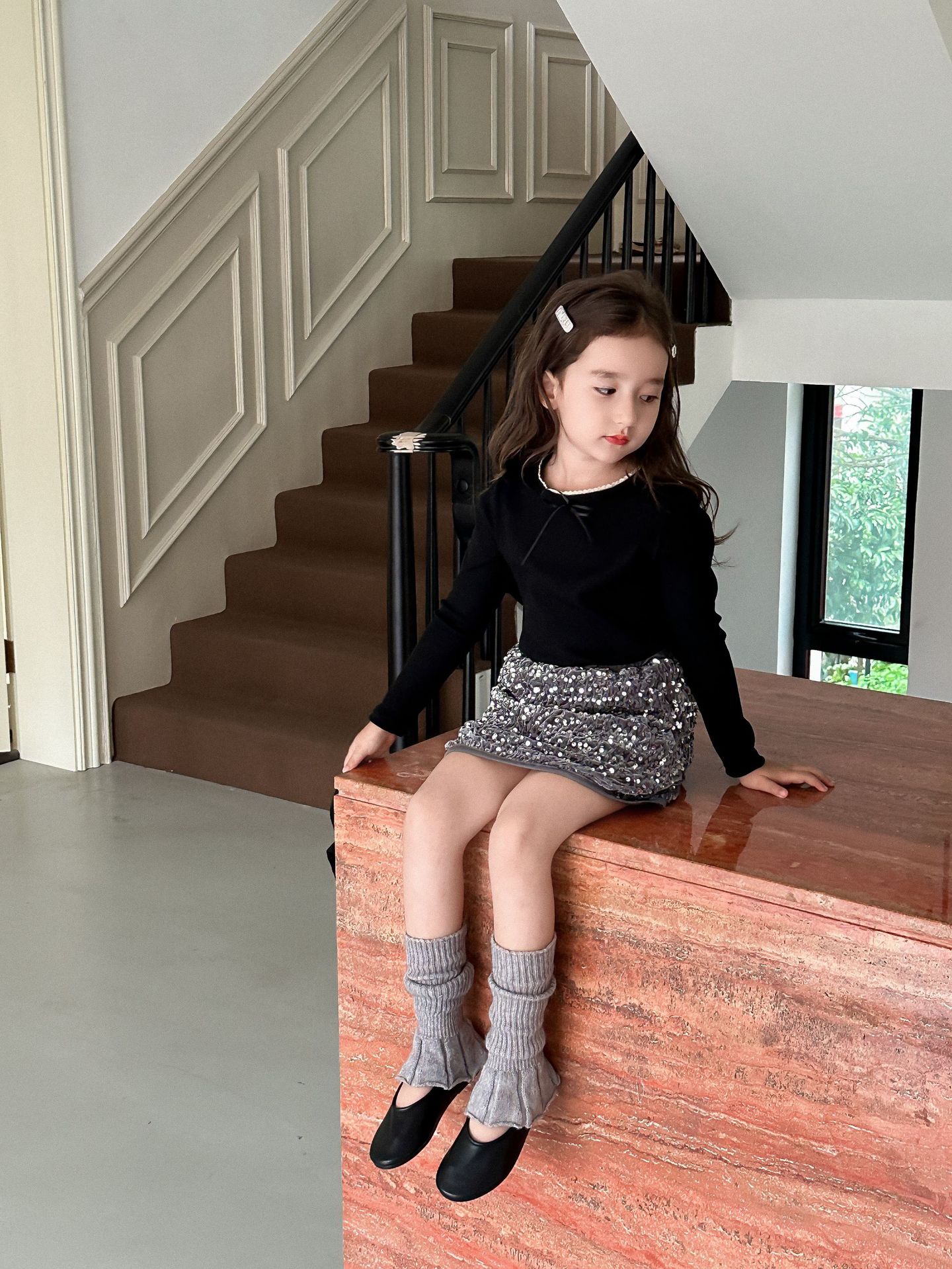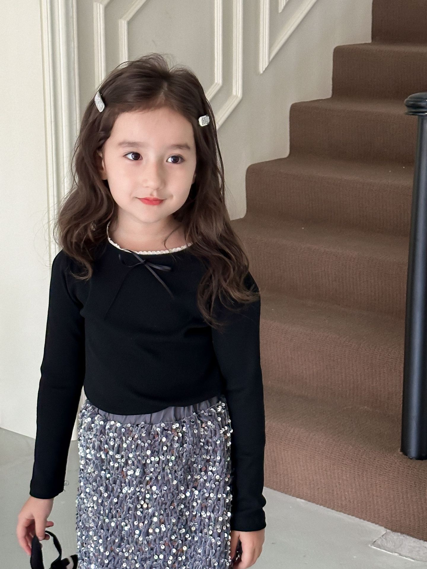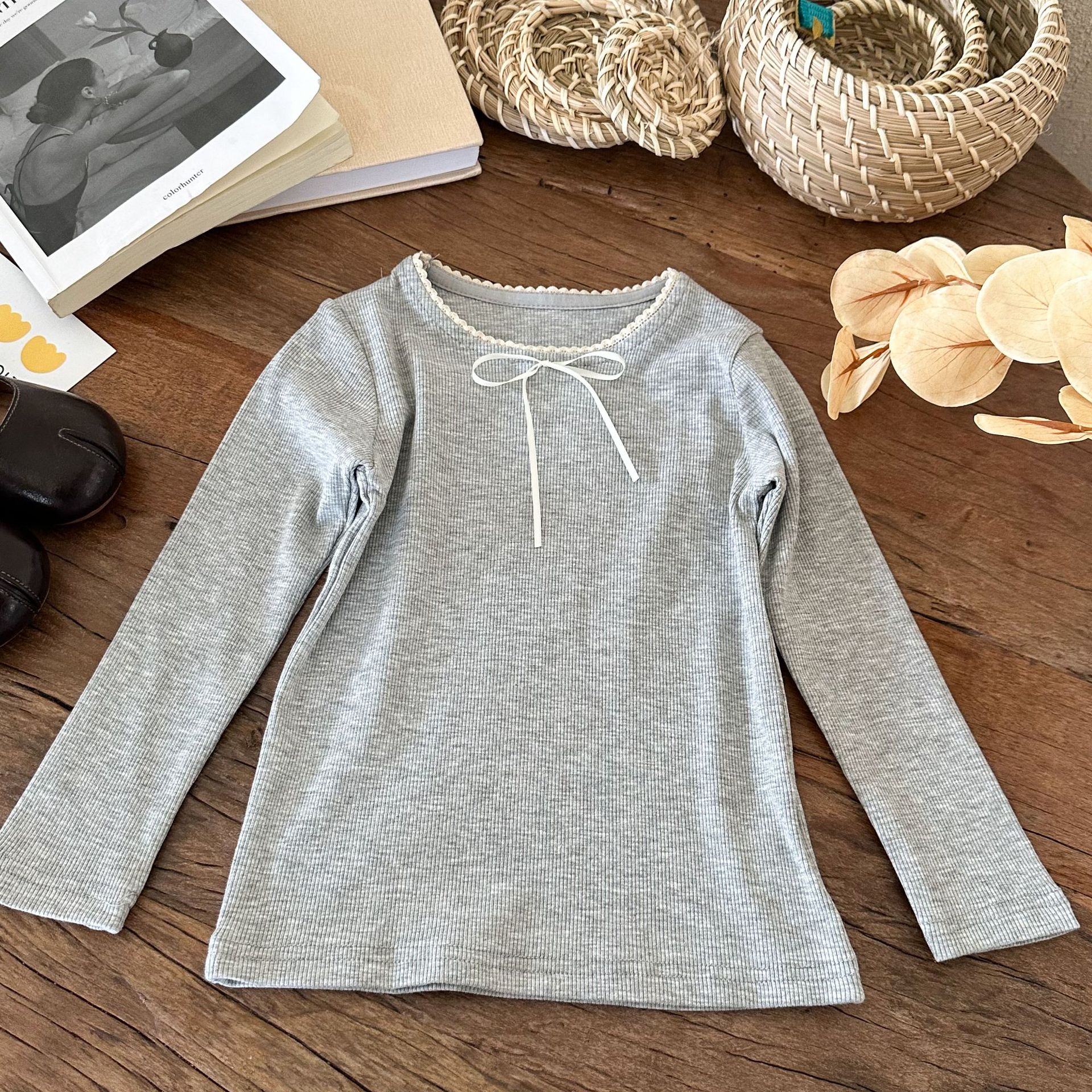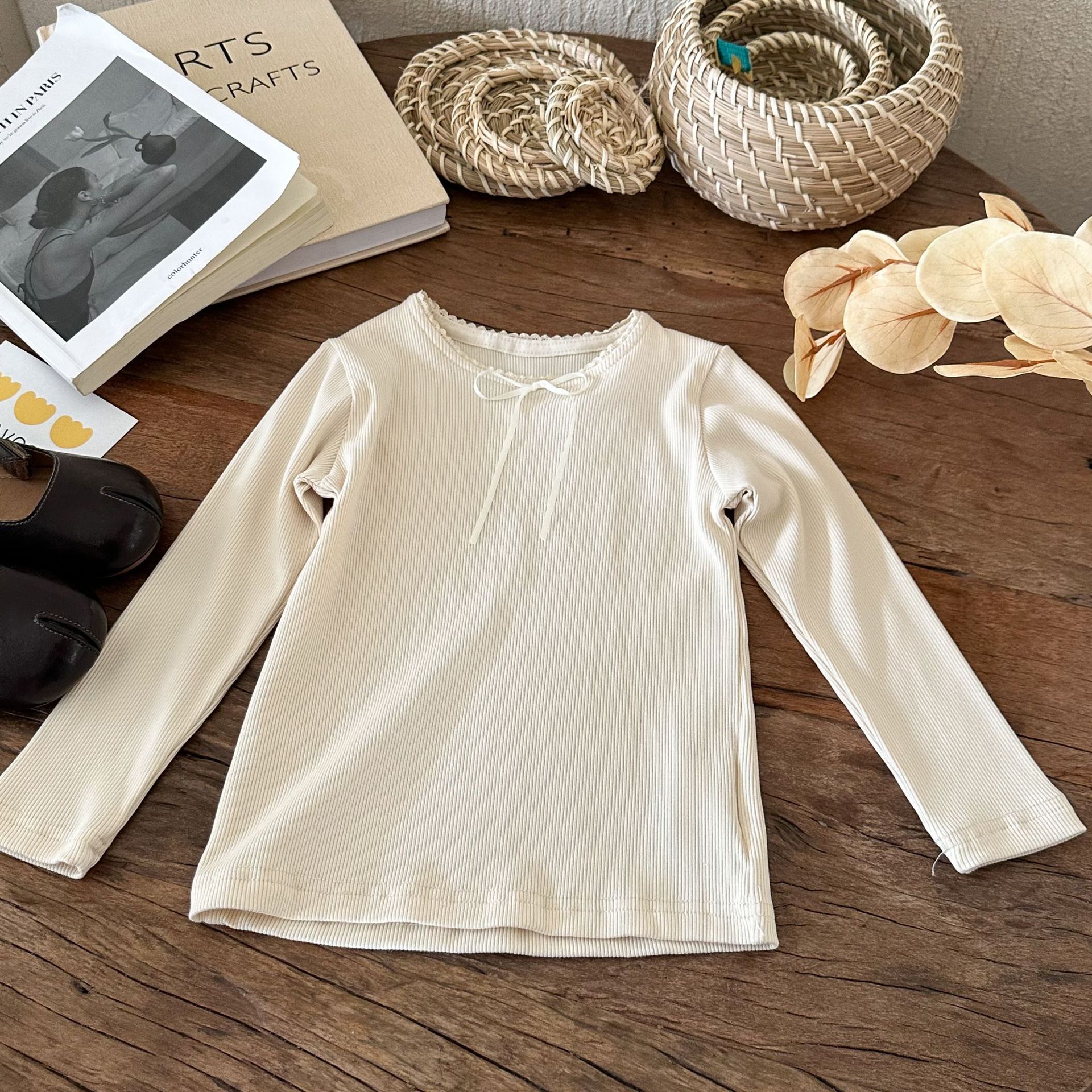 여아 레이스 칼라 밑단 셔츠 2025 가을 신상 한국 스타일 고탄성 긴팔 T 아동용 리본 탑