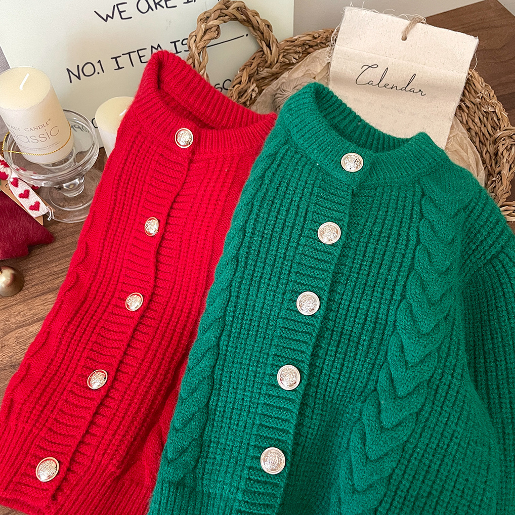 2026년 신상 아기 가을 겨울 의류 여아용 빨간색 녹색 가디건 두꺼운 니트 스웨터 코트 트렌디한 가을 겨울스토어 가기