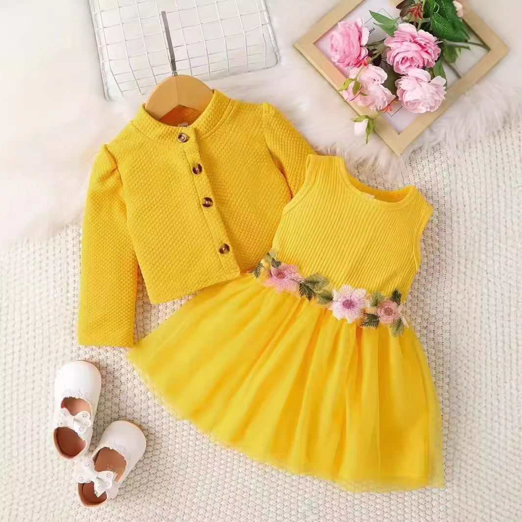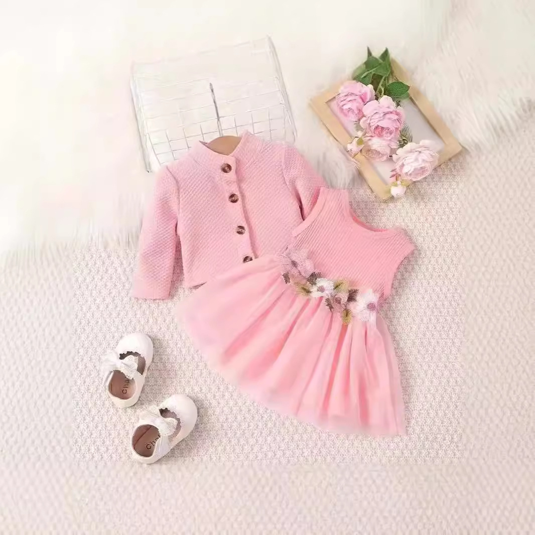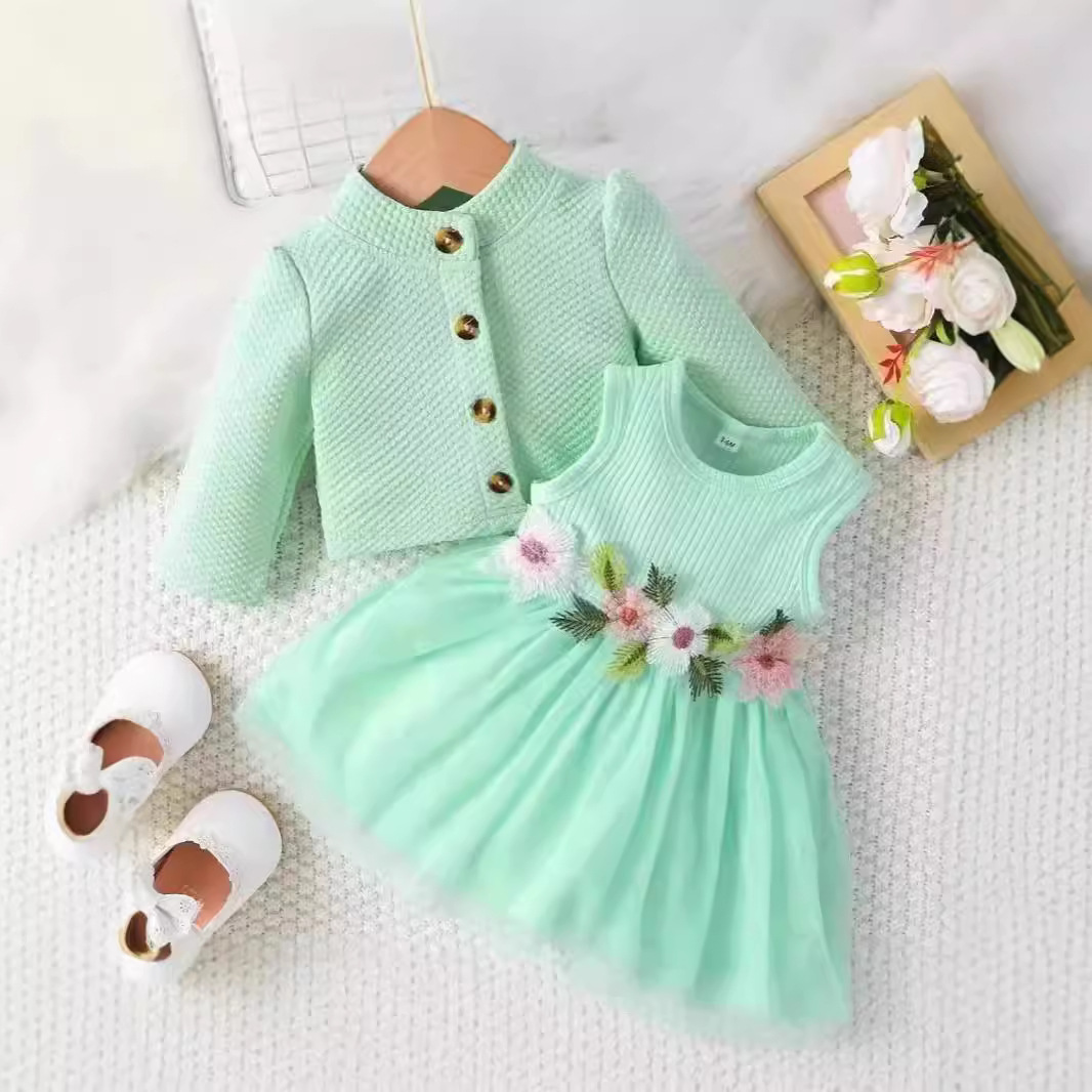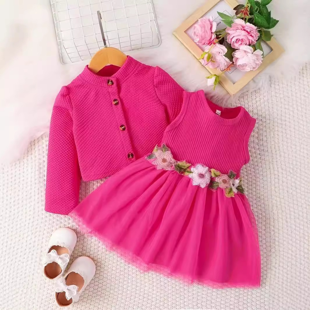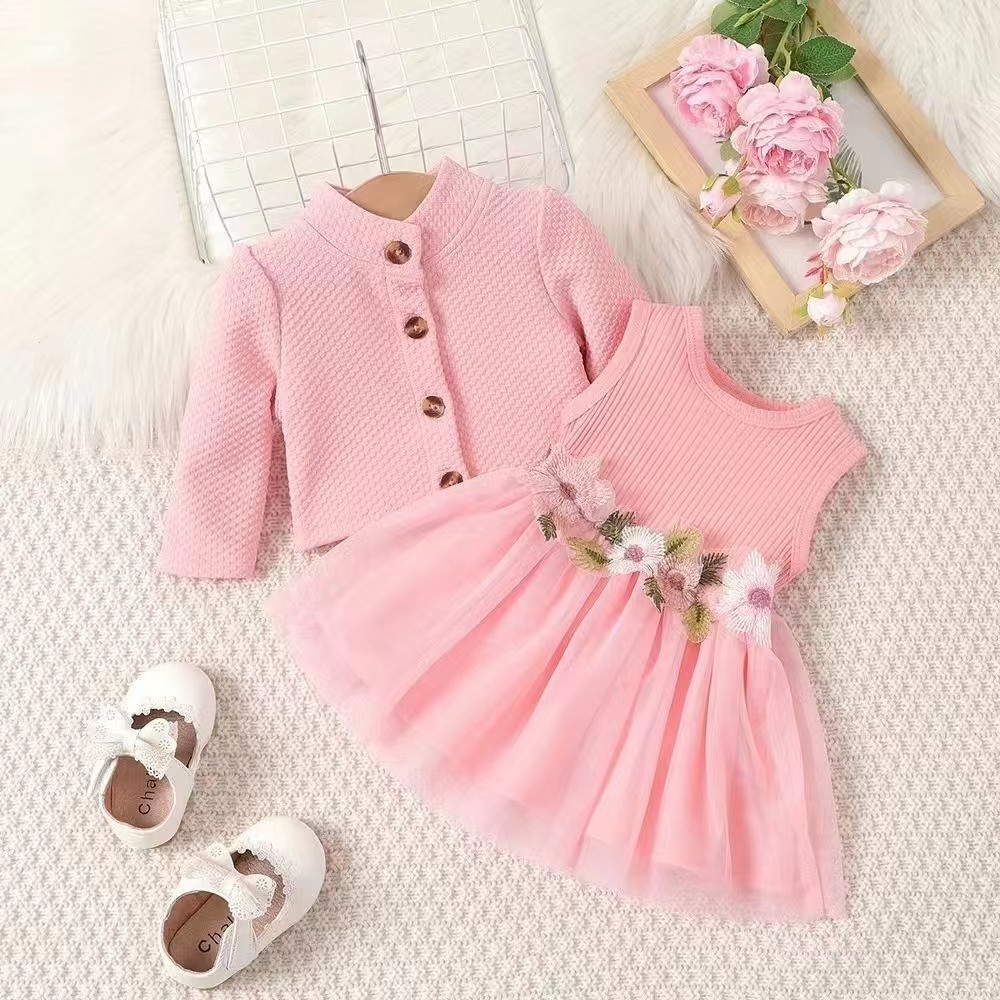 INS 유아 여아 허리 부분 꽃무늬 디자인 조끼 스타일 메쉬 원피스 자켓 꽃자수
