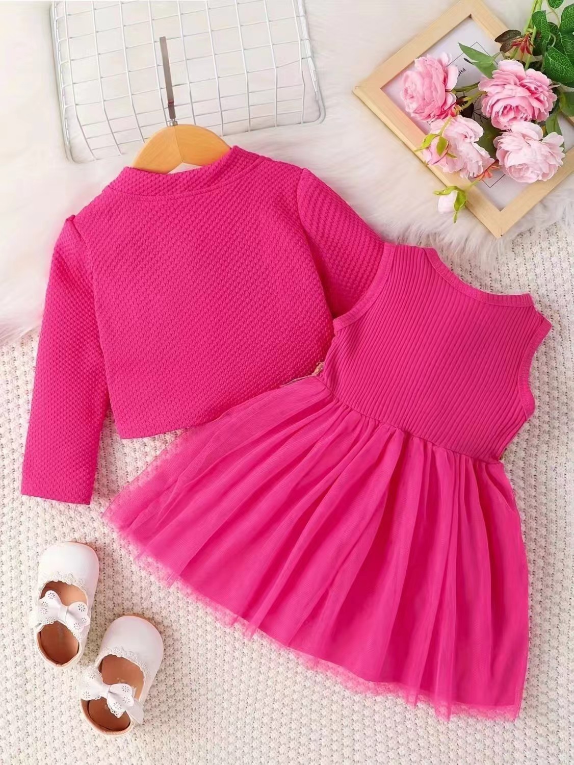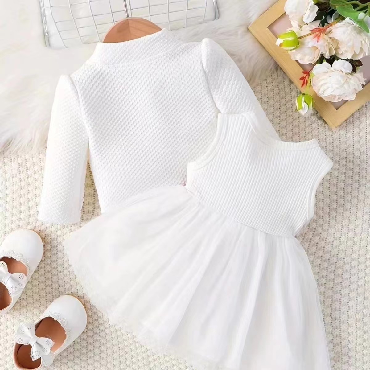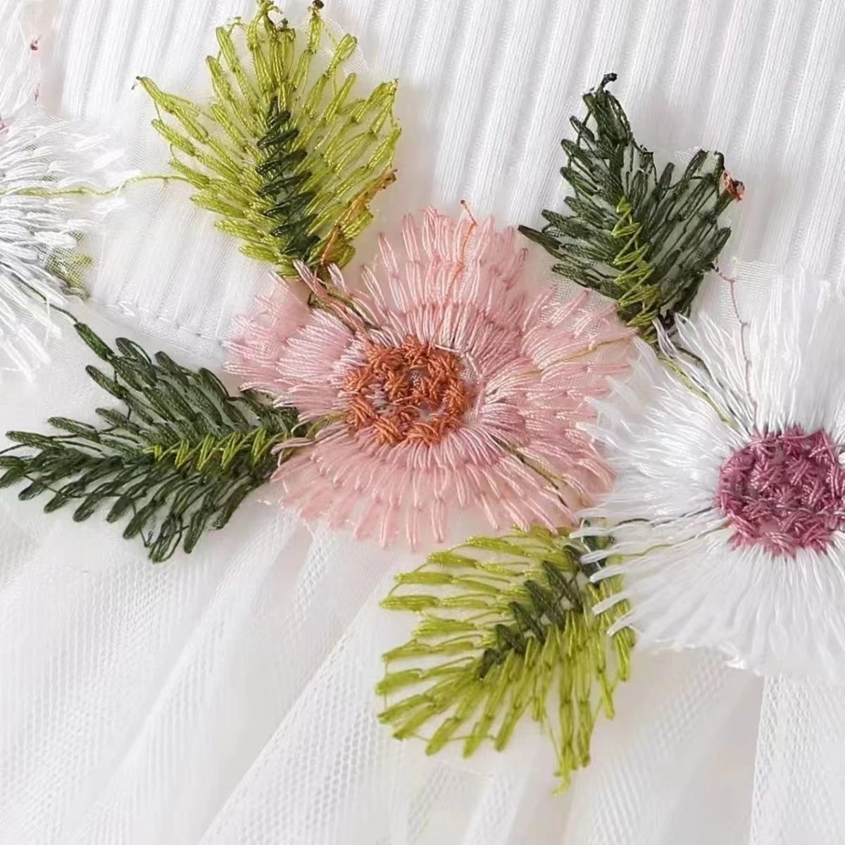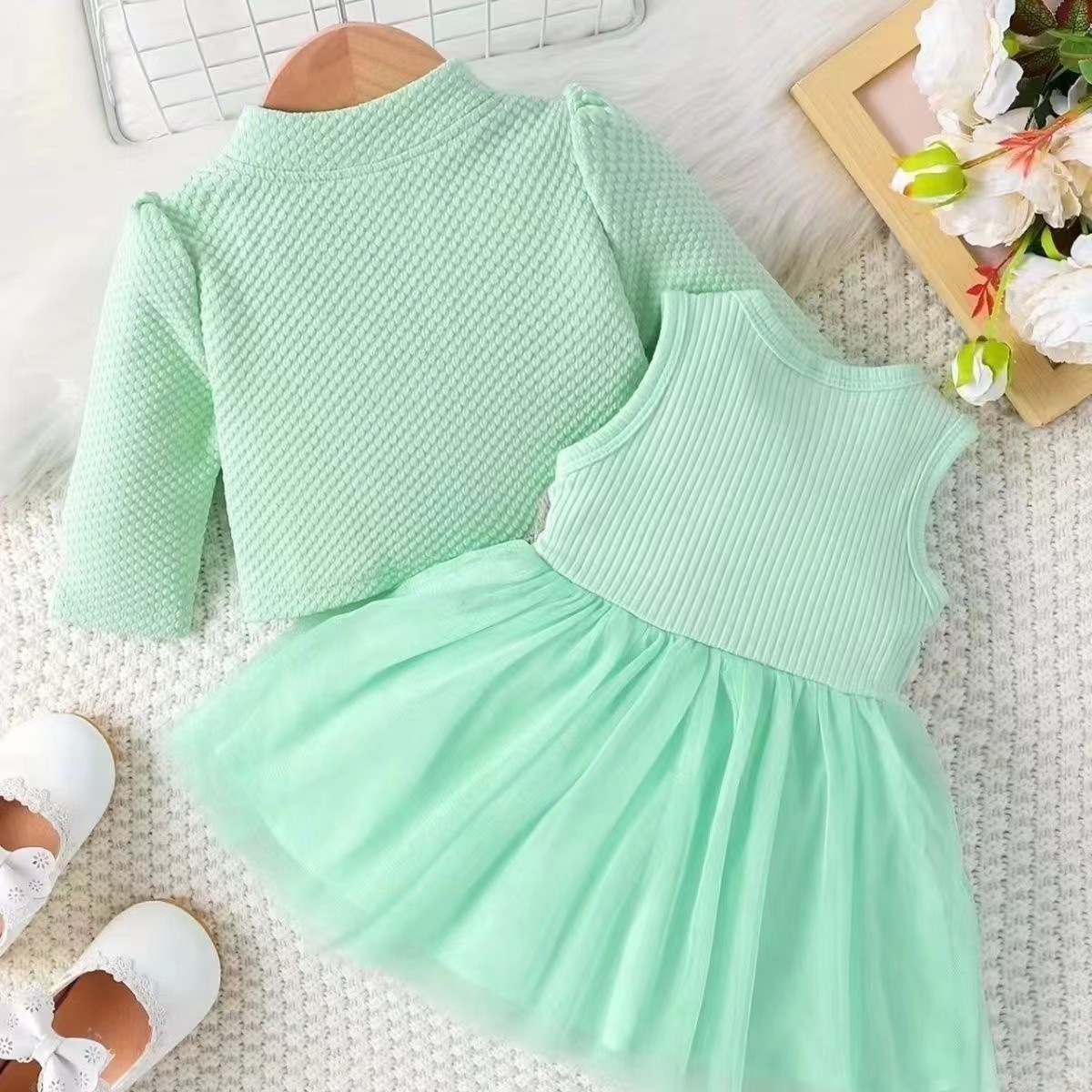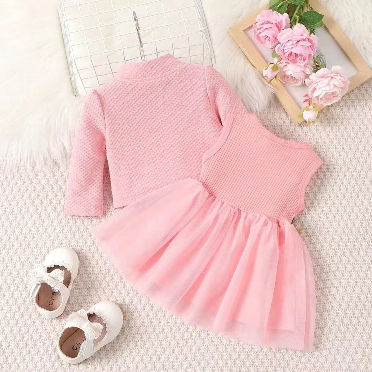 INS 유아 여아 허리 부분 꽃무늬 디자인 조끼 스타일 메쉬 원피스 자켓 꽃자수