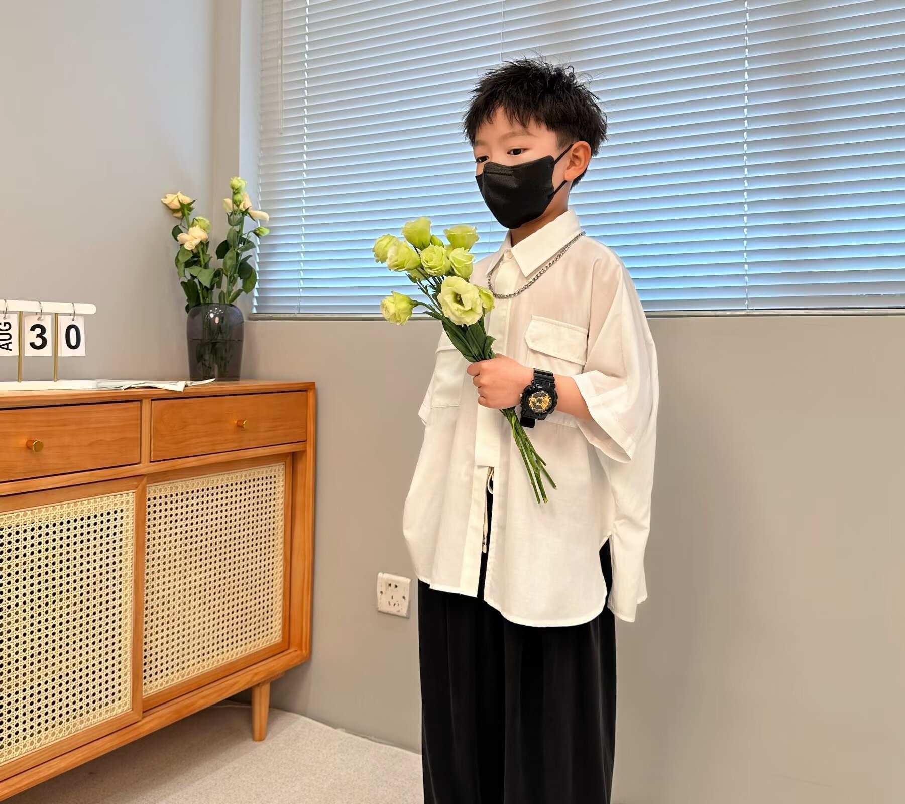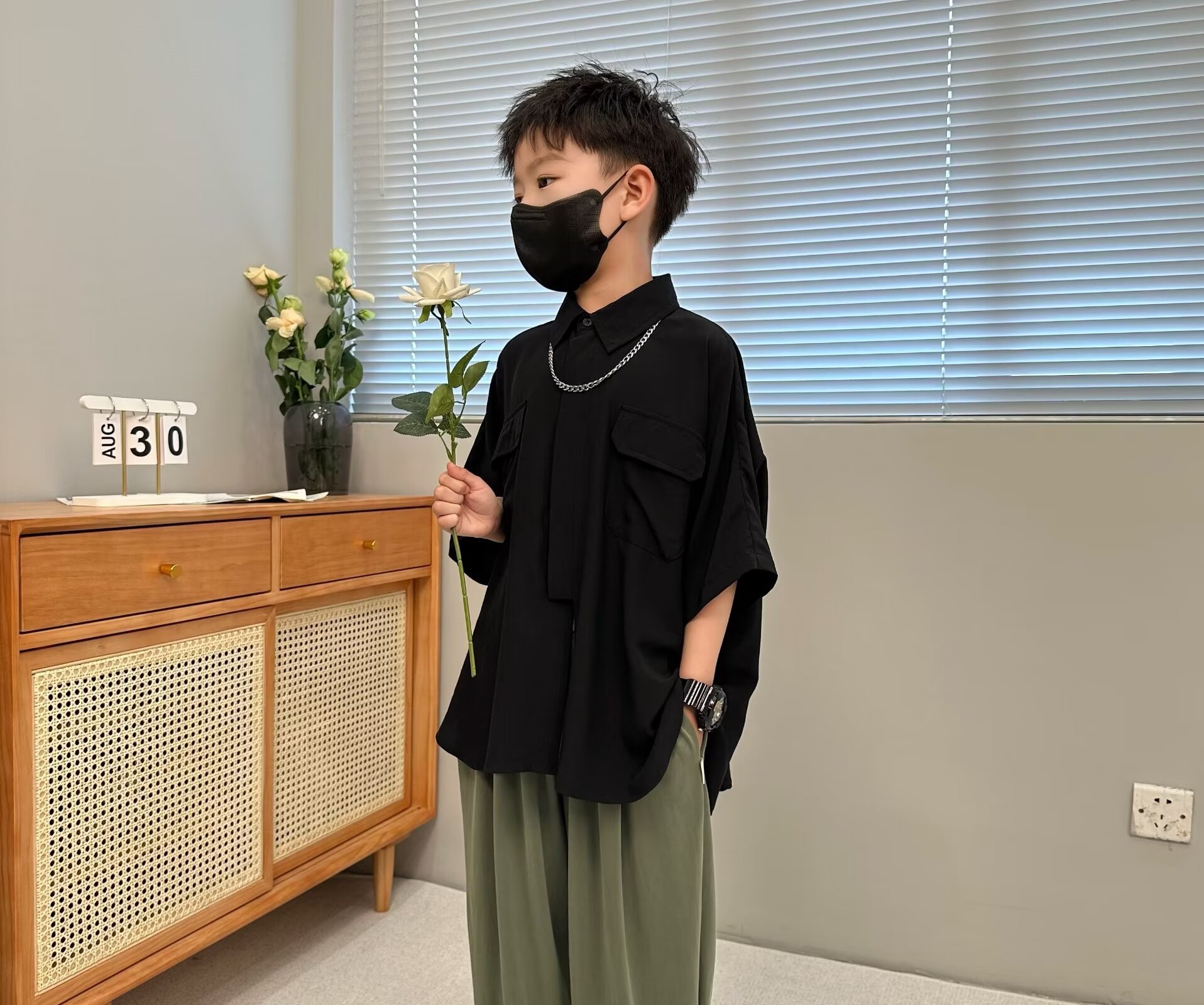 2024 여름 새로운 소년 아이스 실크 2 색 셔츠 대형 어린이 포켓 셔츠 캐주얼 패션 최고 어린이 남성스토어 가기