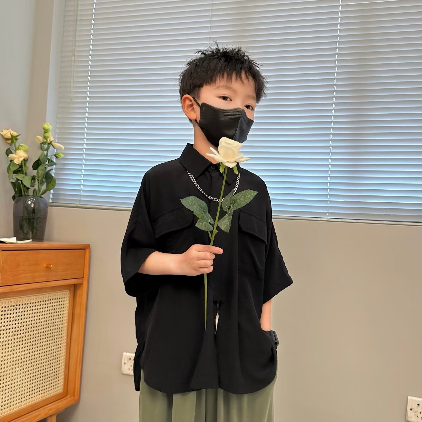 2024 여름 새로운 소년 아이스 실크 2 색 셔츠 대형 어린이 포켓 셔츠 캐주얼 패션 최고 어린이 남성