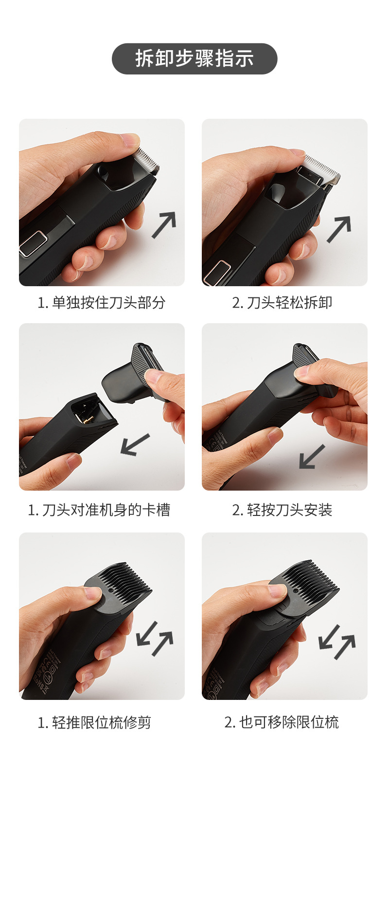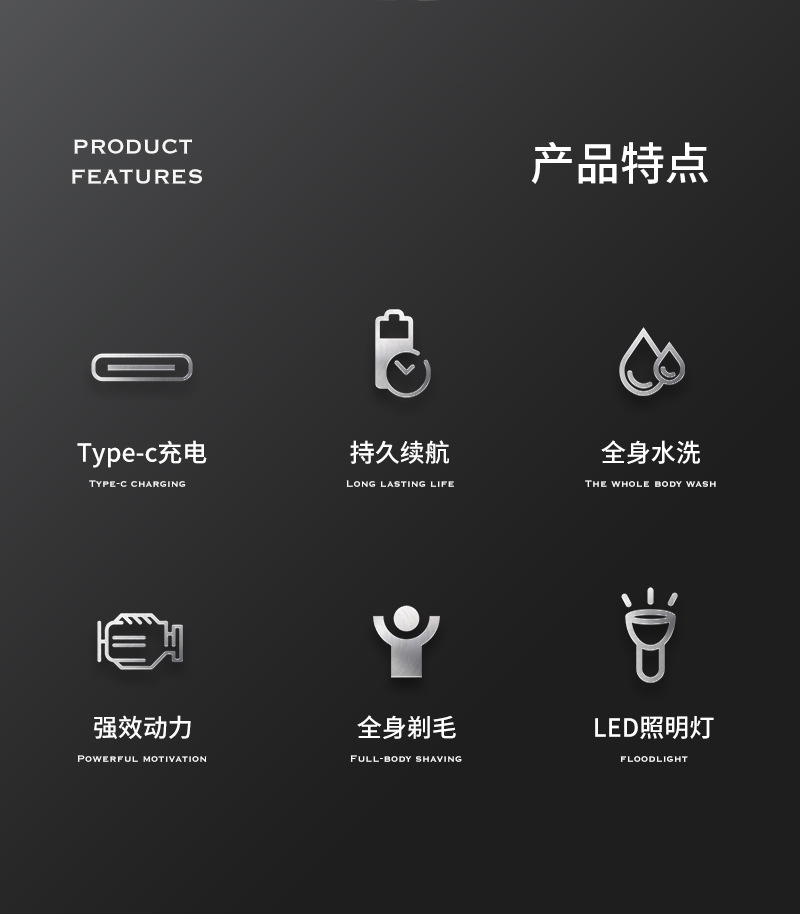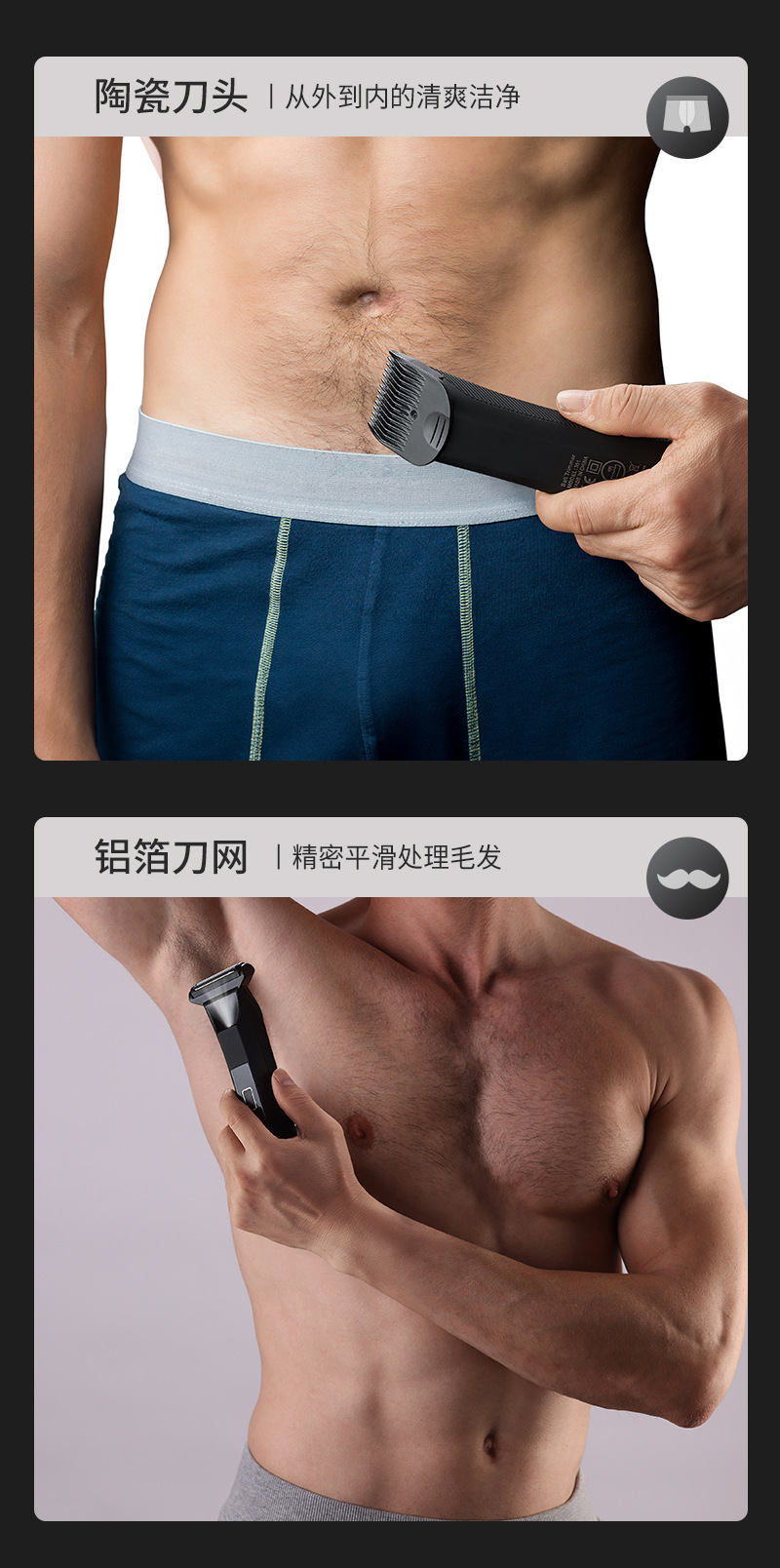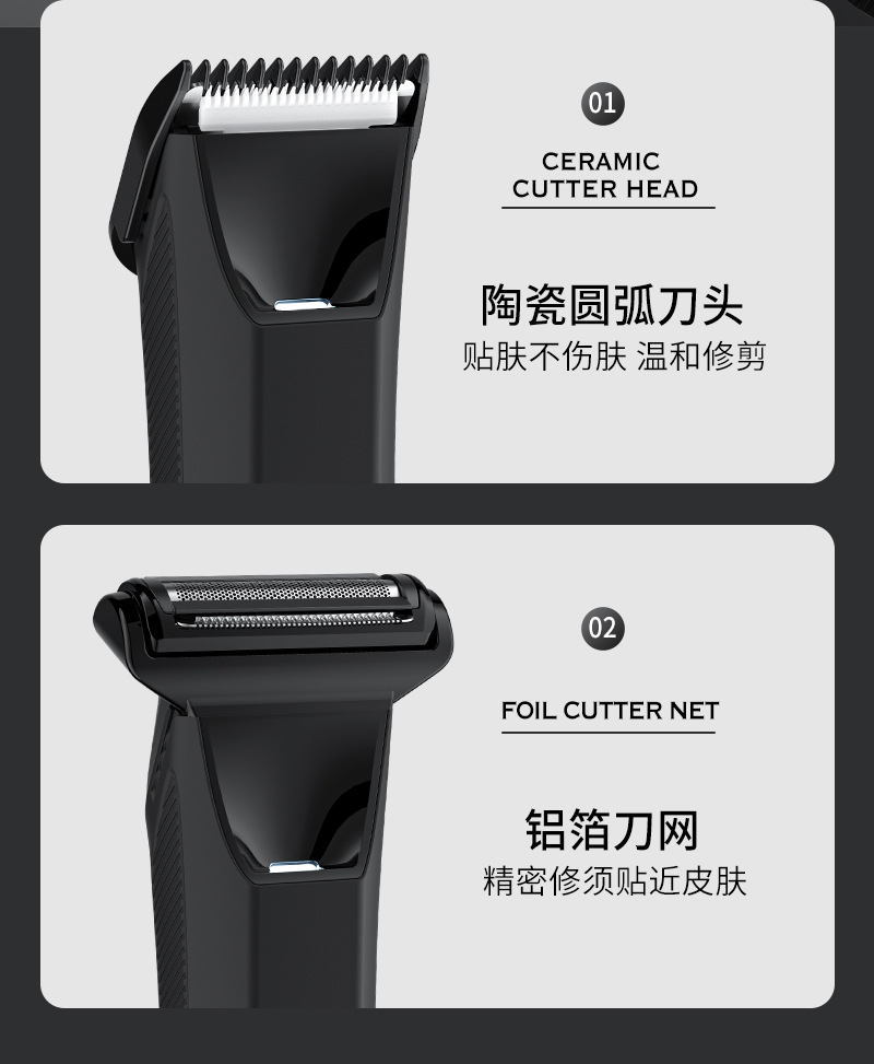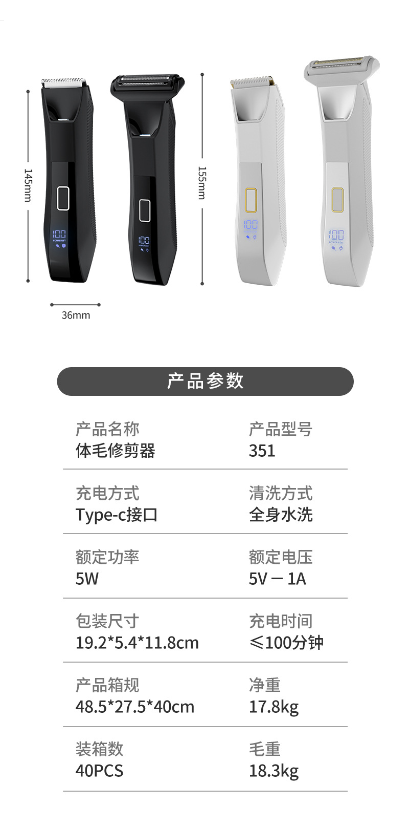 配件:剃毛刀头 刮毛刀头 调节卡尺 USB充电线 清洁刷
