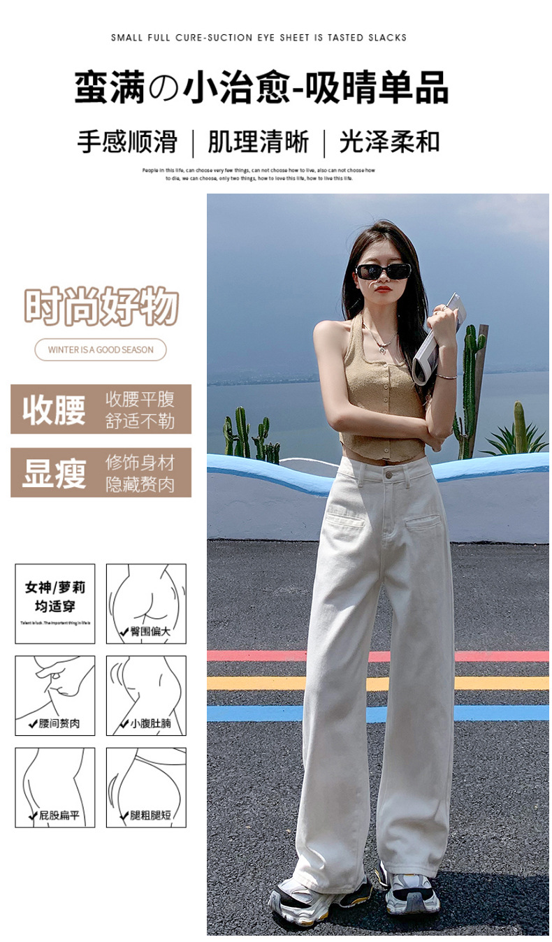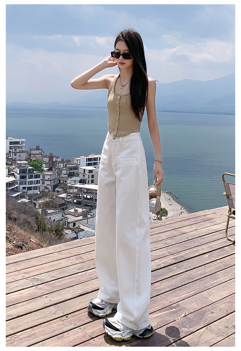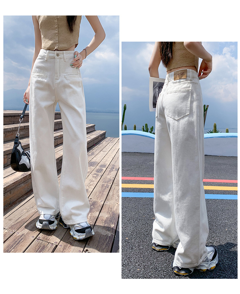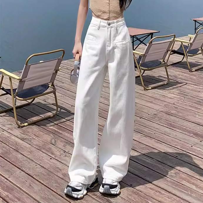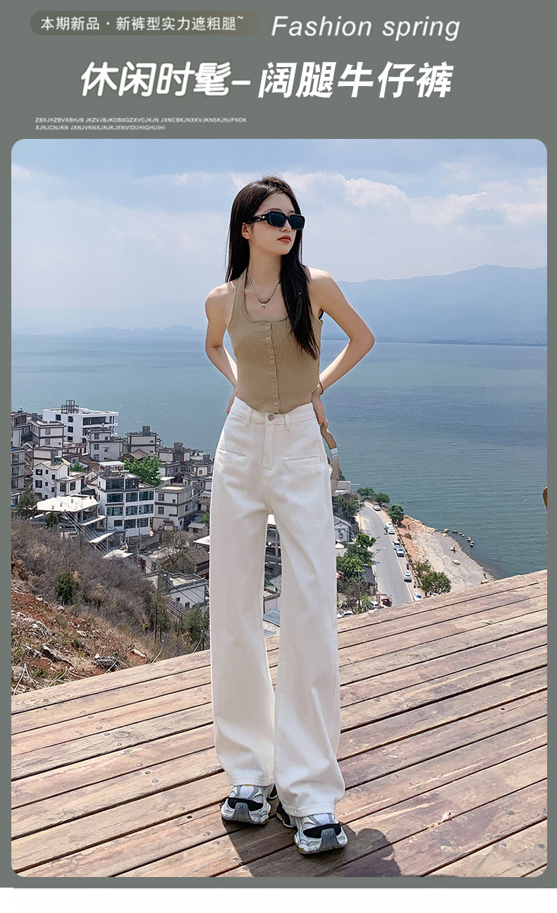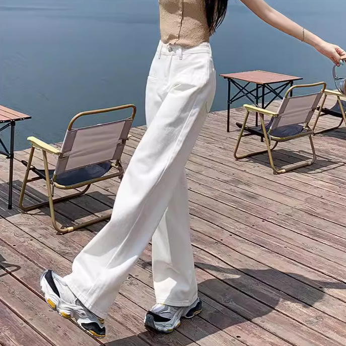 [진인] 여성용 화이트 슬리밍 와이드 레그 진, 봄 가을 신상 스트레이트 네일 버전 하이웨이스트 캐주얼 바닥 기장 팬츠