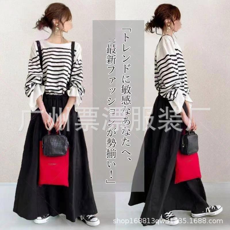 국경 간 뜨거운 세트 여자 2024 년 여름 새로운 라운드 넥 스트라이프 긴 소매 탑 슬립 스커트 세트