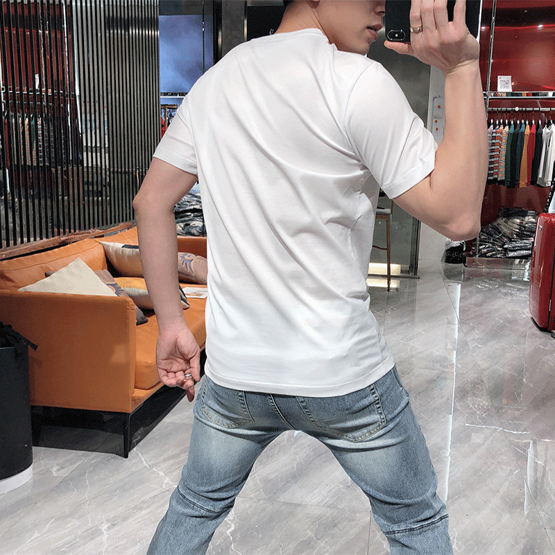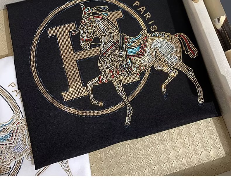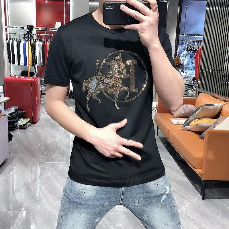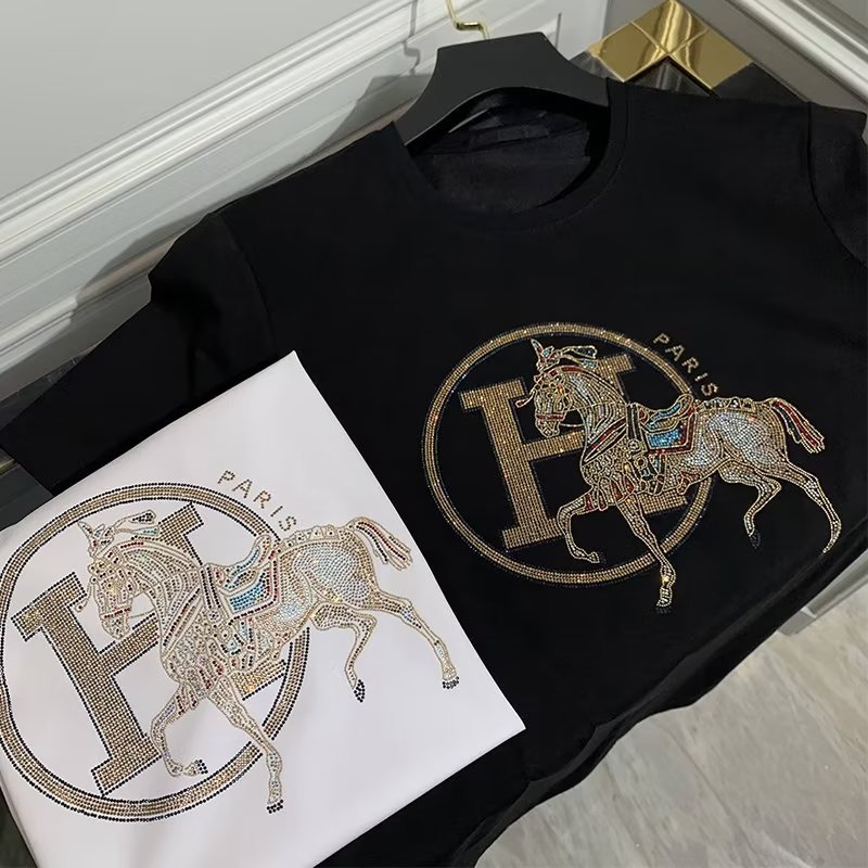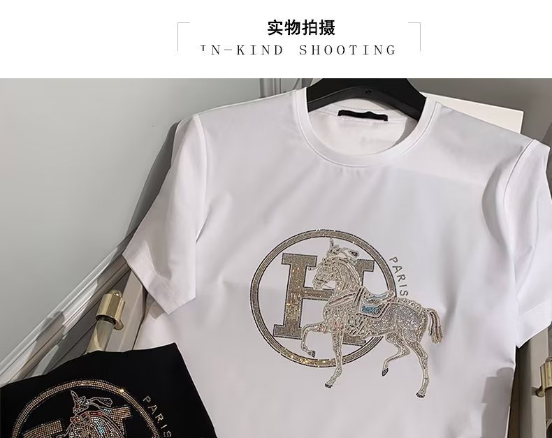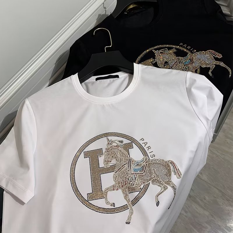 2024 여름 새로운 유럽 역 반팔 남성 티셔츠 핫 드릴링 골드 H 말 얇은 쿨 핫 드릴링 코튼 로우 키 럭셔리
